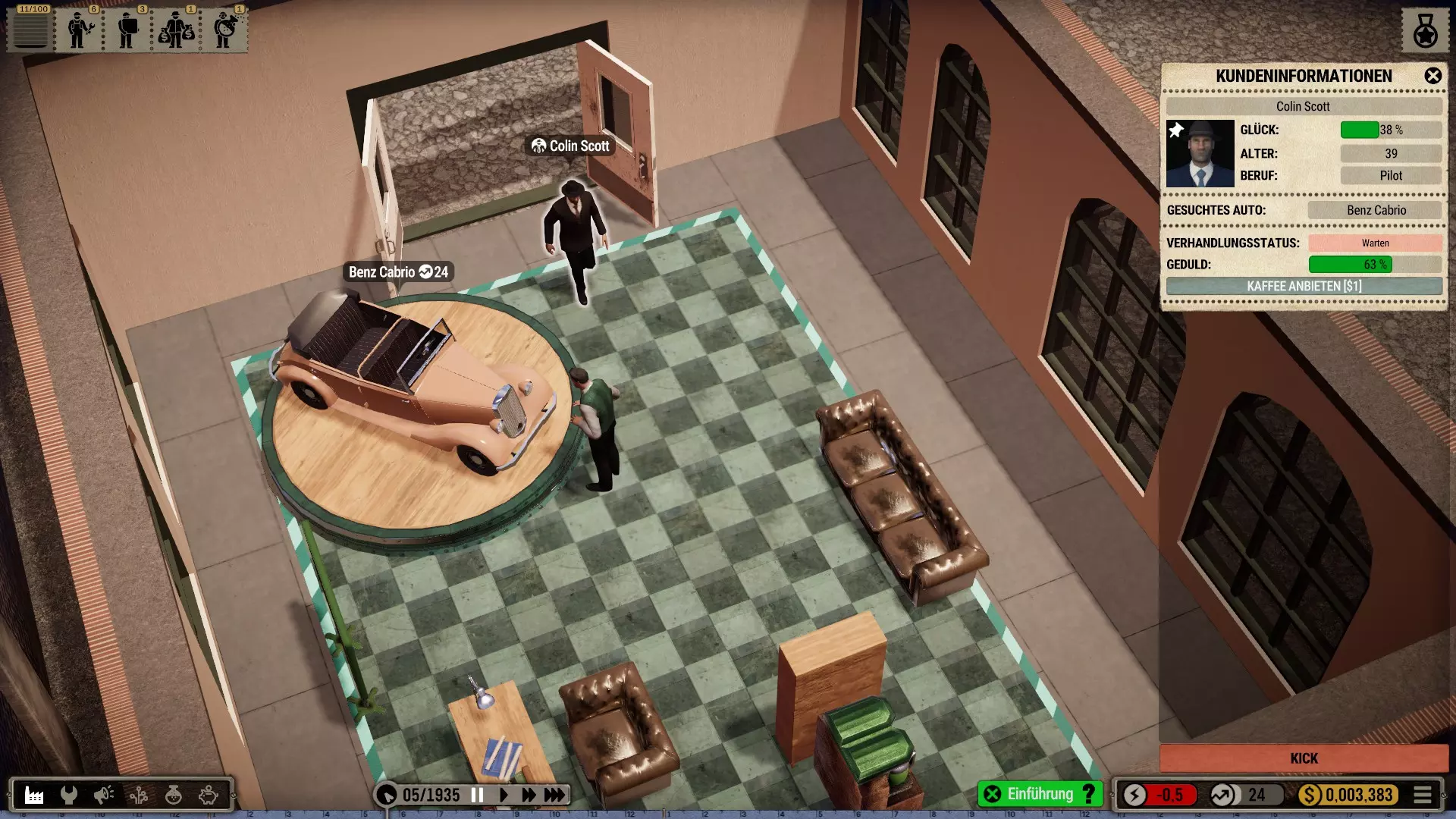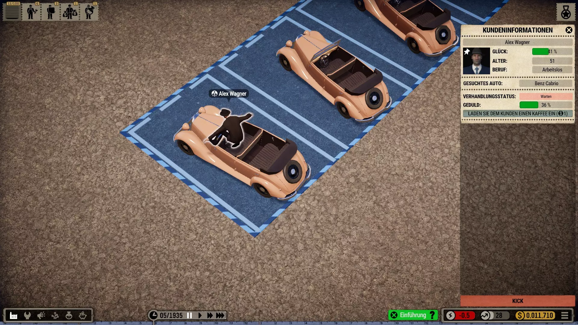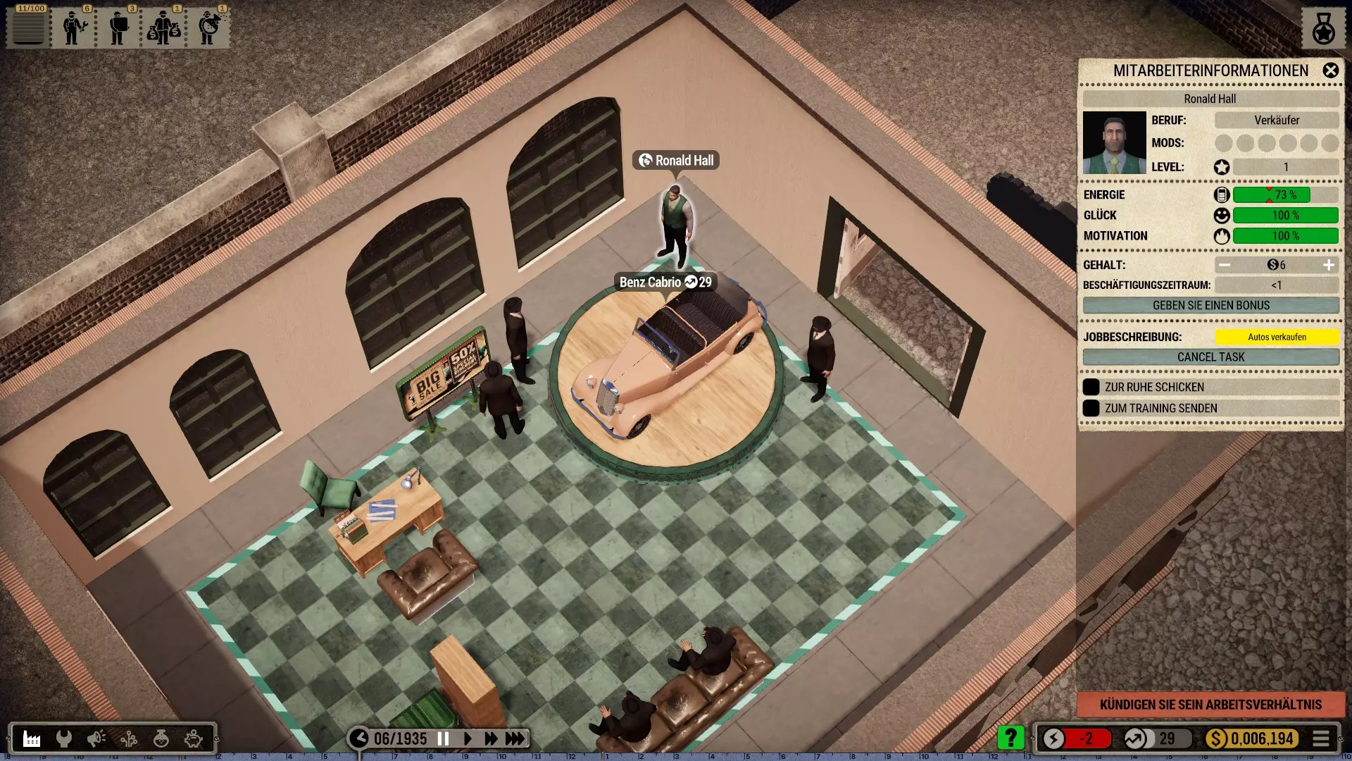 罗纳德其实是想卖车的。顾客们已经等了好一阵子了。但不知怎么的,他陷入了白日梦中。 加载存档后偶尔会出现bug。快速修复方法:退出任务,让他去休息或训练,必要时再次退出任务——之后他就能正常工作了。