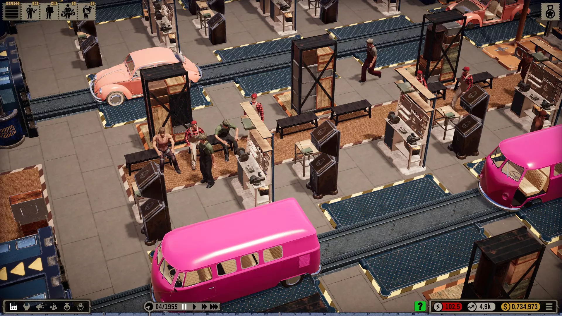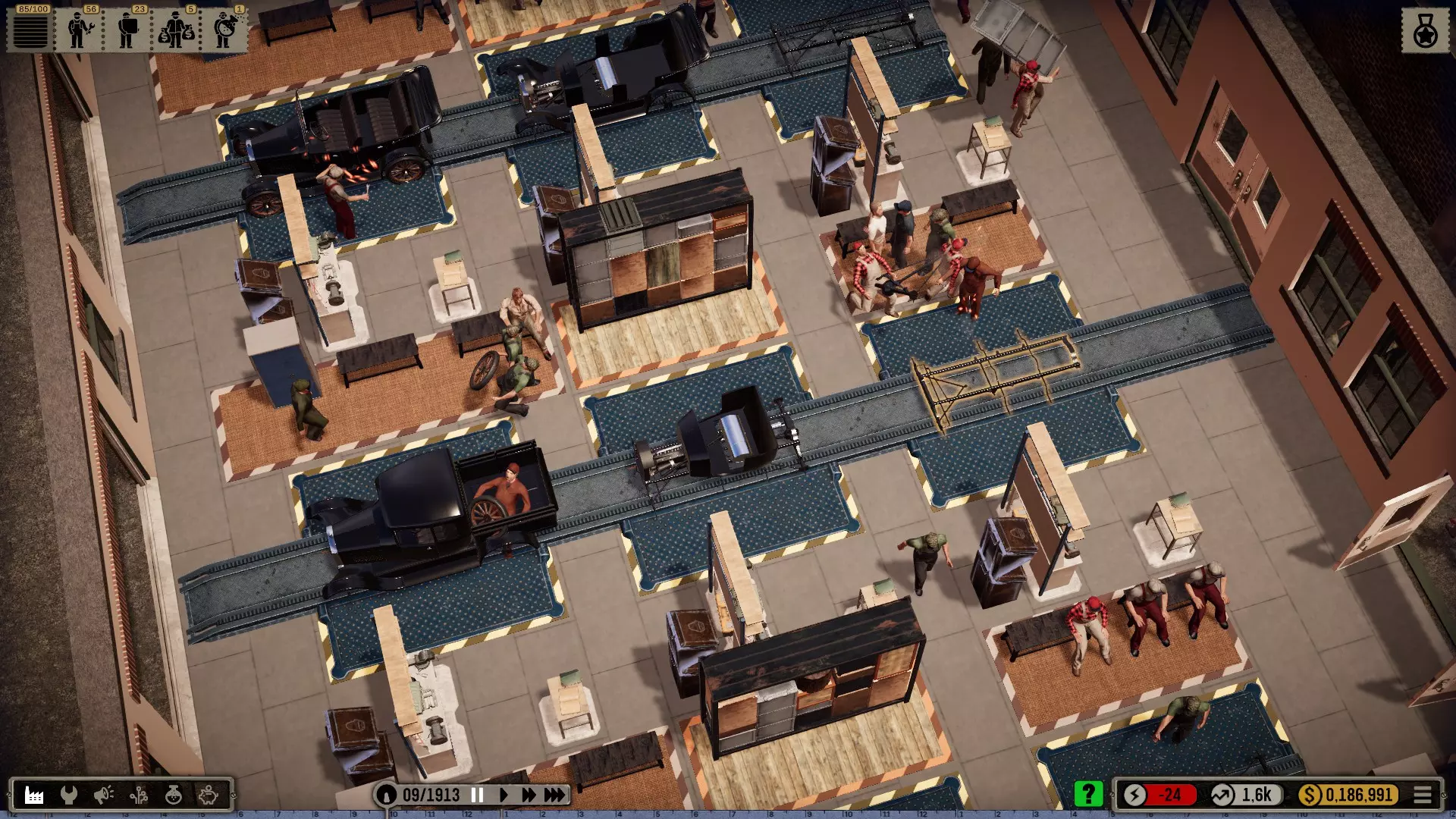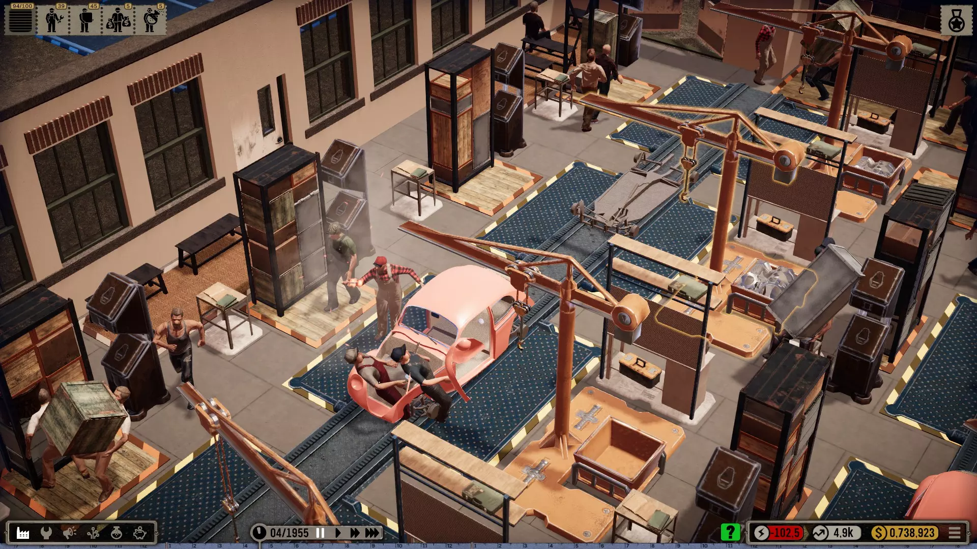 机器人:当你拆分相关订单时,可以让机械师和机器人在同一个工位协同工作。我喜欢让起重机来安装那些大型笨重部件,比如底盘、车轴、发动机、变速箱和车身。然后机械师只需添加小零件。不过这些简易机器人比强壮的工人要慢一些。所以其实效率并没有真的提高,但看起来更有趣也更真实。(可惜机器人只有一个非常小的仓库,必须不断补充物料。) 注意:根据科技树中的描述,机器人会导致质量下降,尤其是较简单的版本!(这在它们投入使用的最初几十年里,可能符合历史事实。)工位上的升级工具仅对机械师生效,因为机器人本身就是工具!