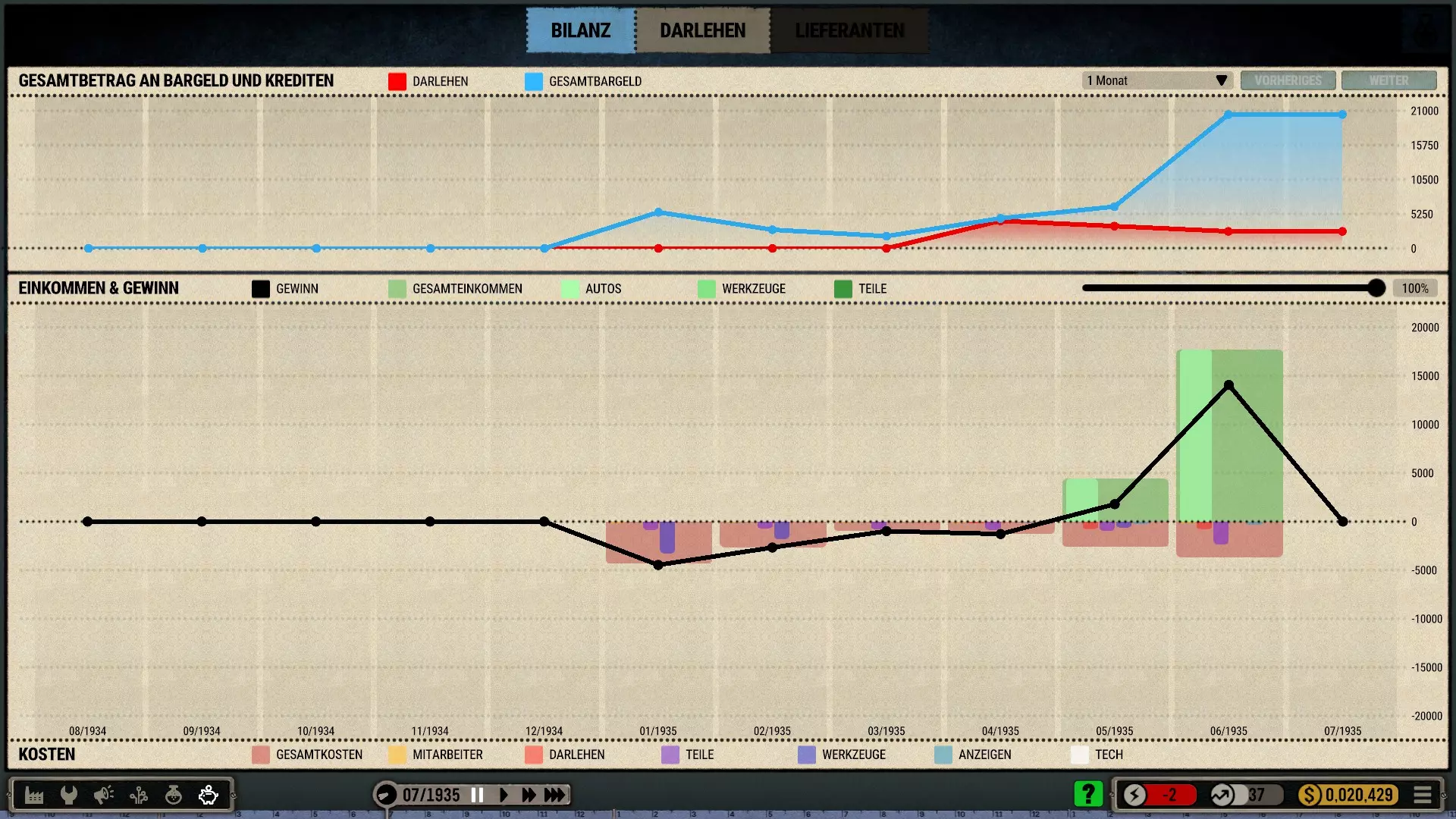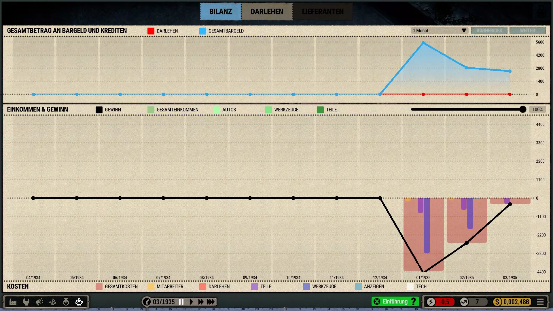 可用的财务数据相当粗略,但以图形方式呈现得很清晰。即使是加里也能轻易看出,高昂的材料成本加上零销售额,很快就会导致破产。另一方面,人员成本则微不足道。
