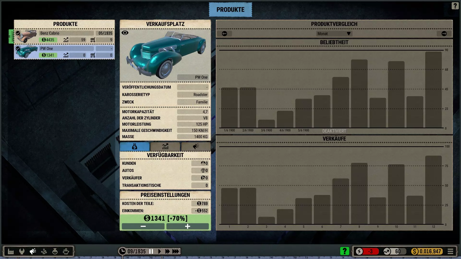 起始年份:起始年份越晚,初始车辆就越先进、越复杂。这会增加初期的难度:更现代的车型包含更多需要获取和组装的零件。因此,如果你只有单个工位和几名最多3级的员工,造车会花费更长时间。 不过,你能从首批销售中获得大量收入,因此可以尽早购买不同的技术。此外,2000点研究点足以解锁下一级别,因为研究点数总是从初始车型开始计算。 (图:最晚游戏起始年份为1960年,3名机械师每月生产1辆车。+400%的最高价格尚未生效,但在+300%的价格下,所有客户都会立即购买。)第一个月的销售结束后,我的账户资金已经超过了初始资本。 人事策略:按照我的玩法风格,一名3级研究员和1-2名销售人员在很长一段时间内就足够了(即使科技树尚未解锁),不过我会让他们慢慢提升等级,直到达到10级。至于机械师和运输员,等级并不是那么重要,至少在游戏初期是这样。