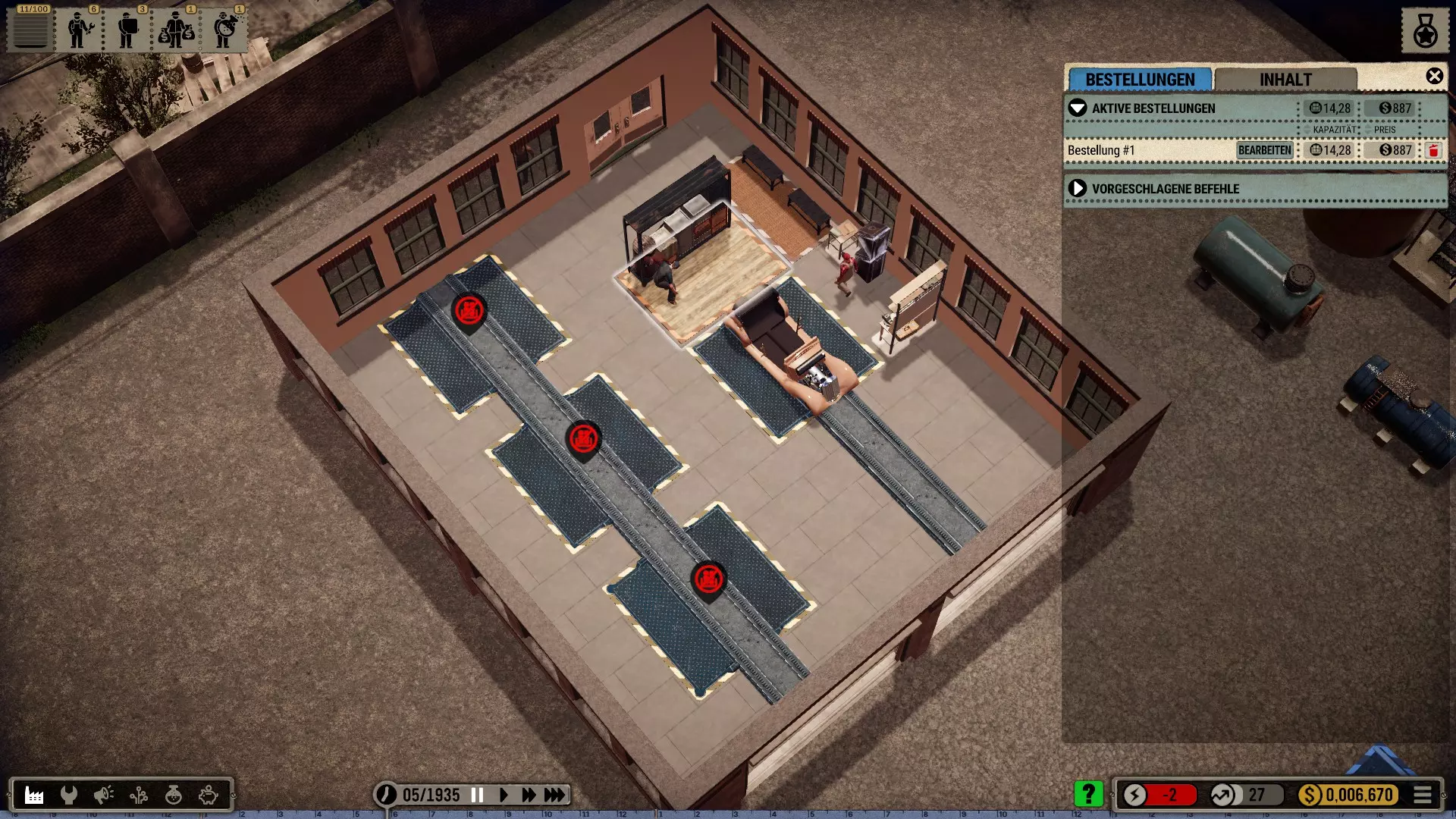 很快就发现,带有三个工位的新传送带生产速度要快得多,所以加里打算把利润投入到生产车间的扩建中,并且还要扩建右侧区域。 他把仓库移到了一个中心位置,同时取消了原来装配工位的旧订单。不过他也只能把原来的装配工位删掉了,因为那个工位无法移动。