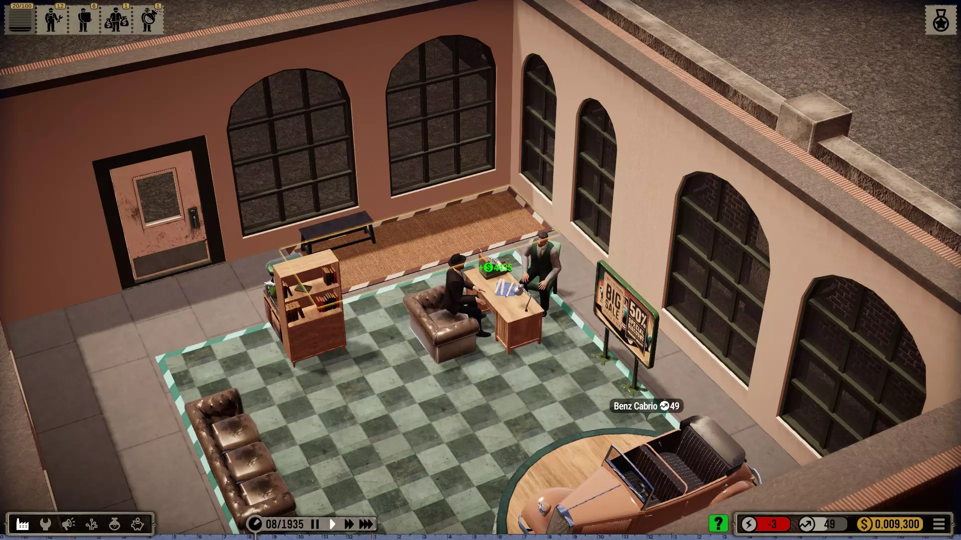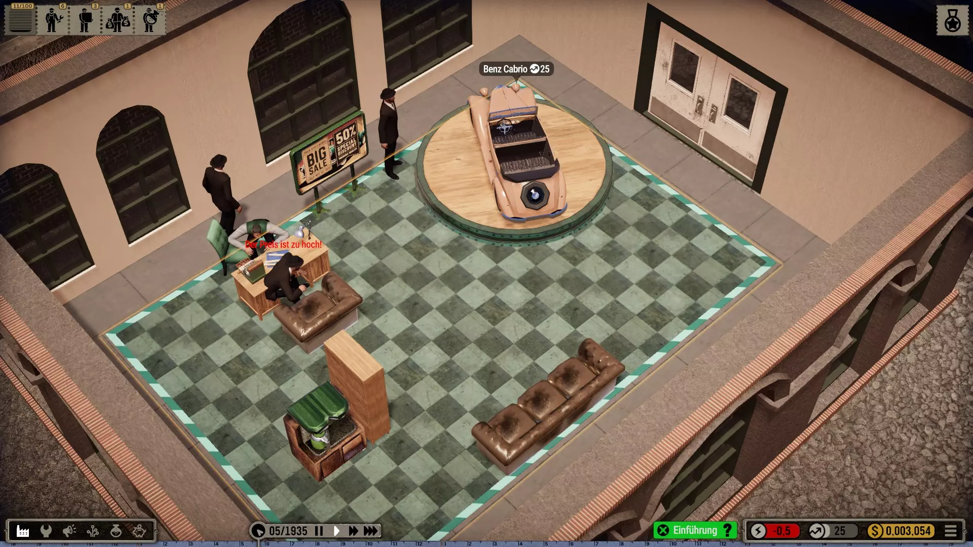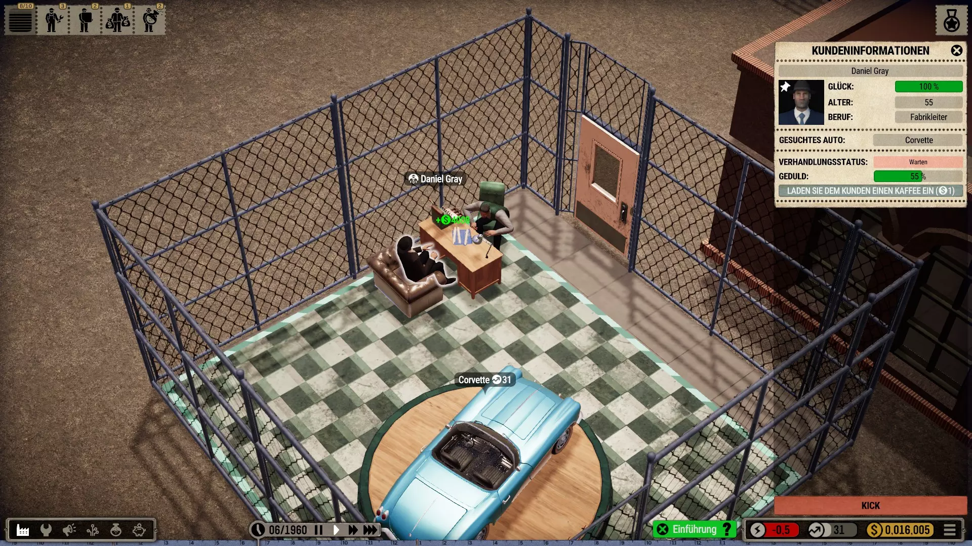 起始年份:起始年份越晚,初始汽车就越先进和复杂。这虽然会在一开始增加难度:较新的车型由更多零件组成,需要先采购这些零件然后进行组装。因此,如果只有单个工位和少数人员(而且这些人员的最高等级仅为3级),组装过程会花费更长时间。 不过,首次销售就能带来高额收入,这样你可以尽早解锁各种技术。此外,2000个研究点就足够用于下一阶段,因为计数总是从初始车型开始。 (图:最晚可能的游戏开始时间为1960年,3名机械师每月生产1辆汽车。)最高价格加成400%尚未生效,但加成300%时所有客户立即纷纷购买。第一个销售月结束后,我的账户余额就超过了初始资金。 人事策略:按照我的玩法,即使未解锁科技树,一名3级研究员以及1-2名销售员也能长期够用,不过我会慢慢将销售员的等级通过他们的收音机提升到10级。至于机械师和搬运工,他们的等级至少在初期没那么重要。