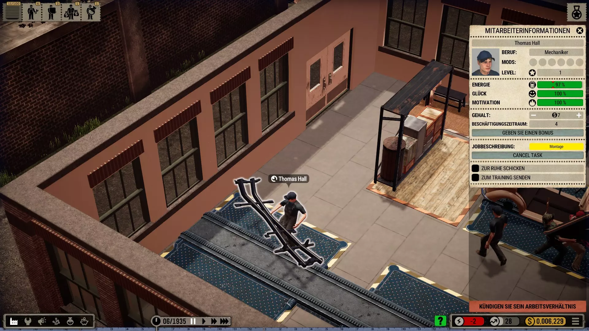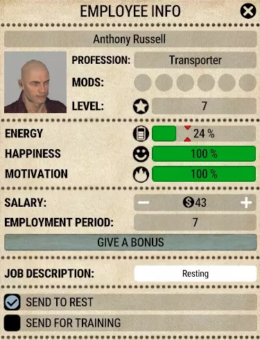 由于他非常厌恶冲突,且自身优势并不在财务方面,所以他直接录用了首批最优秀的申请者,并按照他们期望的薪资支付报酬。他自己的薪资也仅定为16美元,尽管他知道这会在一定程度上削弱自己的积极性。 他恰好达到了3级,这意味着游戏难度会略有提升,因为每级薪资低于6美元的员工,其积极性会下降得更快。