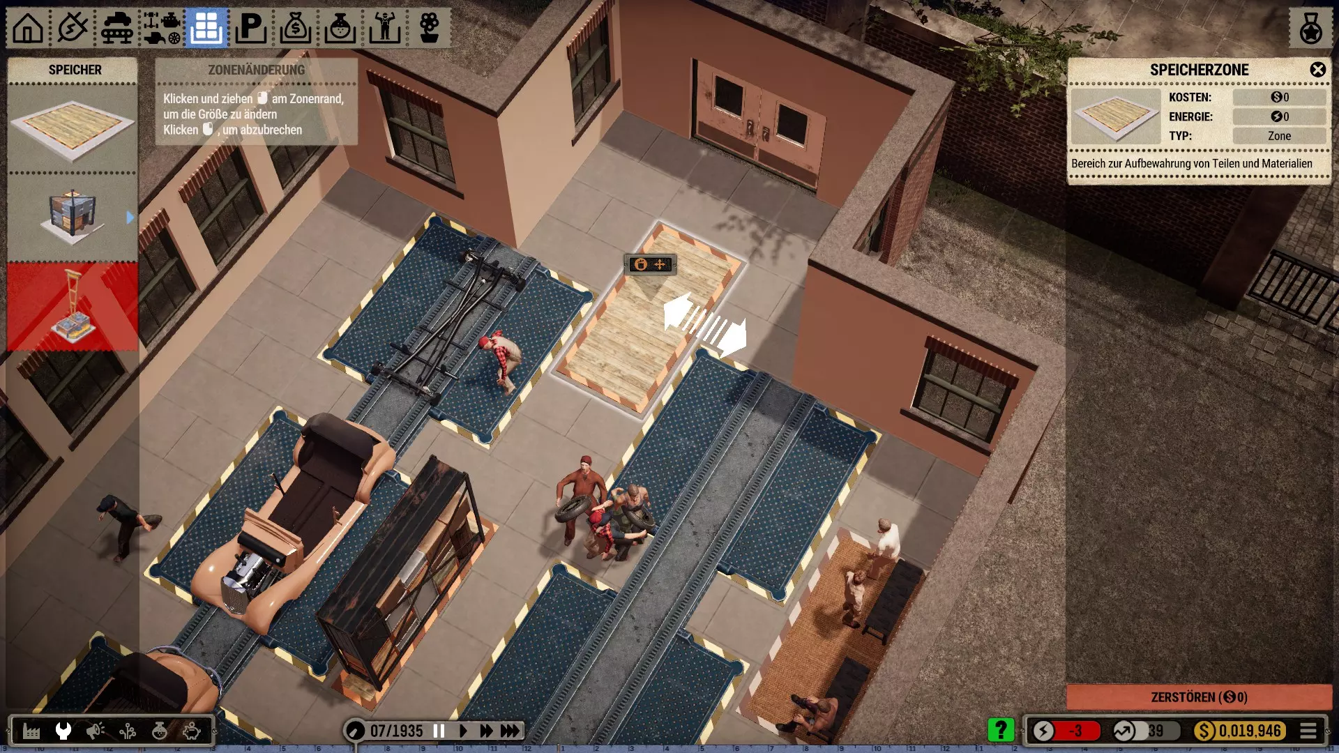 很快发现,这条拥有三个工位的新装配线生产速度要快得多,所以加里打算把利润投入到扩建生产车间上,并且还要扩建右侧区域。他把商店搬到了中心位置,同时取消了最初装配工位的旧订单。但遗憾的是,他还是得把原来的装配工位删掉,因为它无法移动。