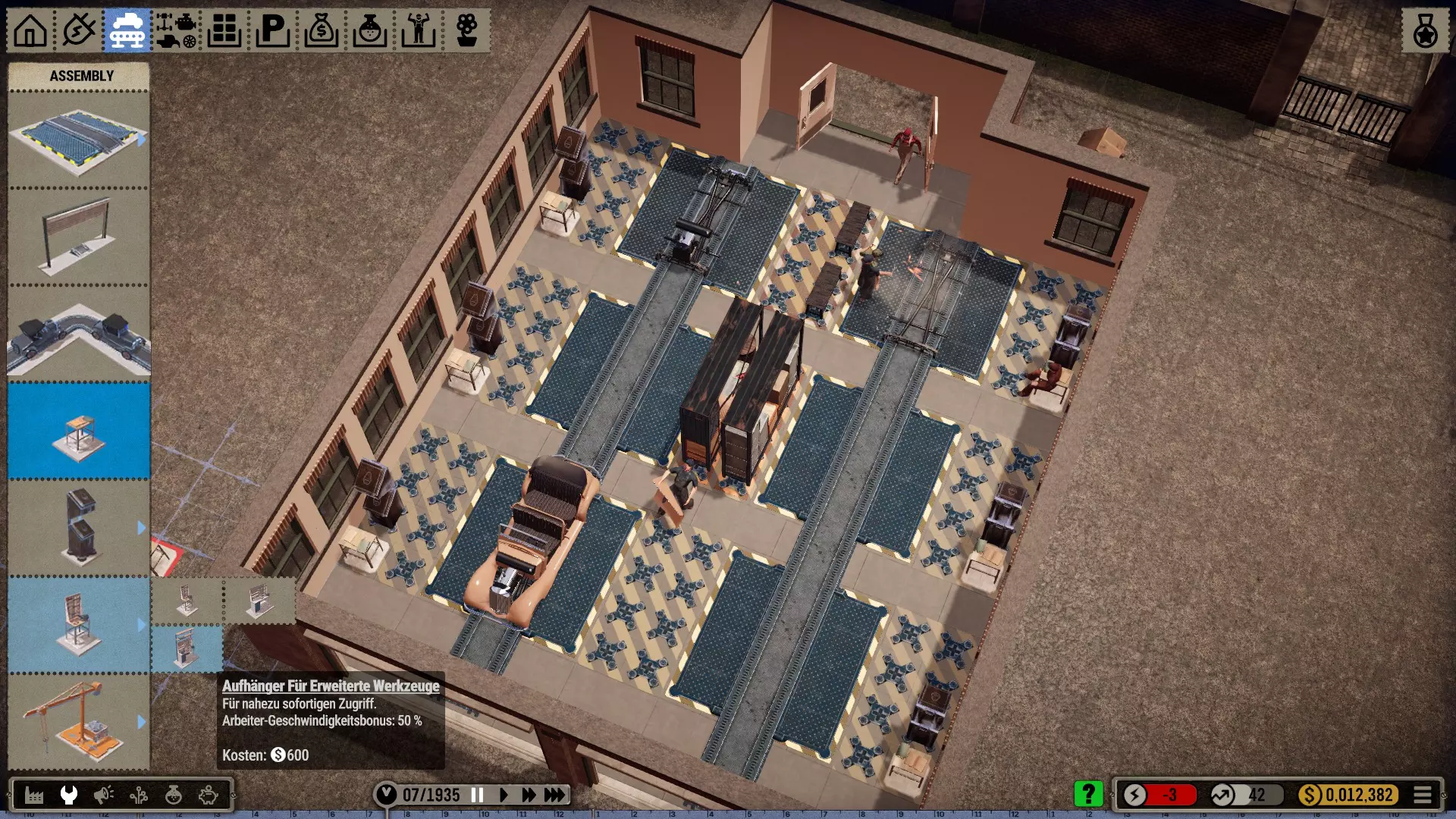 加里发现,他忘记准备提升质量、工人精力和工作速度的工具了。当然,他会选用每个类别中现有的最佳版本。每个工作站只需配备各类型工具中的一种即可,因为在同一工作站上放置多个同类型工具是没有效果的。不过,据我对开发者直播内容的理解,如果将所有工作站的工具提升效果累加起来,就能在生产线上实现最大可能的优化效果。