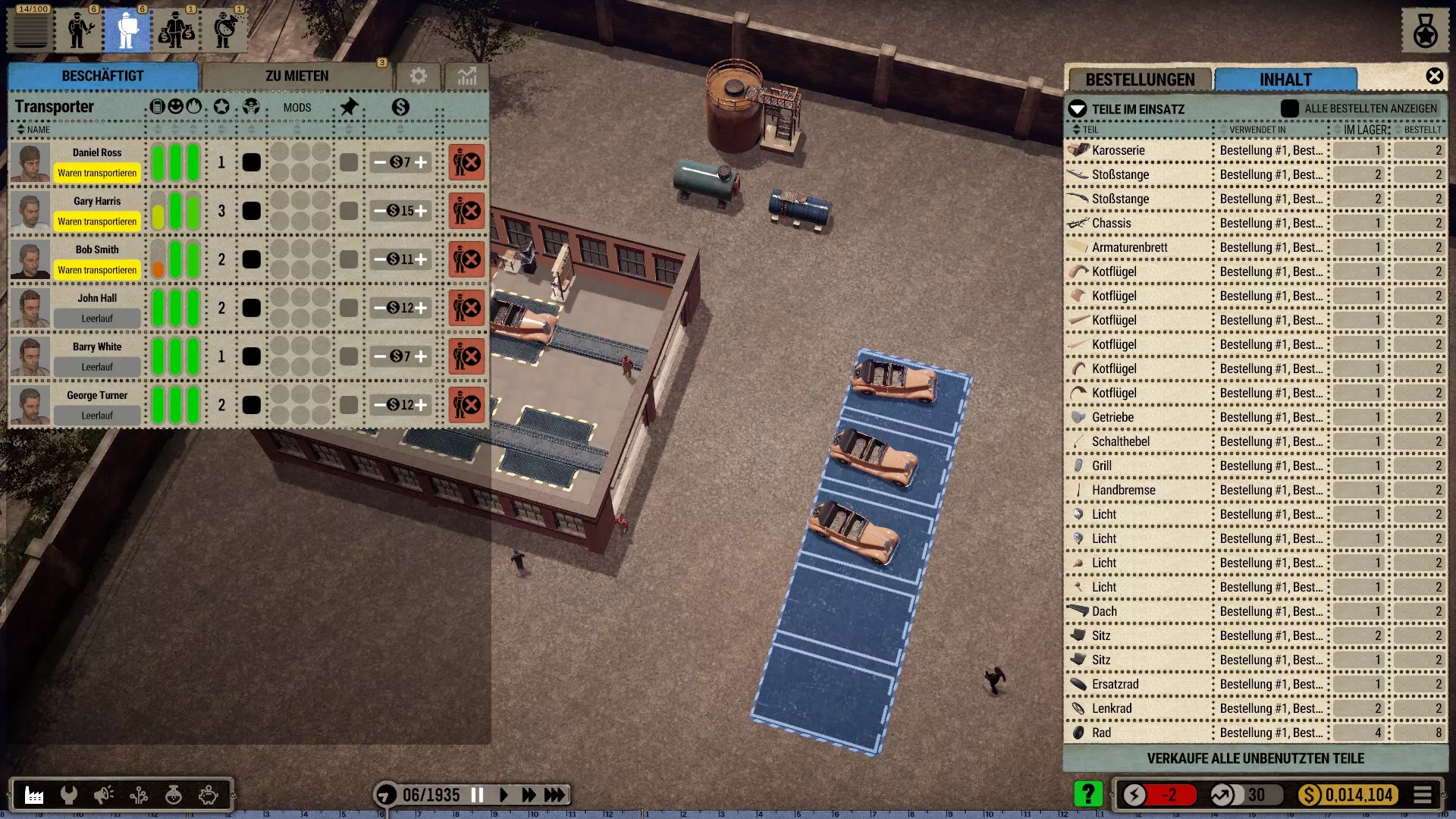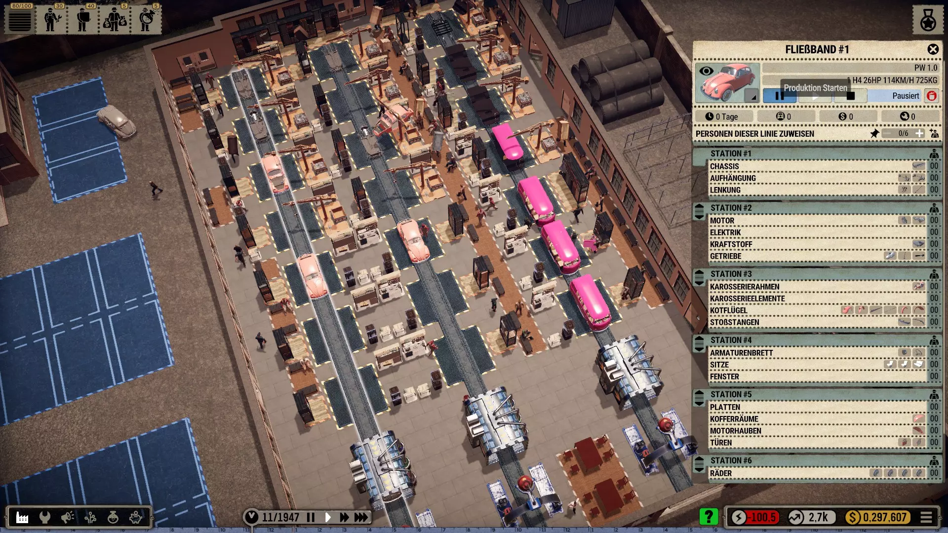 自1.0.2版本更新后,停车场新增了多种筛选选项,并且可以在供应商和流水线站点的小型仓库之间设置具有高零件库存的中间仓库。这样可以进一步优化流程。具体效果如何,我还需要亲自尝试。 也就是负责停放汽车的新人员。希望这能减轻运输工的负担。 总的来说,游戏设计中的许多细节比初看时要周到得多。我也是在后来仔细观察时才发现的。 祝游戏愉快!