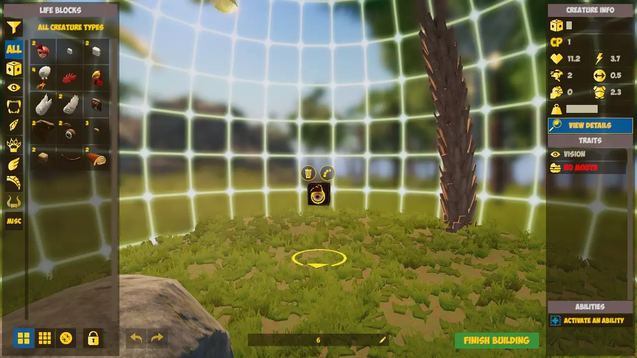 生物培育师 培育3个生物 选择你的任意生物,使用生命塑造者的构建道具对其进行编辑。删除它们所有的部件以获得一颗心脏。保存并编辑生物。现在创建一个单个立方体道具生物,编辑名称并保存。