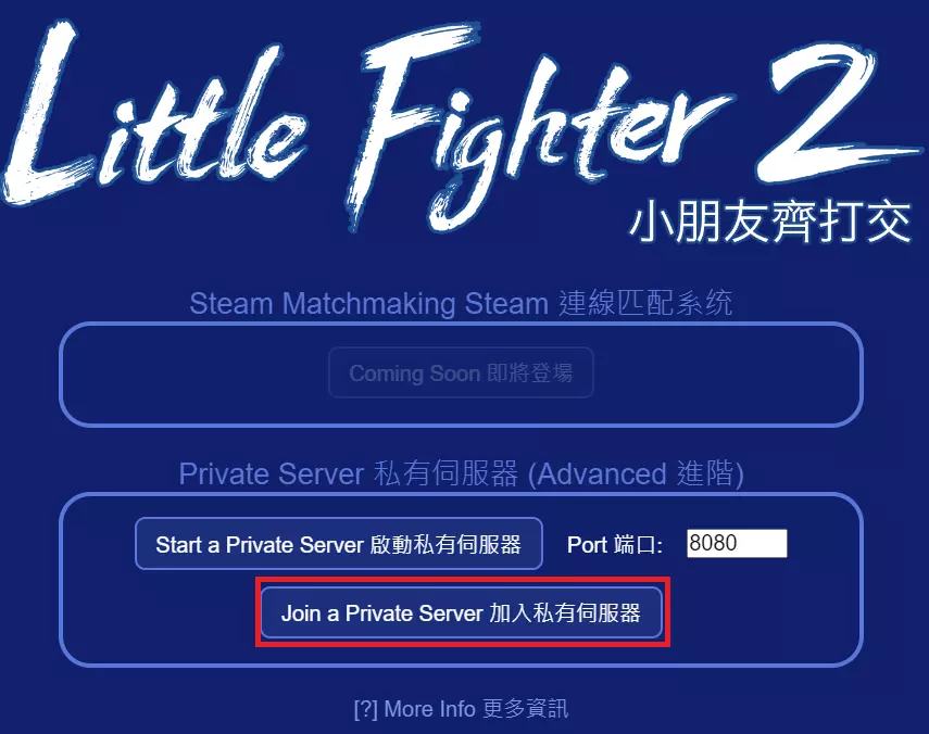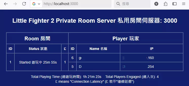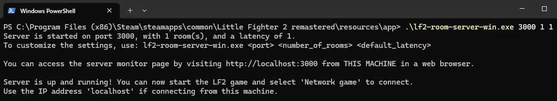 4.输入指令 . lf2-room-server-win.exe <服务器使用端口号> <服务器房间数量> <默认延迟帧数> ※例: . lf2-room-server-win.exe 3000 1 1 属性 说明 服务器使用端口号 网络连接所需的入口号码,区间为 0~65535 ※请避开使用0~1023,此区间通常为电脑系统使用 服务器房间数量 服务器开设的房间数量,同一房间号的玩家才可一起游玩 若仅与朋友游玩,设置1即可 默认延迟帧数 为避免玩家连接间延迟而加入的延迟数,经测试若玩家均在台湾可使用1 ※此为默认值,加入房间后仍可手动修改