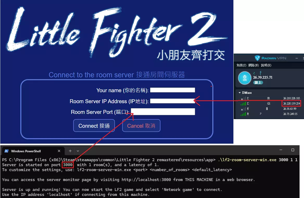 3.输入连接信息 栏位 说明 你的名称 输入你的玩家名称,仅可输入英文或数字 IP地址 输入在Radmin VPN虚拟服务器中,执行前一章节,启动游戏服务器的使用者的虚拟IP (例如26.220.139.254) ※若游戏服务器是自己启动的,此栏位可以输入localhost 端口 埠号的意思。输入前一章节中,启动游戏服务器的使用者设定的埠号 (例如3000)