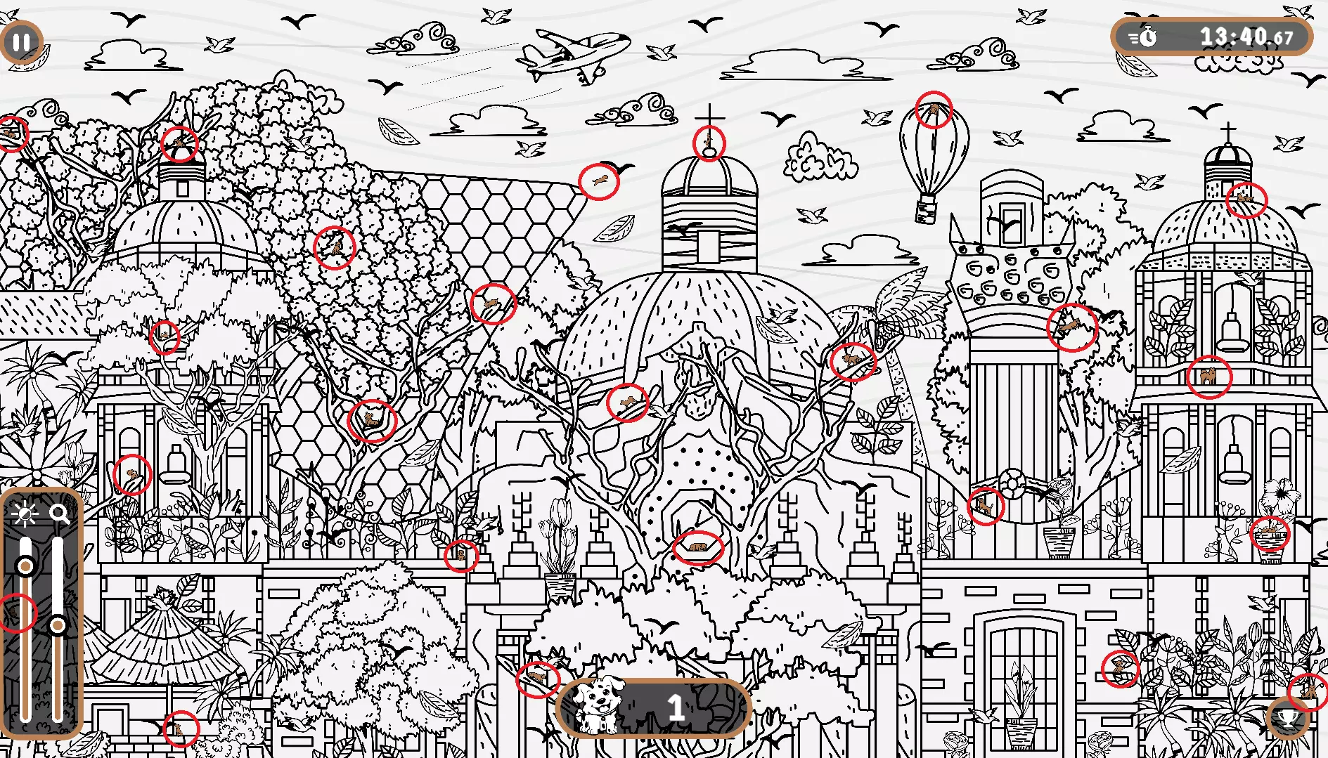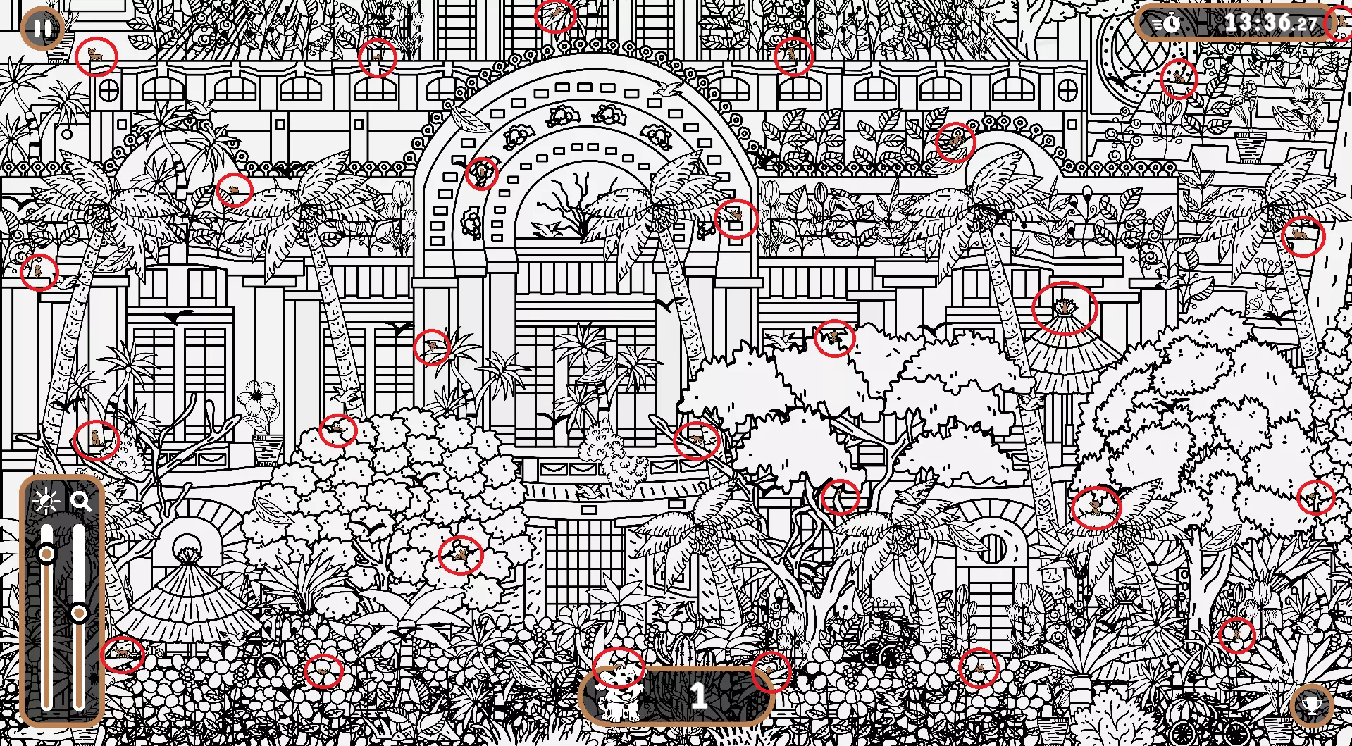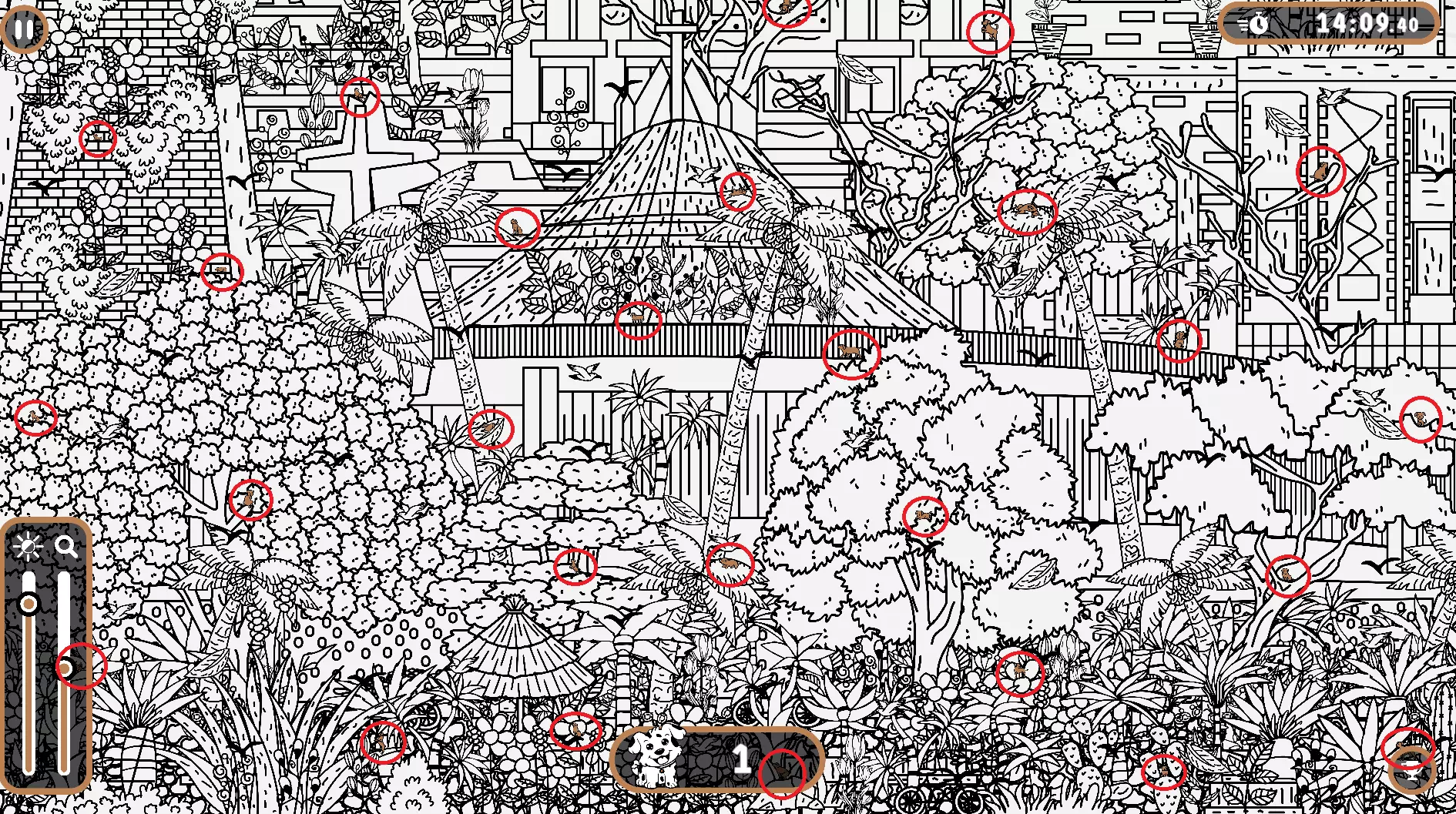 大家好, 本指南旨在帮助大家找到所有隐藏的狗狗。有些狗狗很难被发现,所以如果你在寻找遗漏的狗狗以完成游戏,欢迎使用本指南或参考一下。保证能达成100%成就! 祝玩得开心! 狗狗的所有位置 注意: 1) 最后一只狗狗在绿色圆圈内。 2) 请注意,有些狗狗隐藏在用户界面和计数条后面。它们也被圈出来了。 左侧