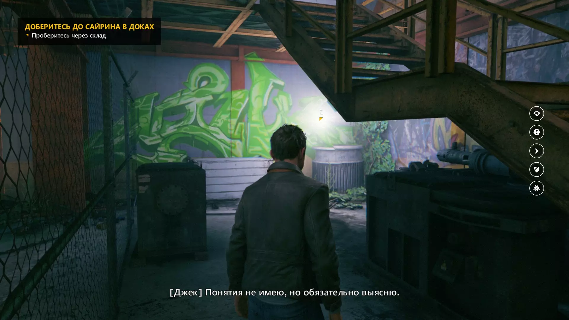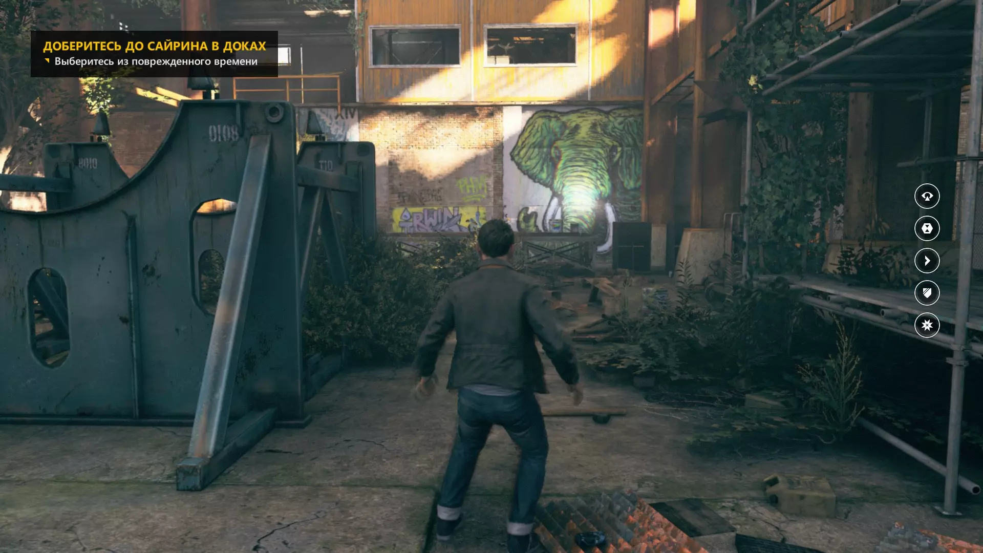 17. 离开实验室后,注意到装载机和倒下的树木,走到机库中央,其中一面墙上会有大象涂鸦。走近并开启时间视觉,就能看到时间源。