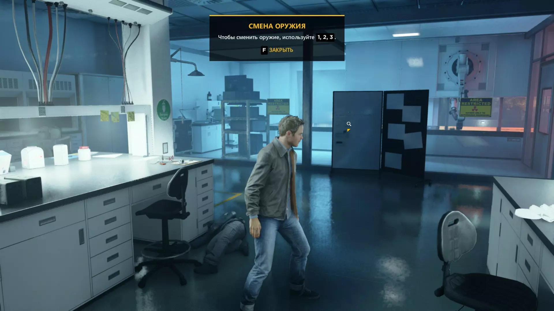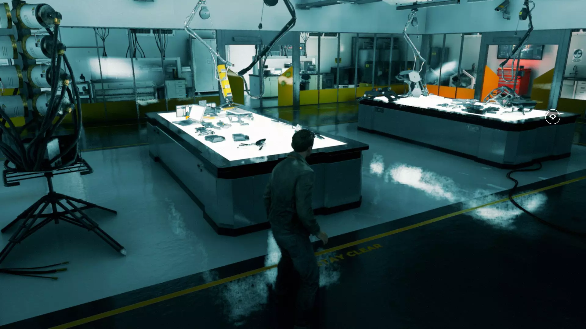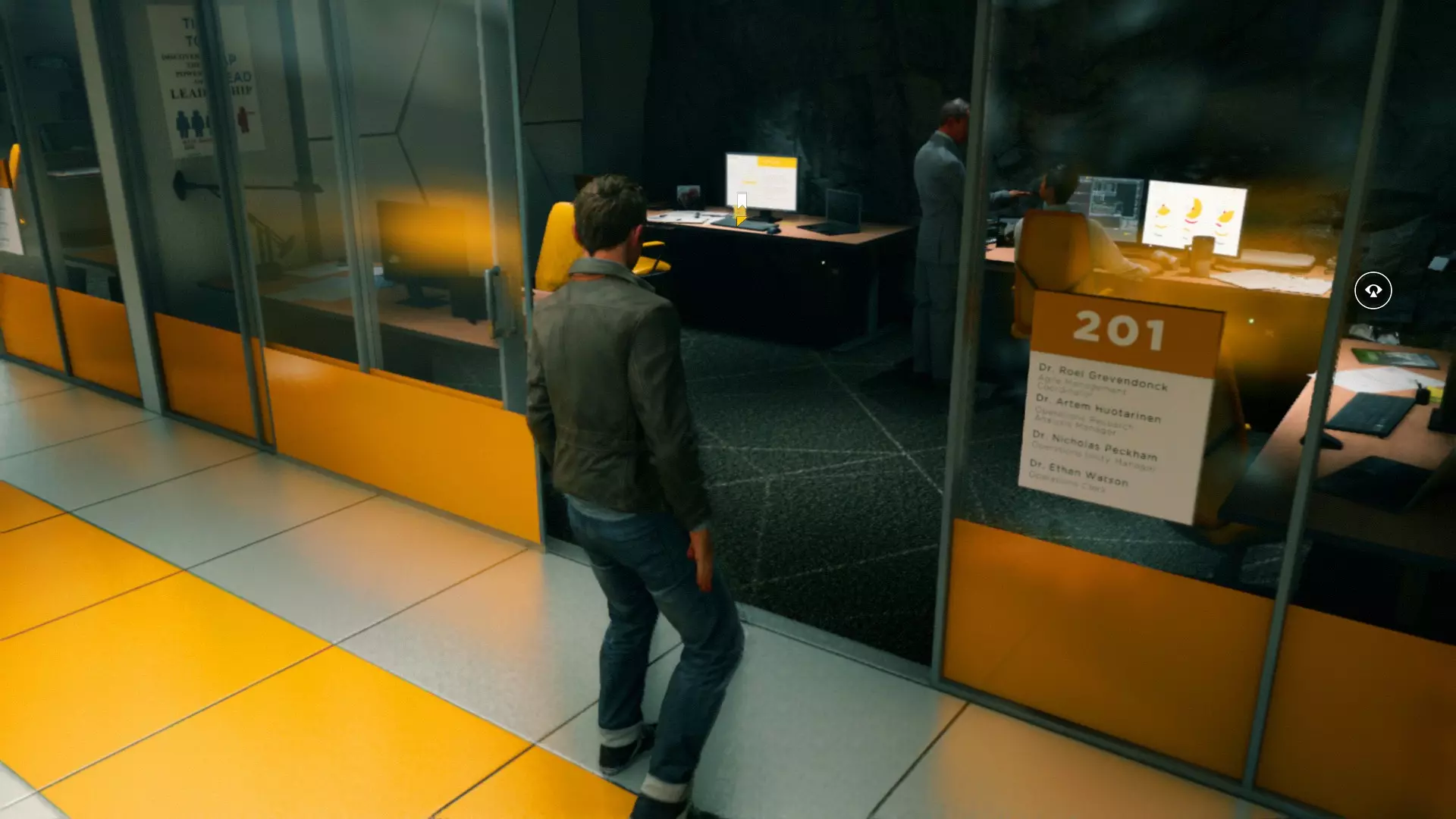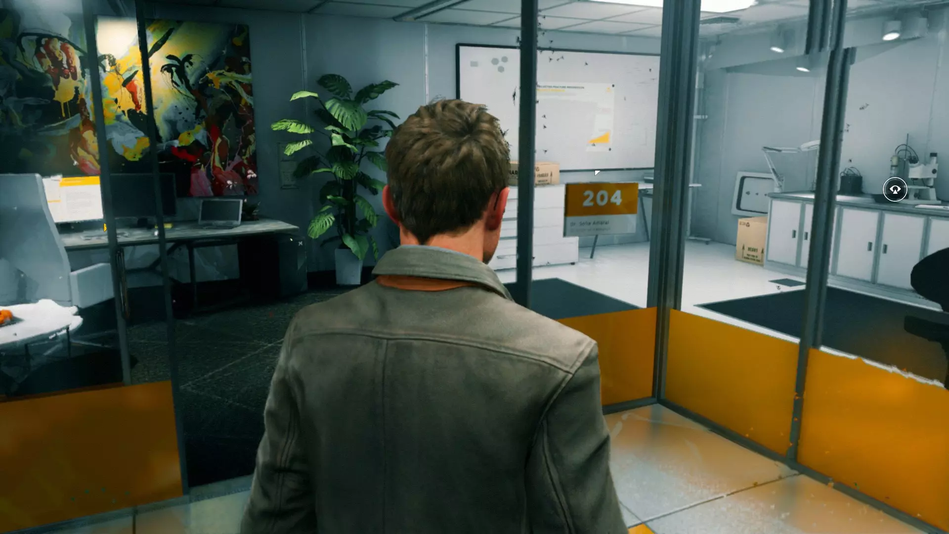 2. 打开黄色大门后,你需要用枪击倒几名保安。然后走到房间右侧、玻璃实验室旁边的白色板子处。