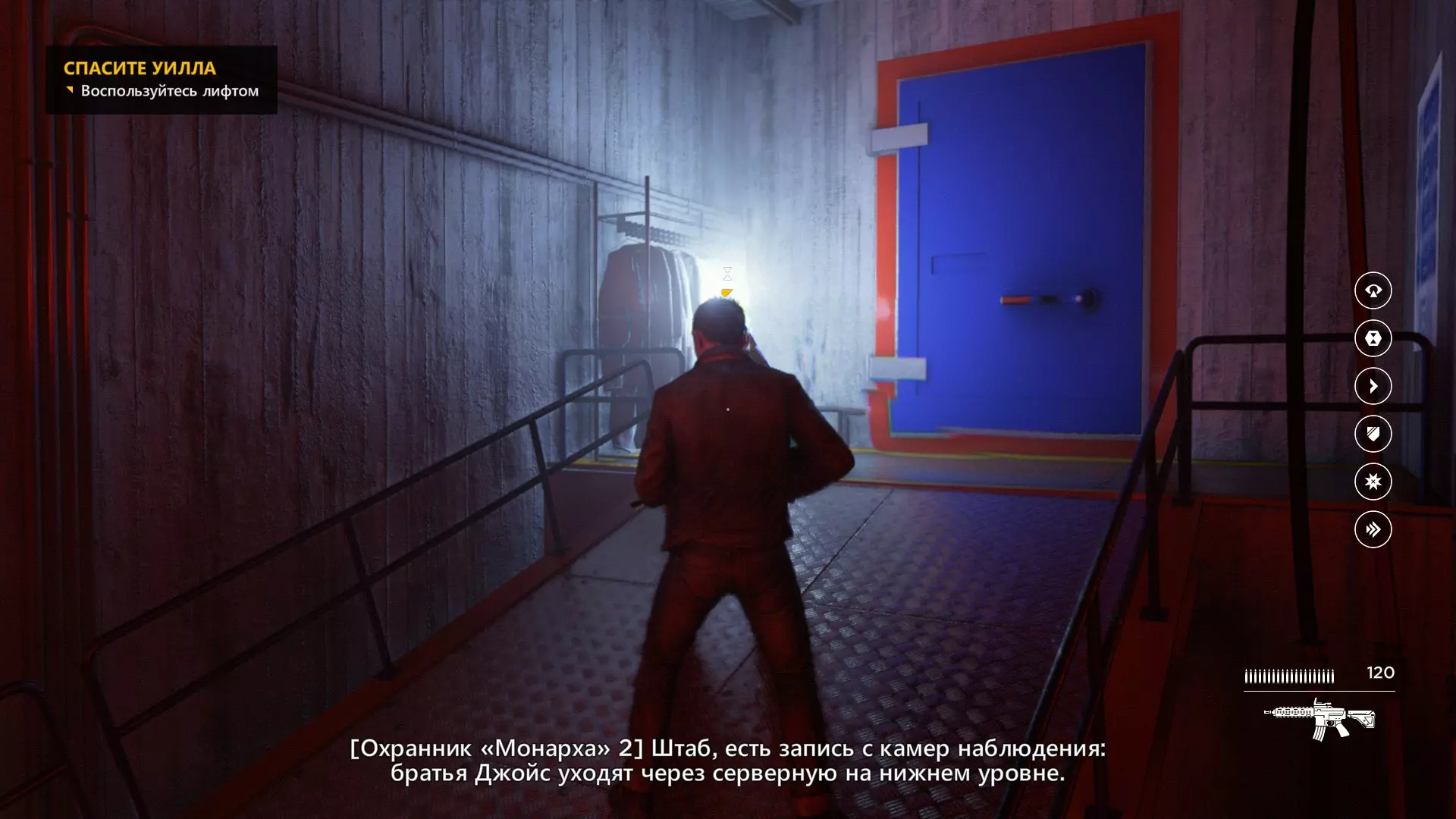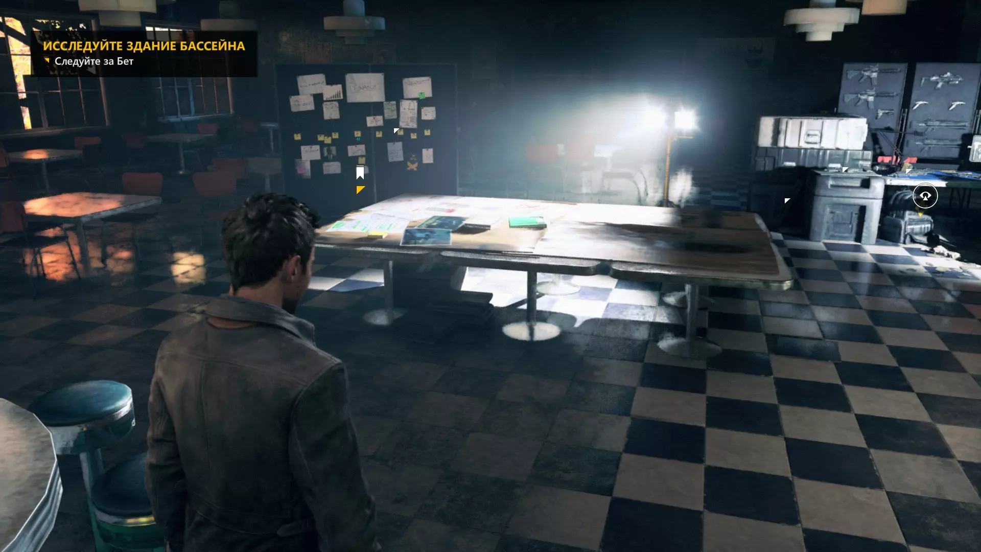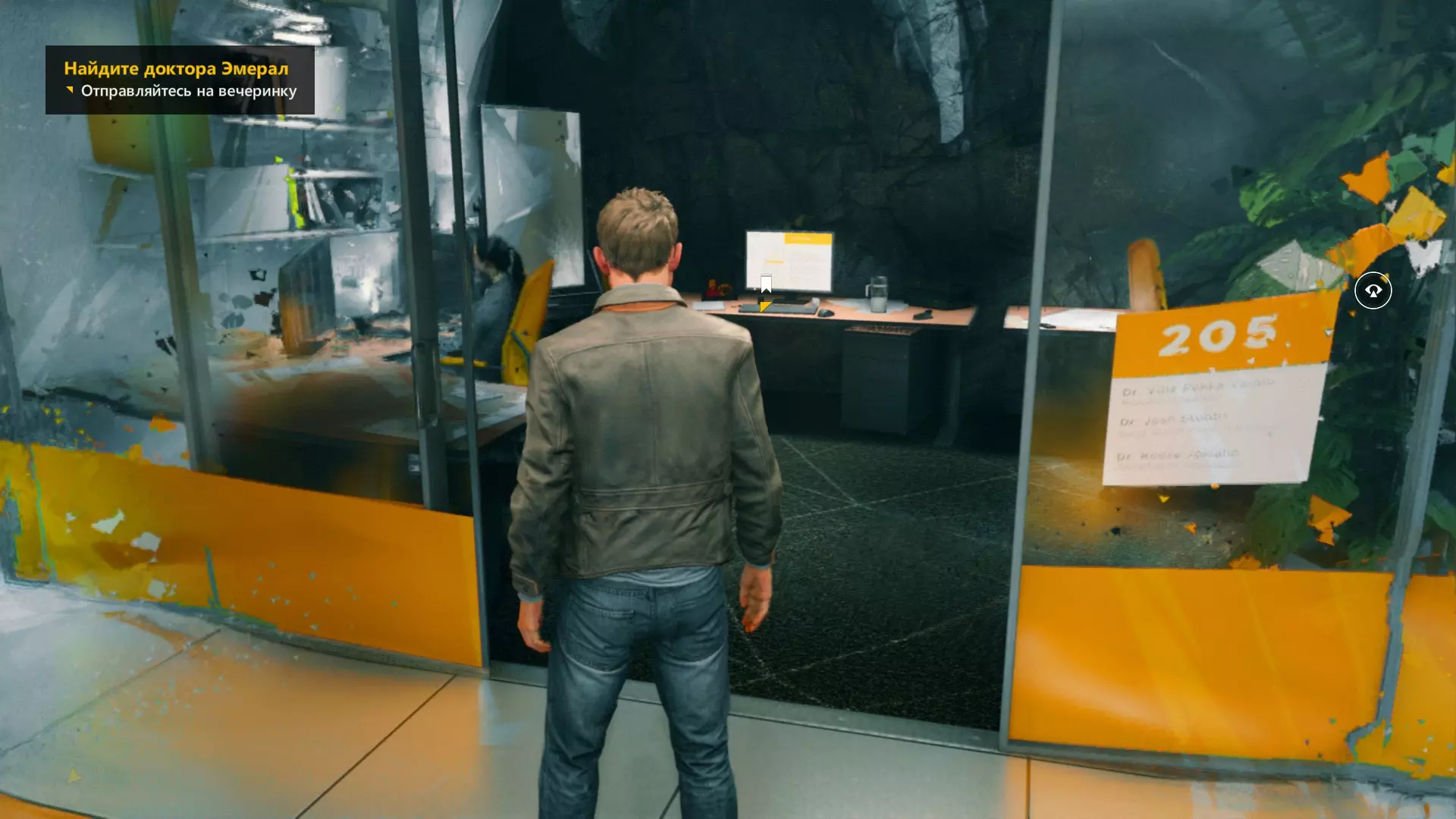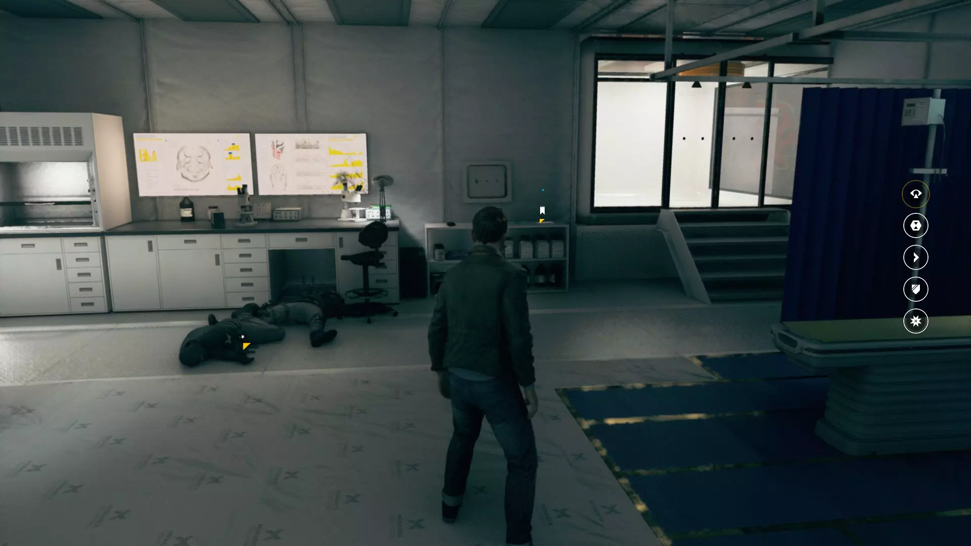 2. 打开黄色大门后,你需要用枪击倒几名保安。然后走到房间右侧、玻璃实验室旁边的白色板子处。