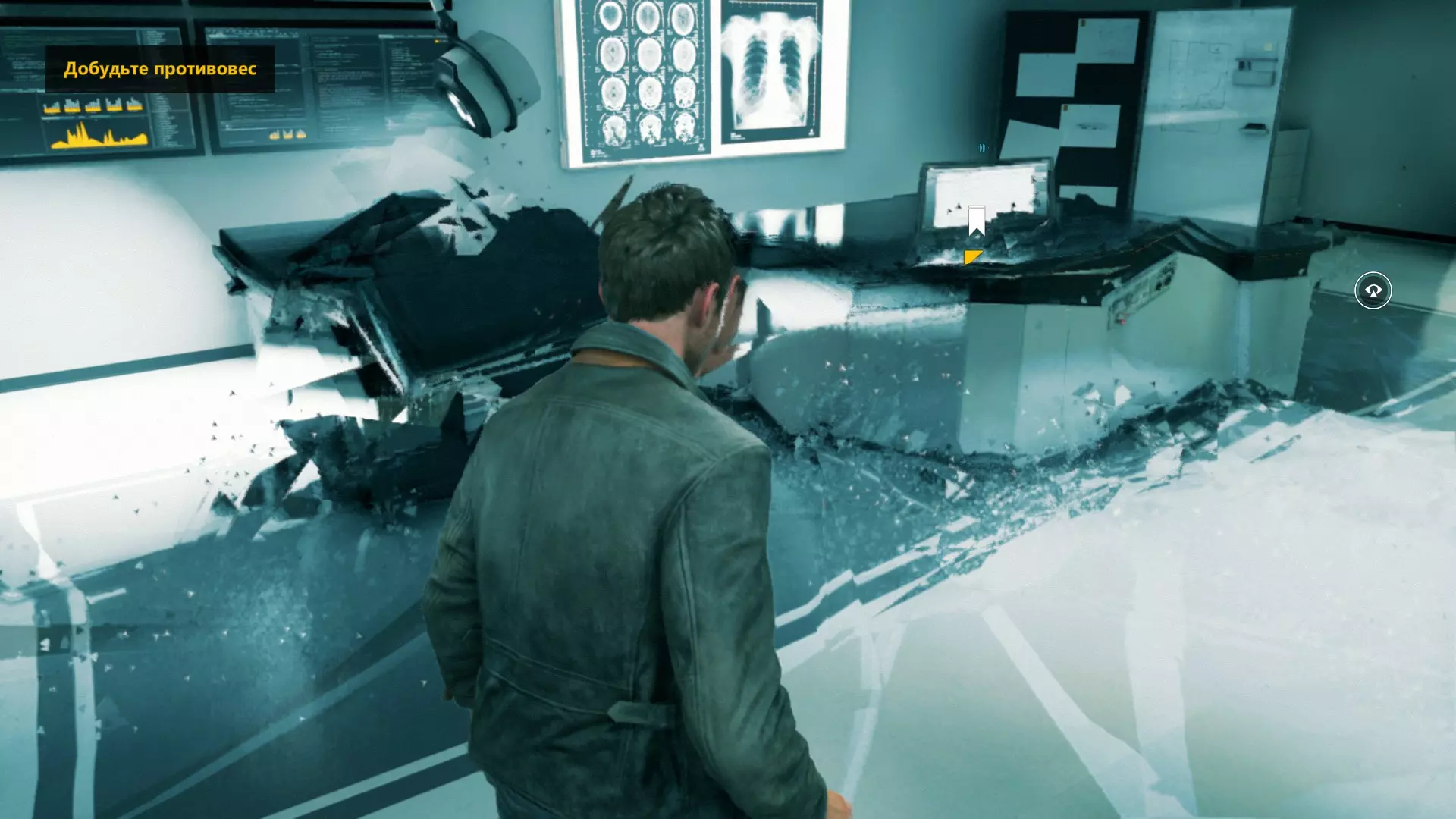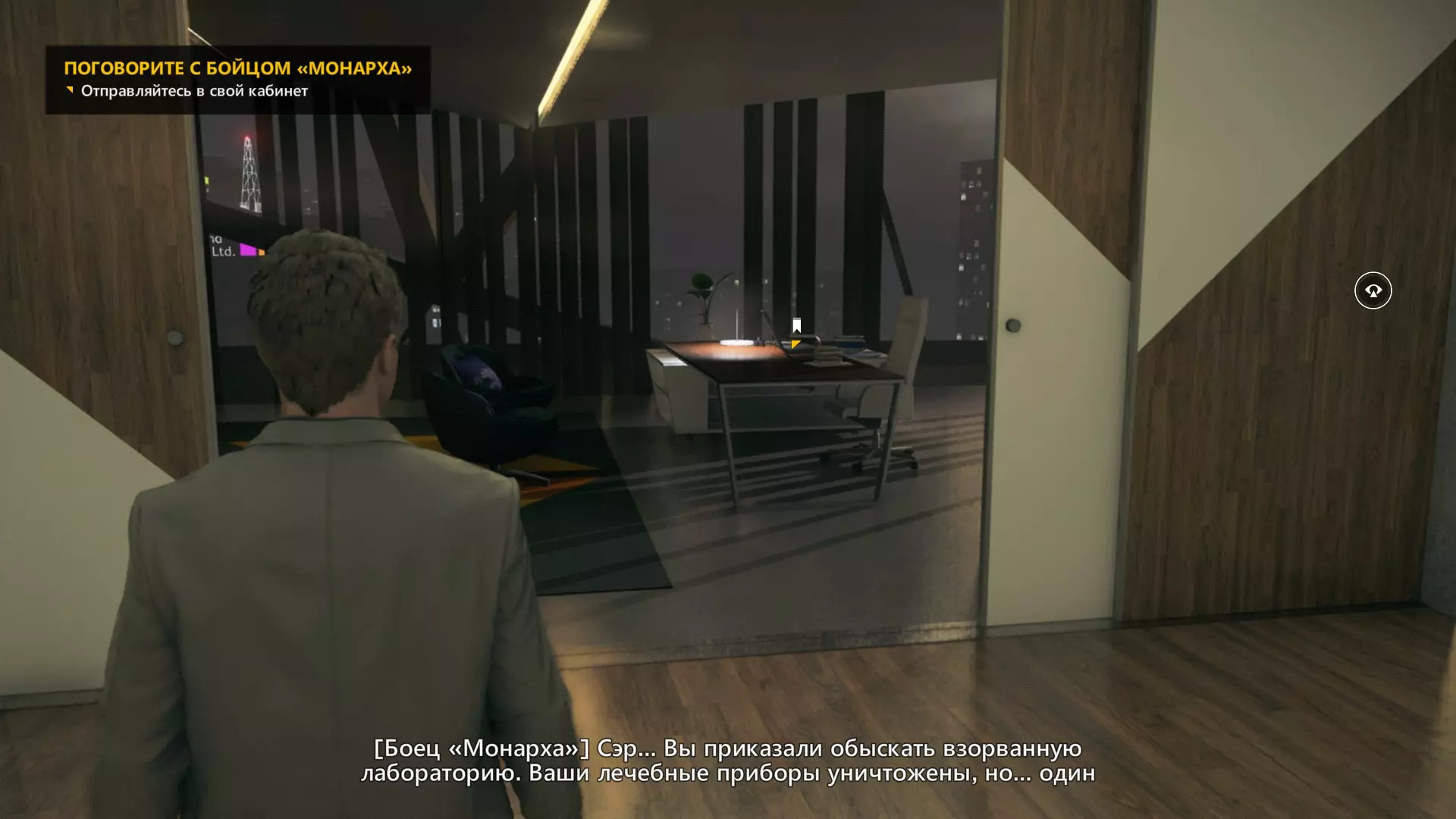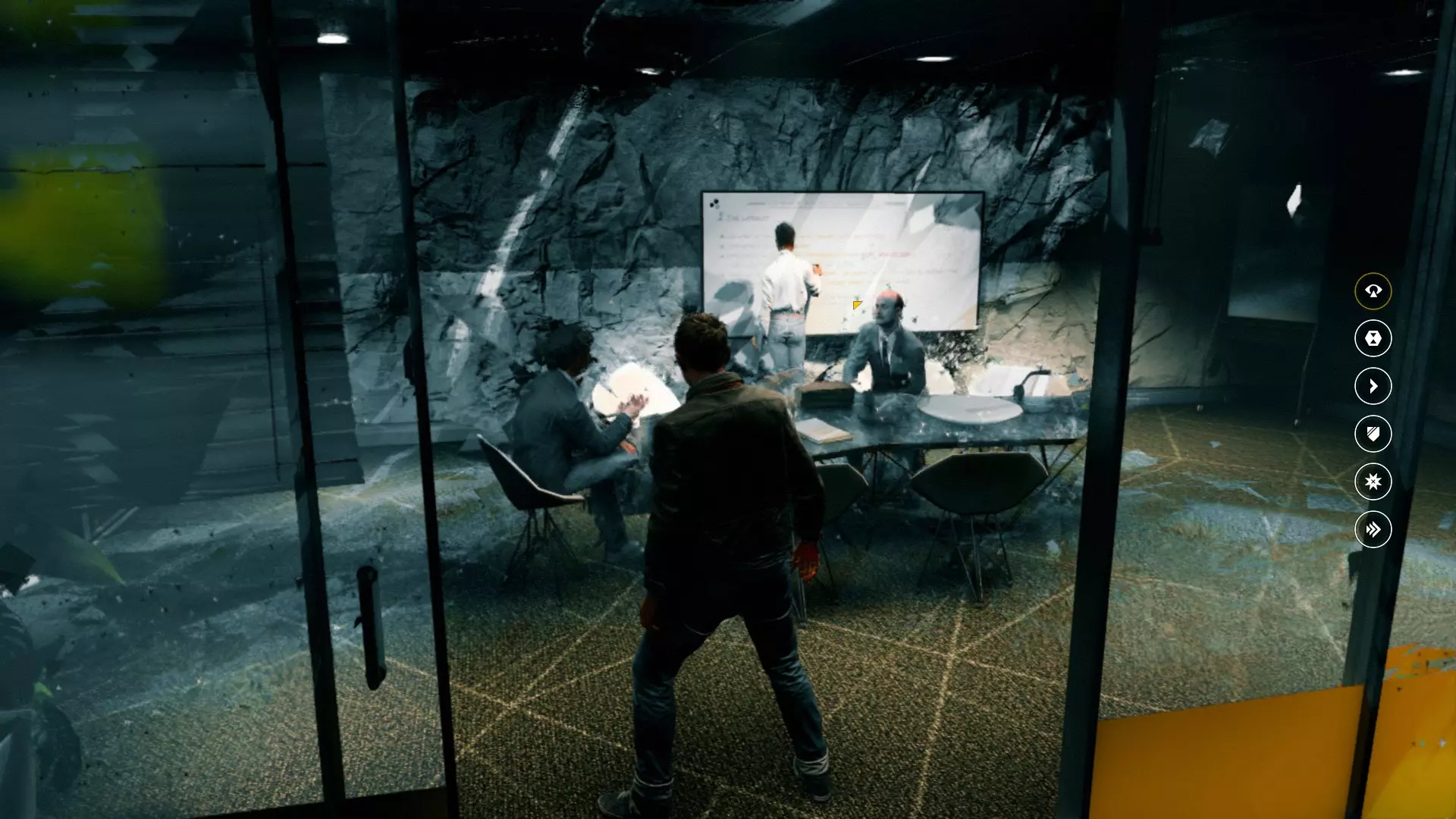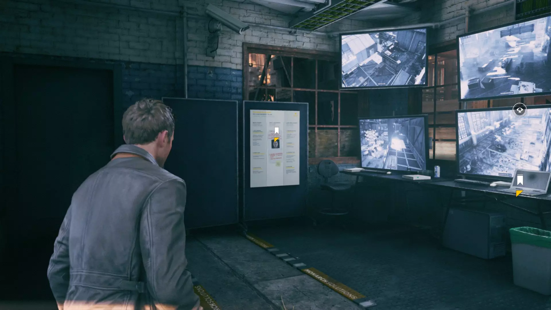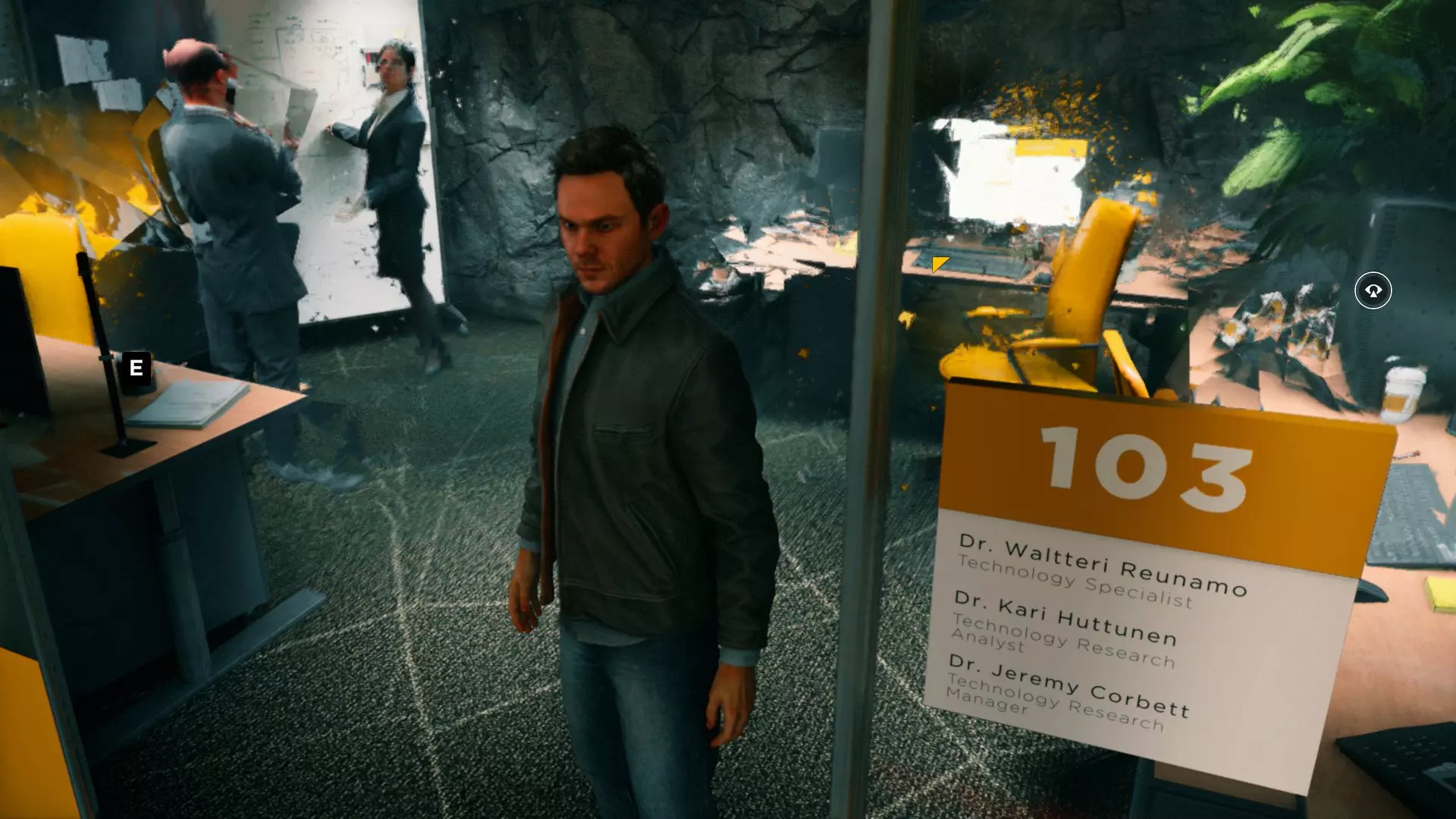 2. 打开黄色大门后,你需要用枪击倒几名保安。然后走到房间右侧、玻璃实验室旁边的白色板子处。