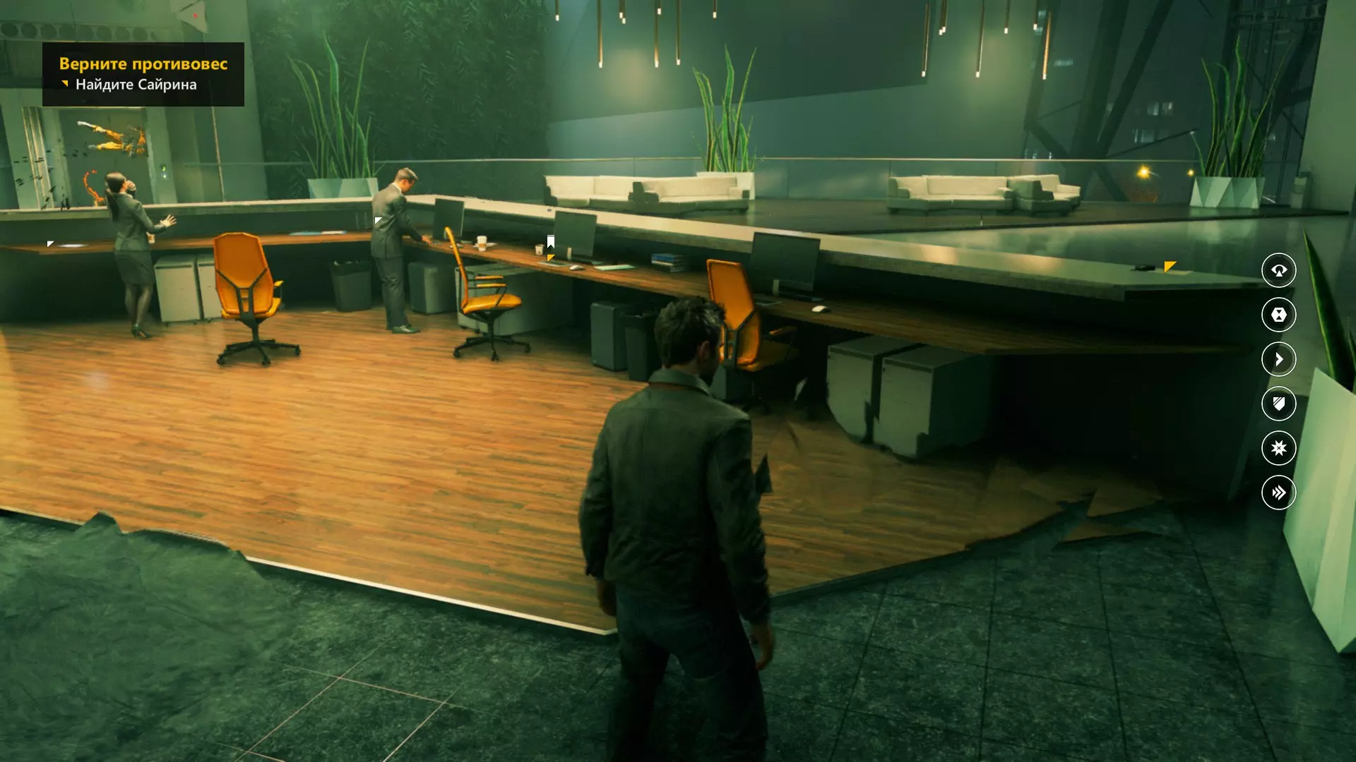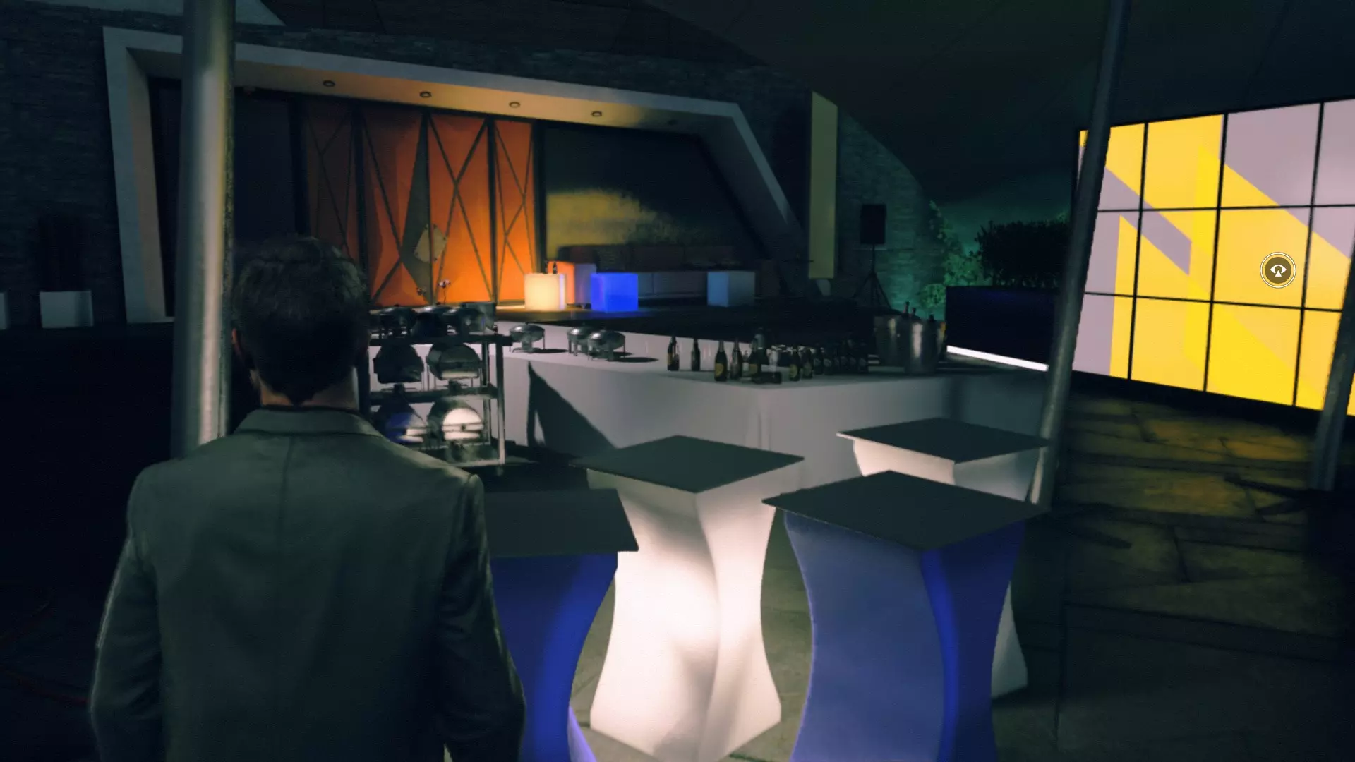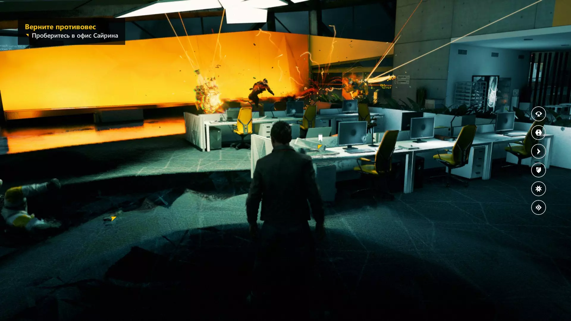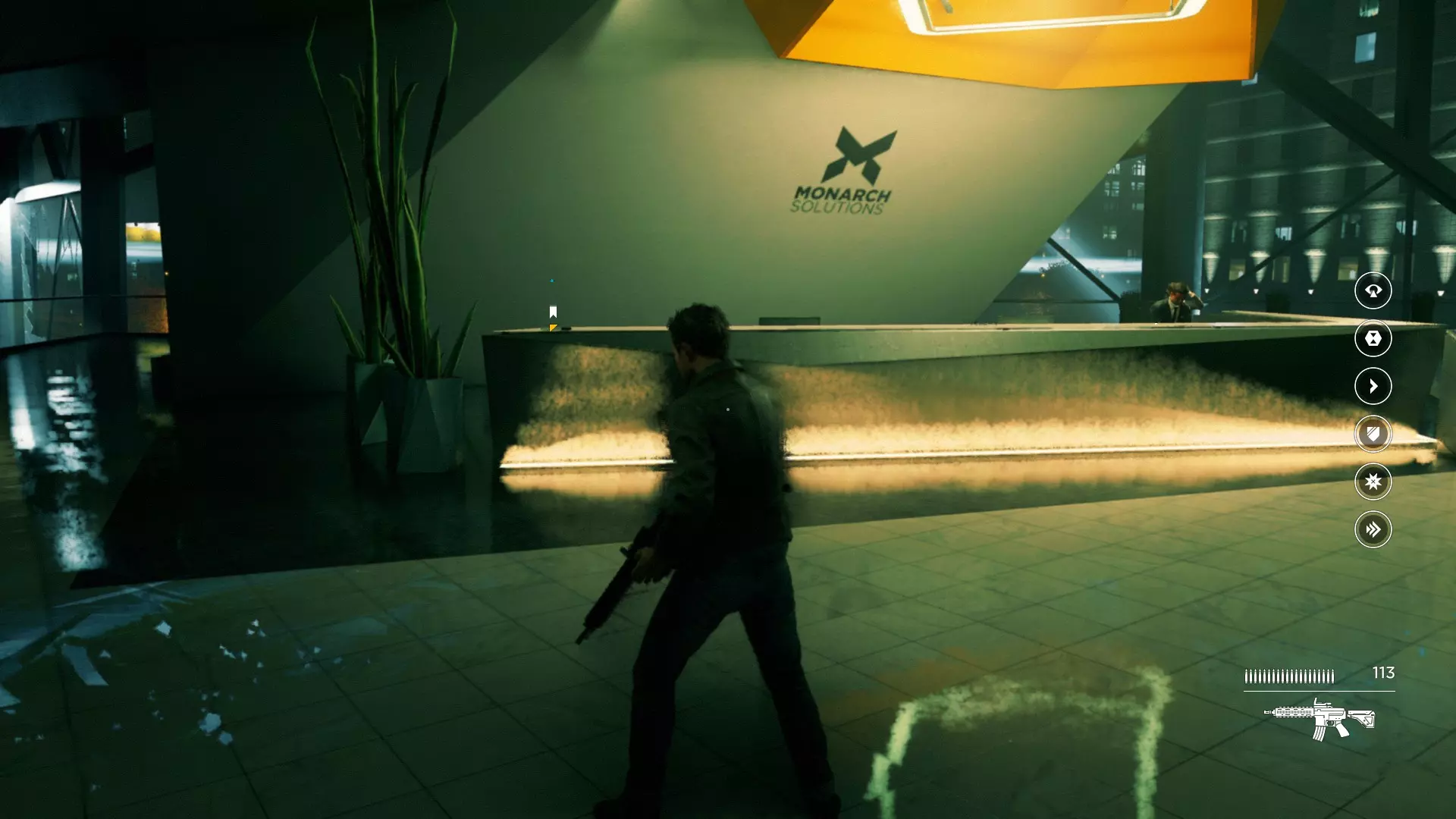 2. 打开黄色大门后,你需要用枪击倒几名保安。然后走到房间右侧、玻璃实验室旁边的白色板子处。