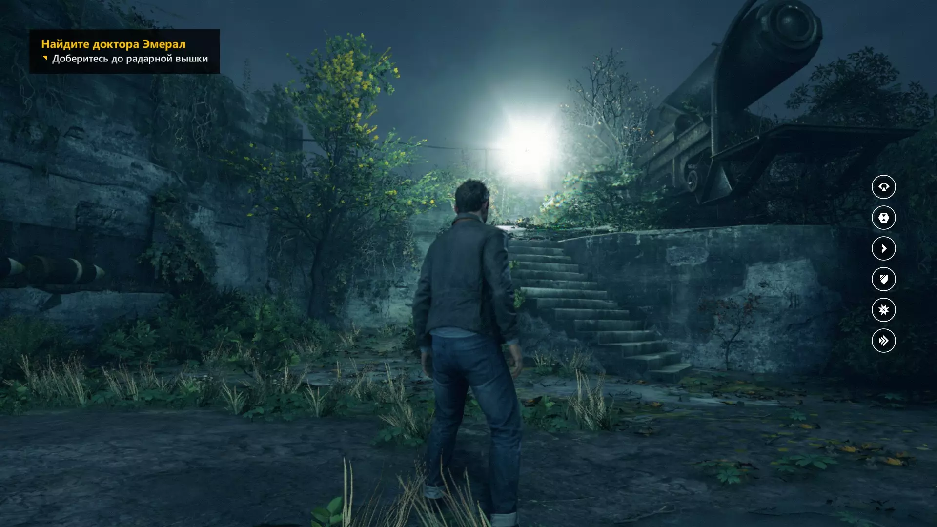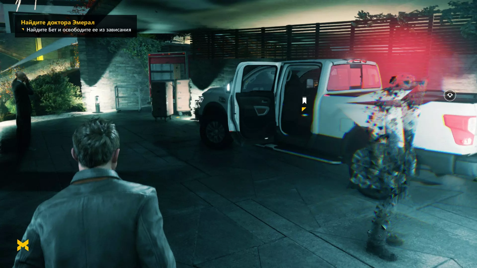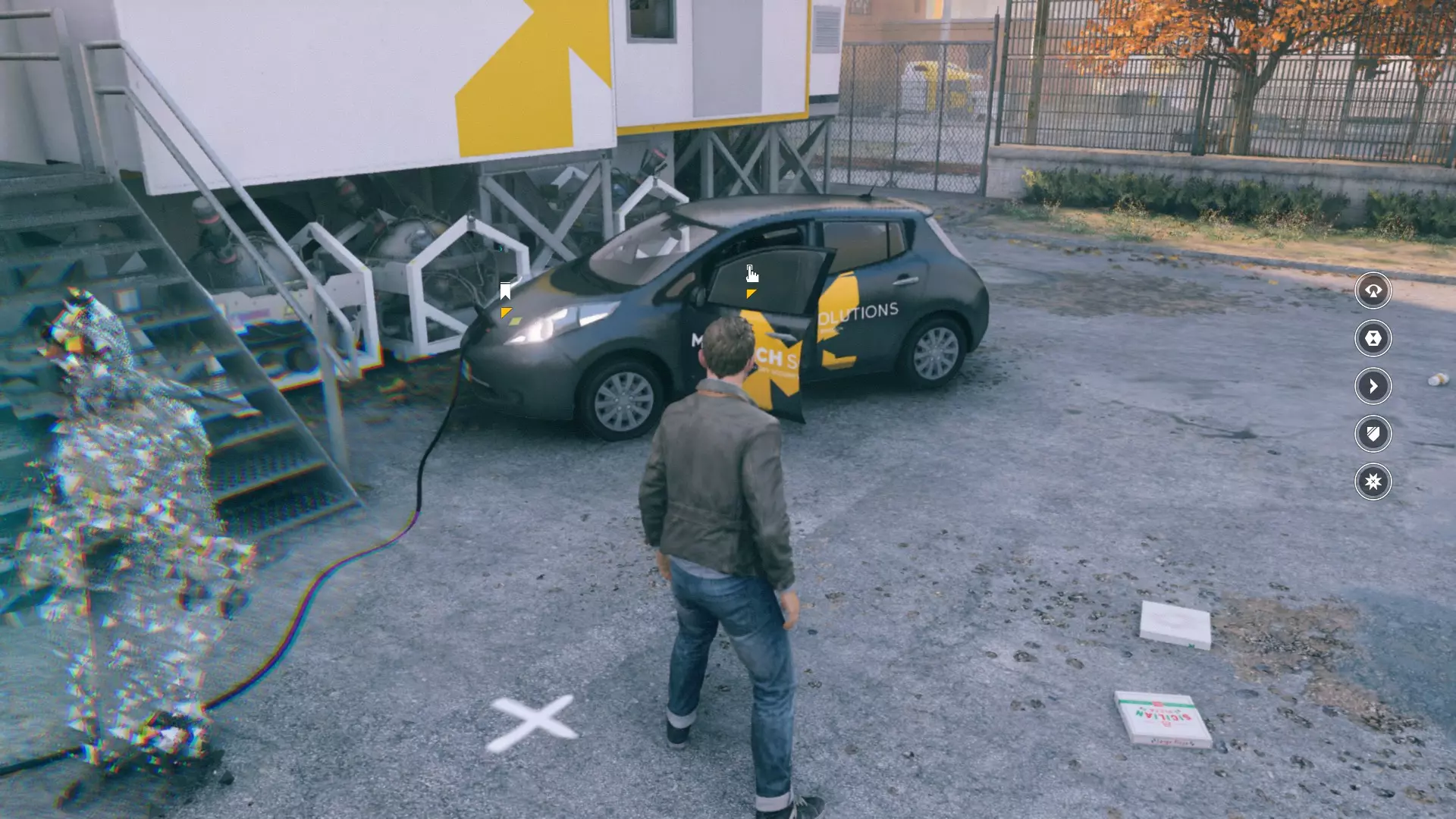 5. 来到外面后,我们看到一辆汽车,汽车右侧立着一根天线。开启视觉模式,天线上方有另一个能量源。