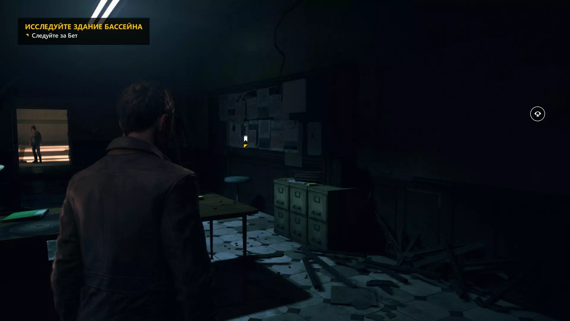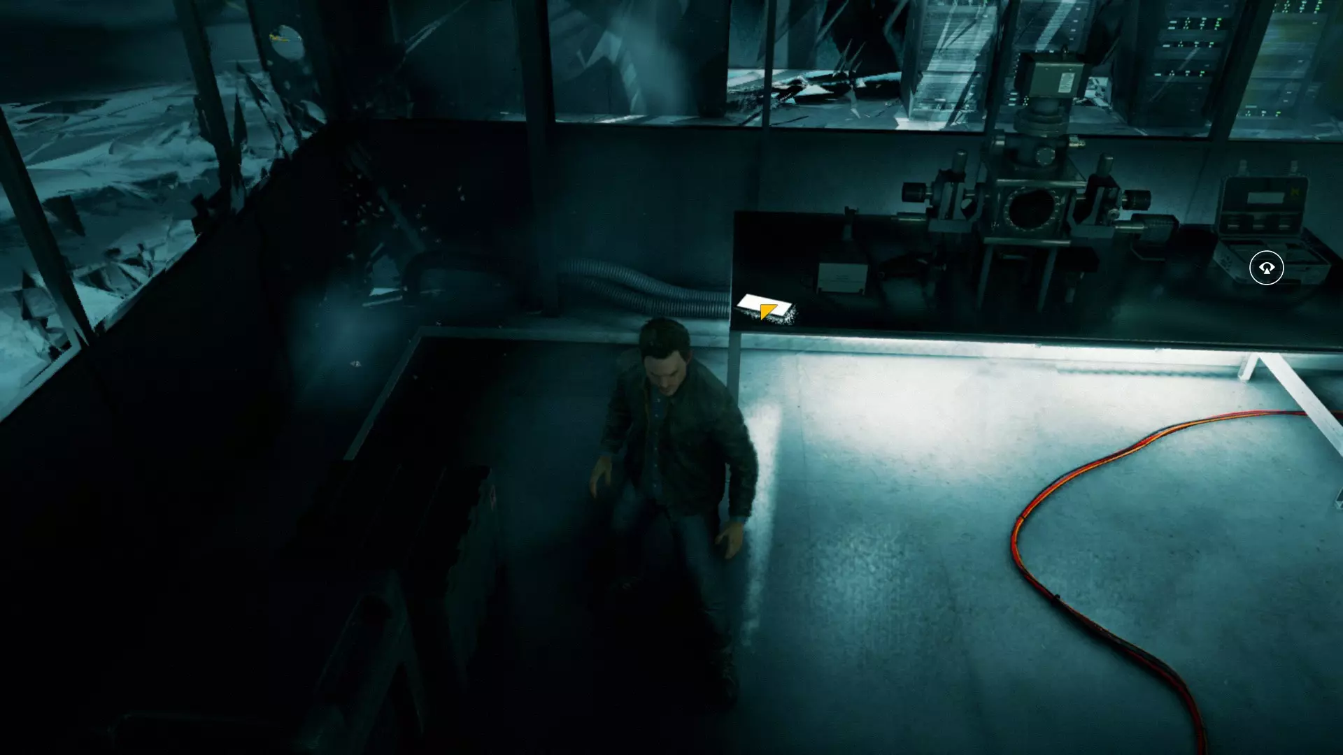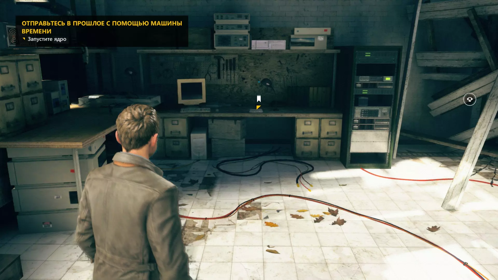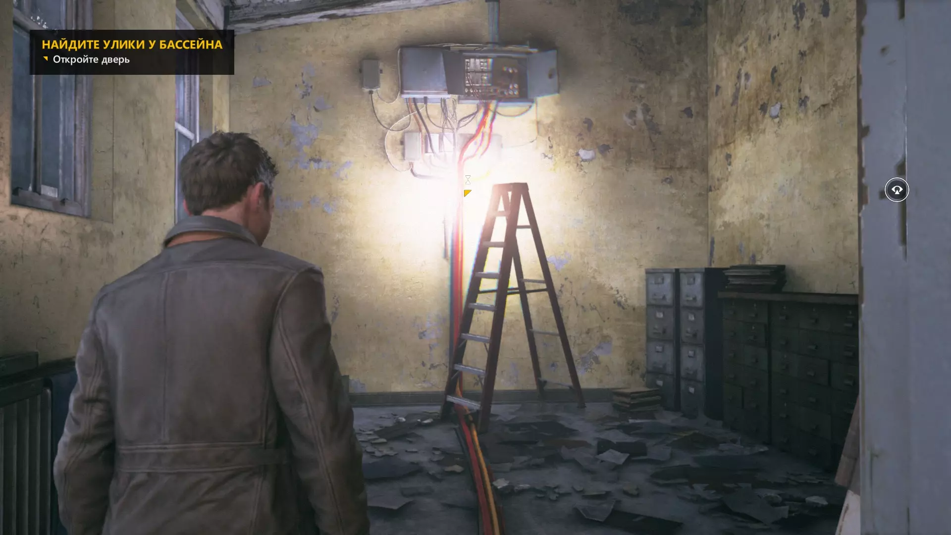 10. 和贝丝一起撞开门,走到房间尽头,然后左转,沿着电线一直走到底。开启时间视觉,找到我们要找的东西。
