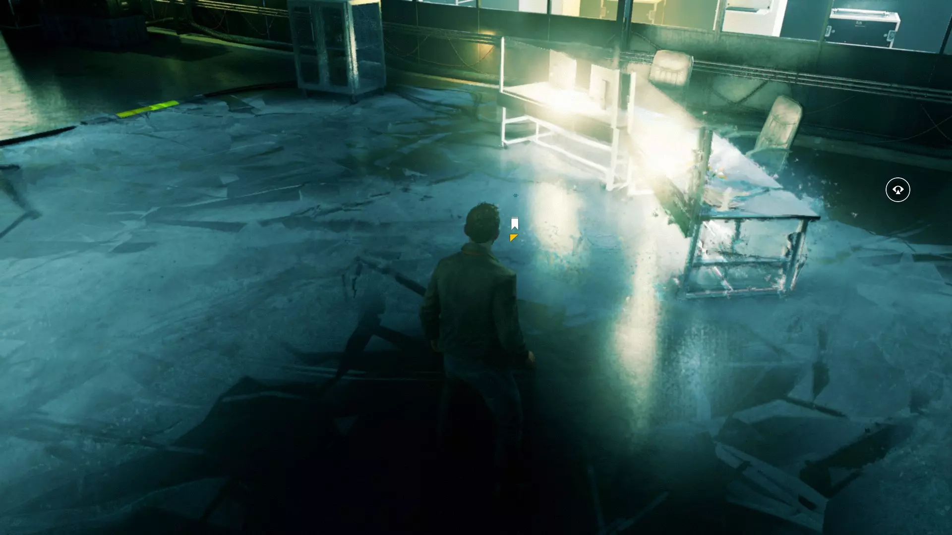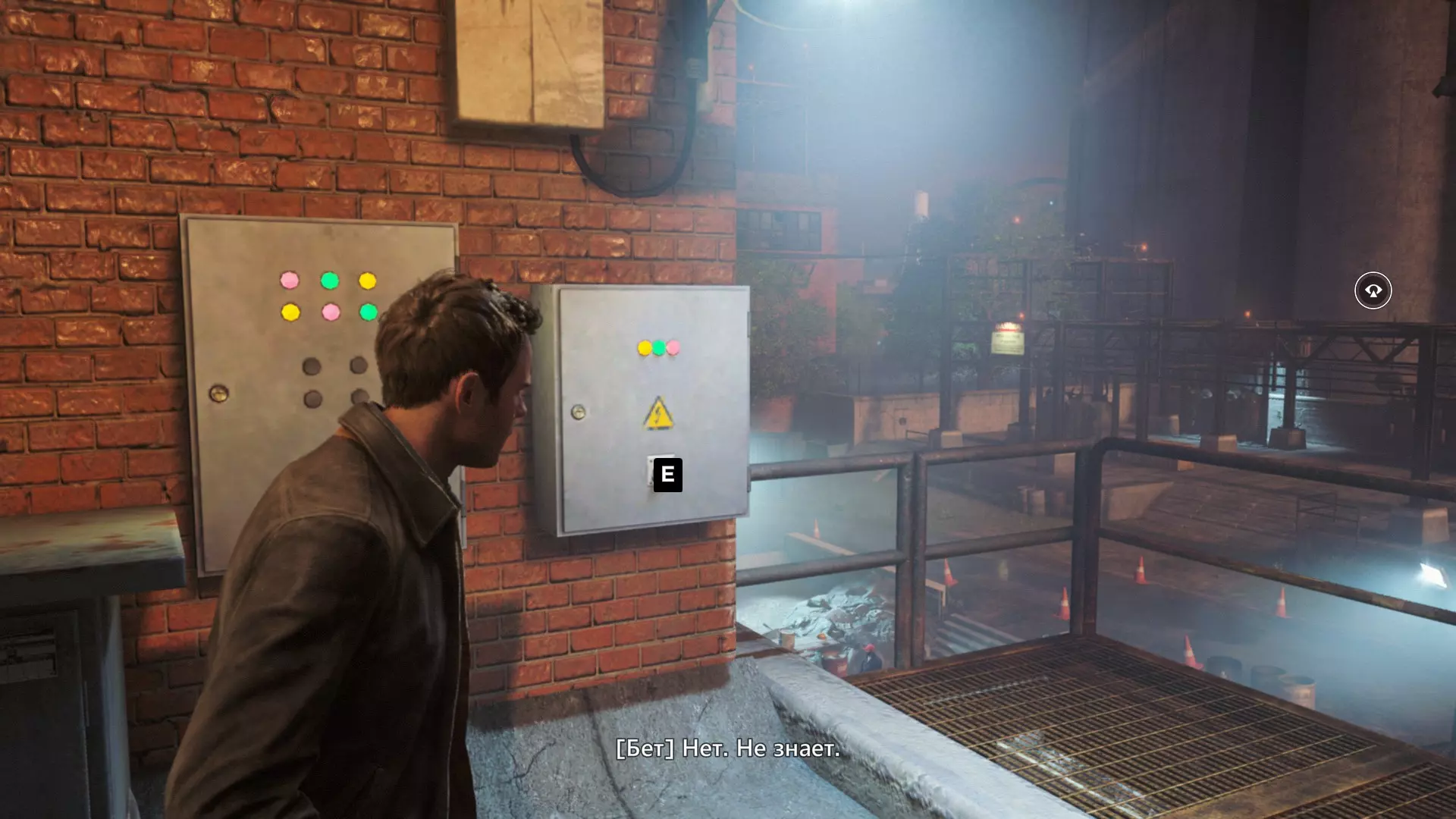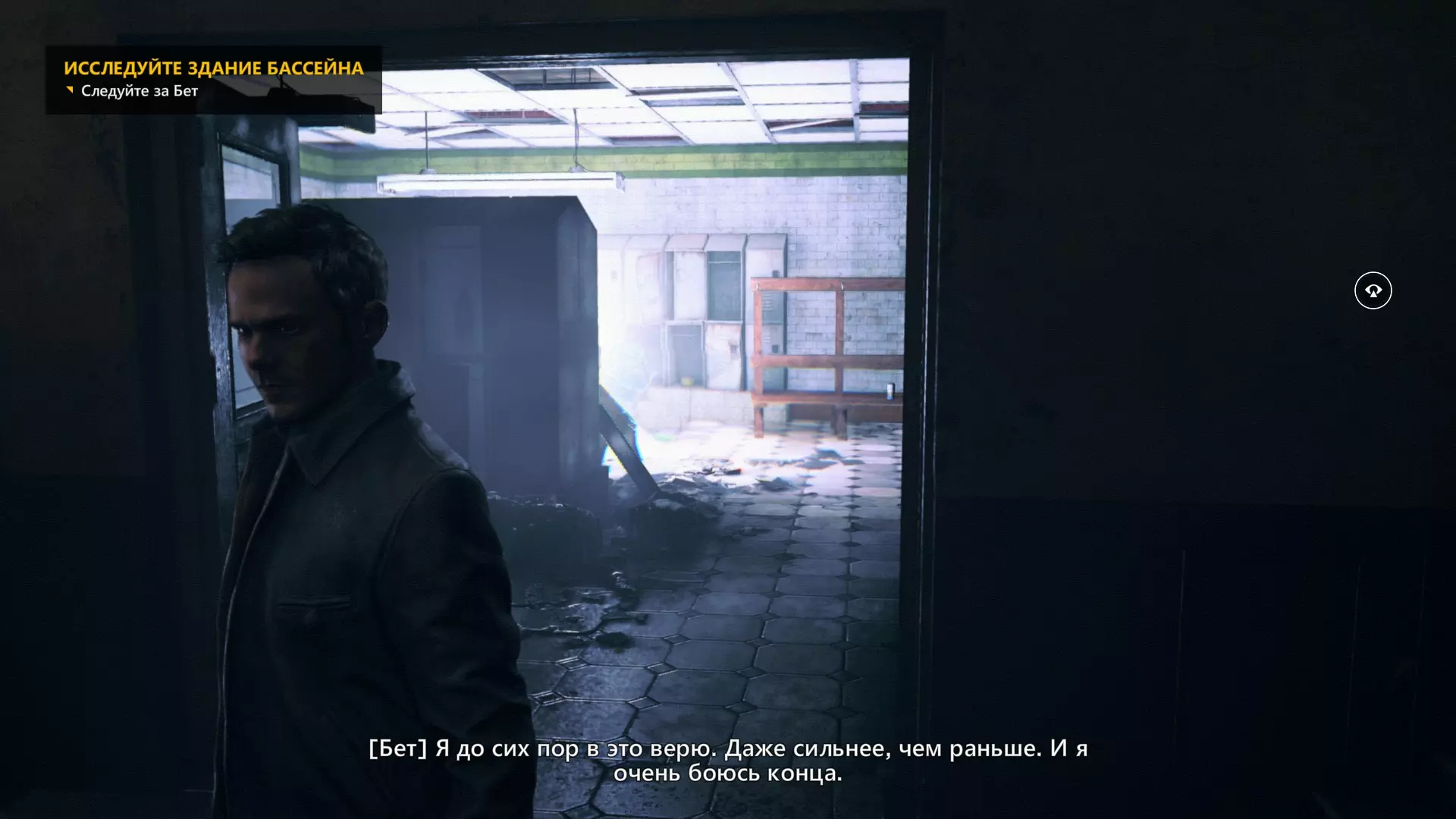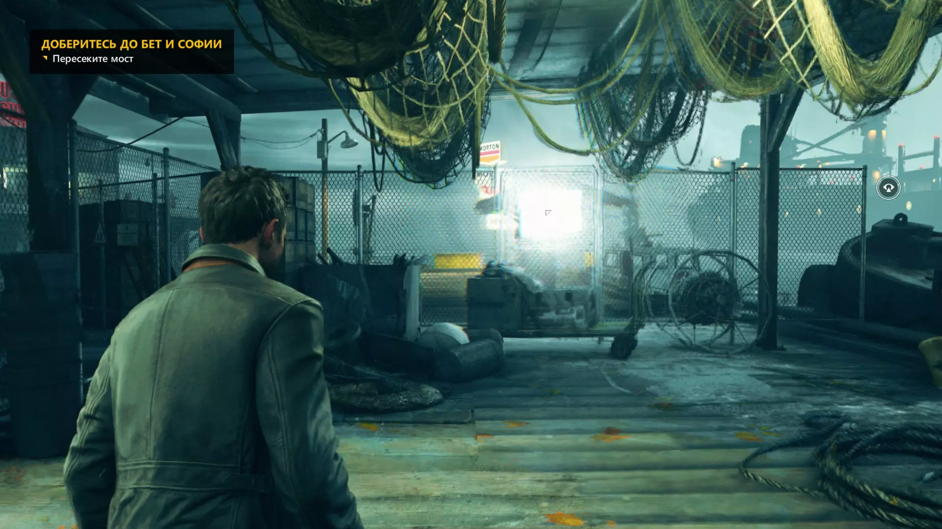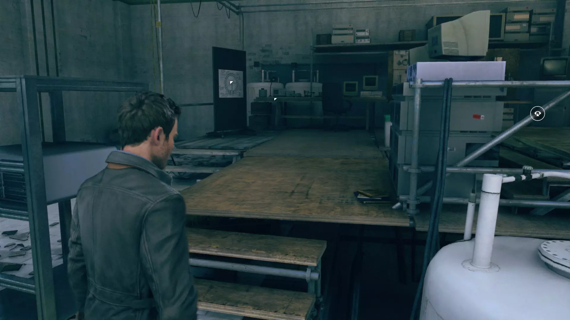 10. 和贝丝一起撞开门,走到房间尽头,然后左转,沿着电线一直走到底。开启时间视觉,找到我们要找的东西。
