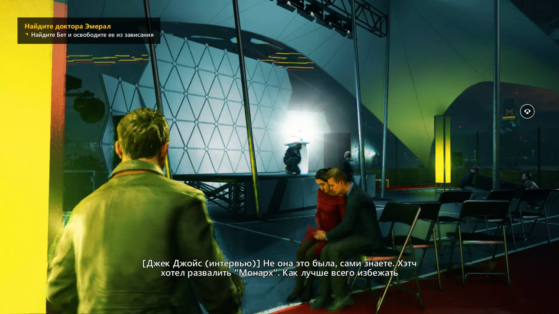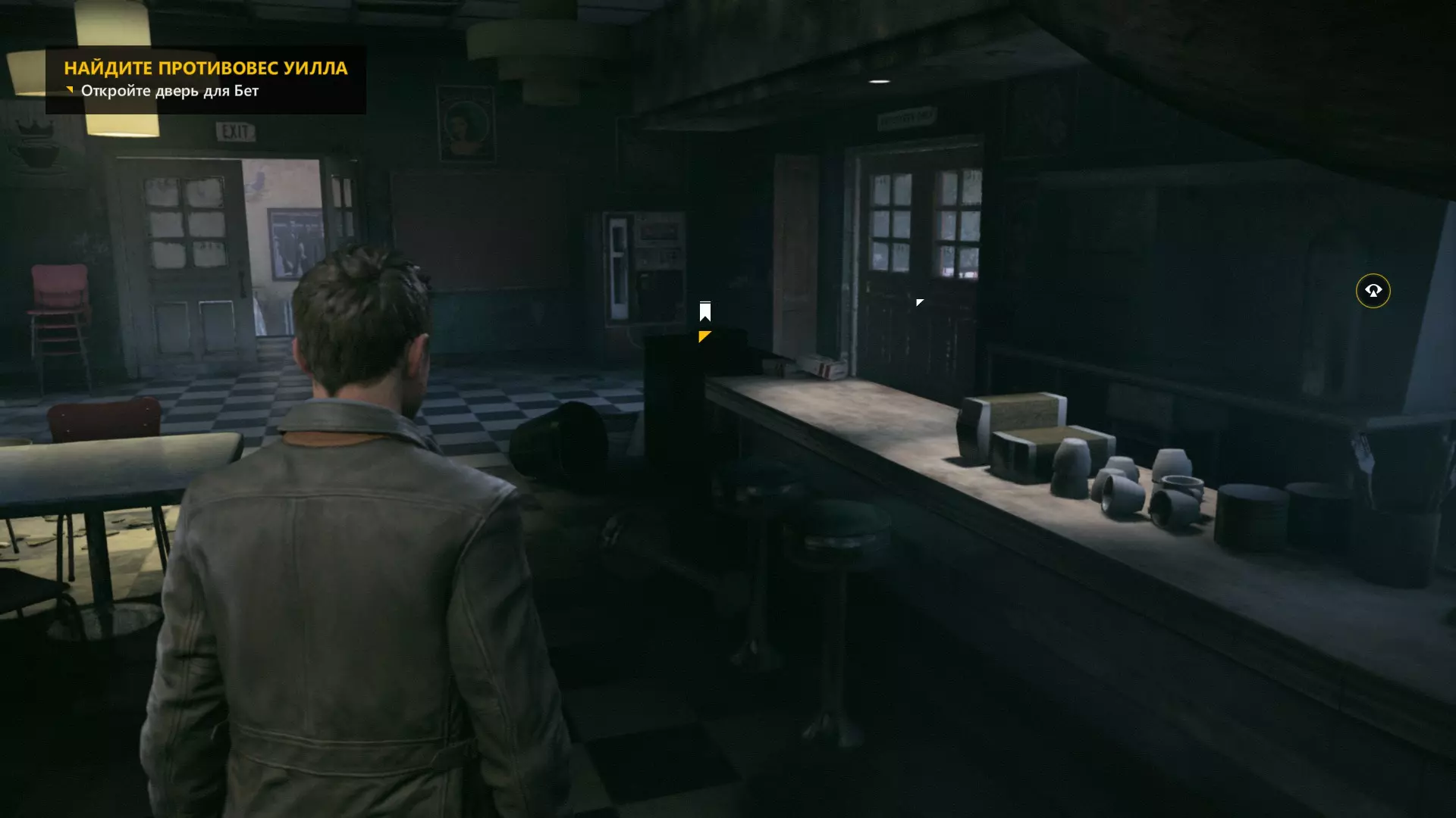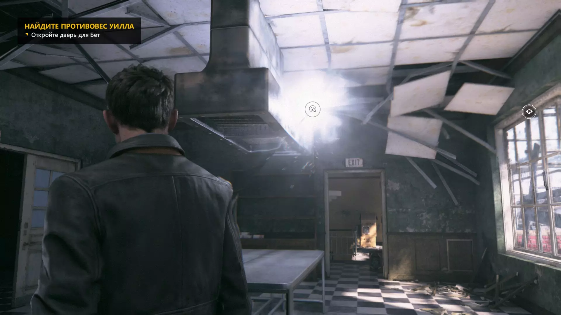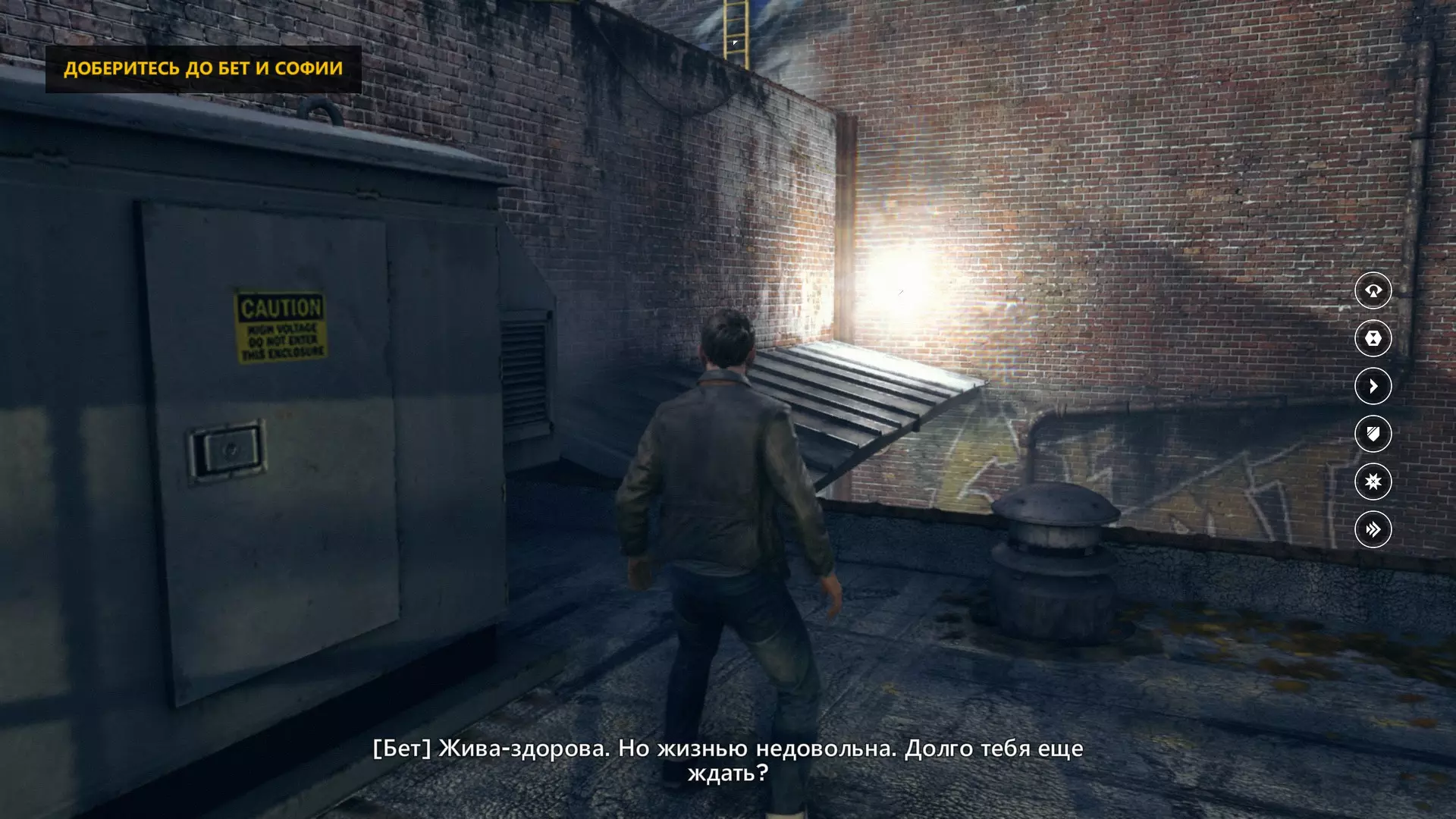 10. 和贝丝一起撞开门,走到房间尽头,然后左转,沿着电线一直走到底。开启时间视觉,找到我们要找的东西。