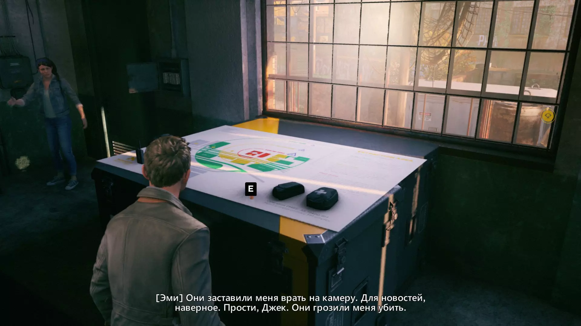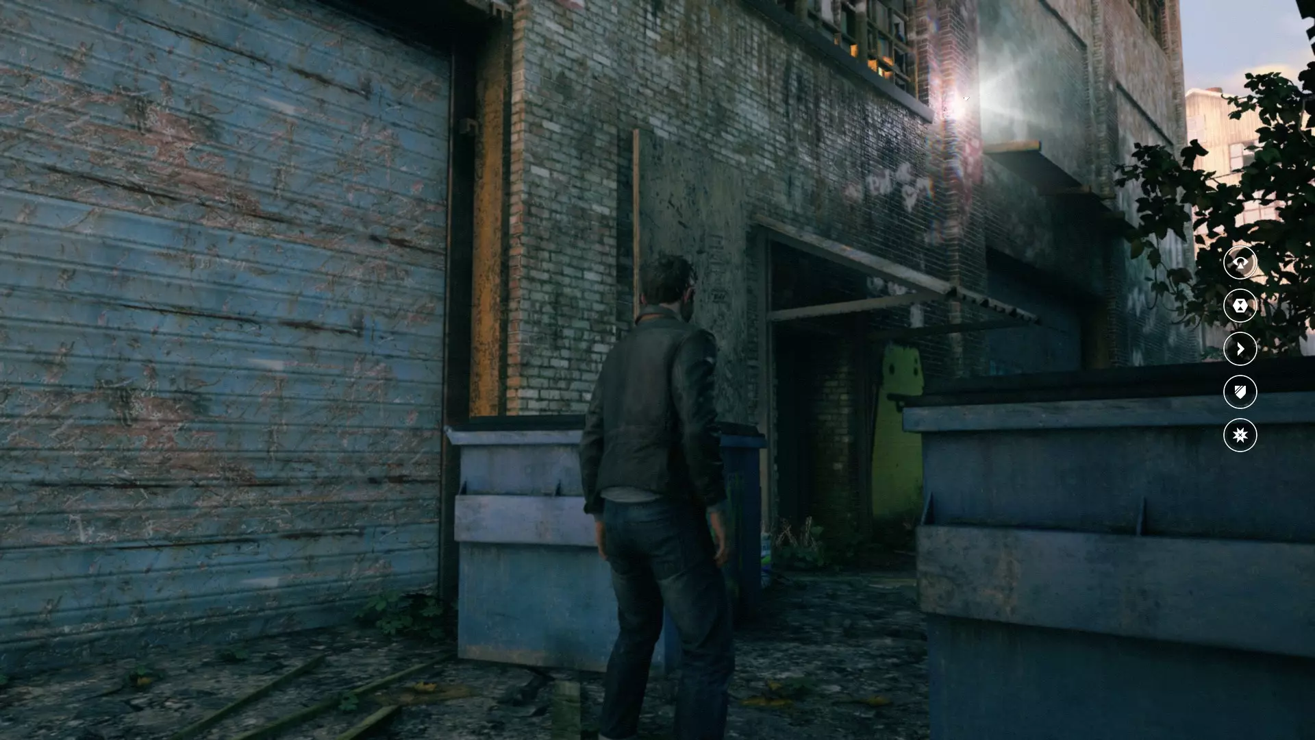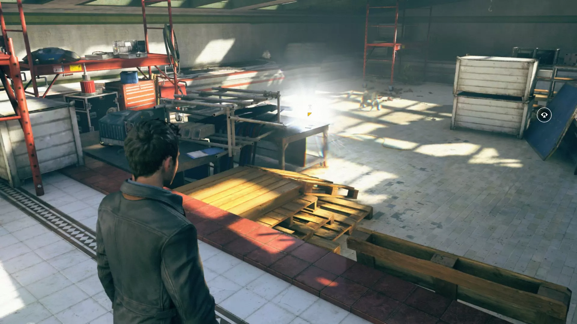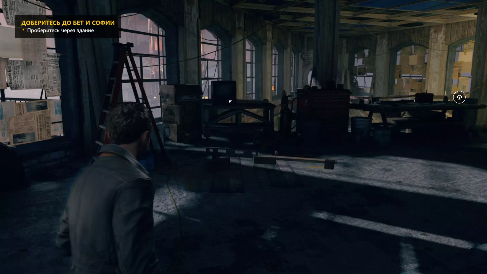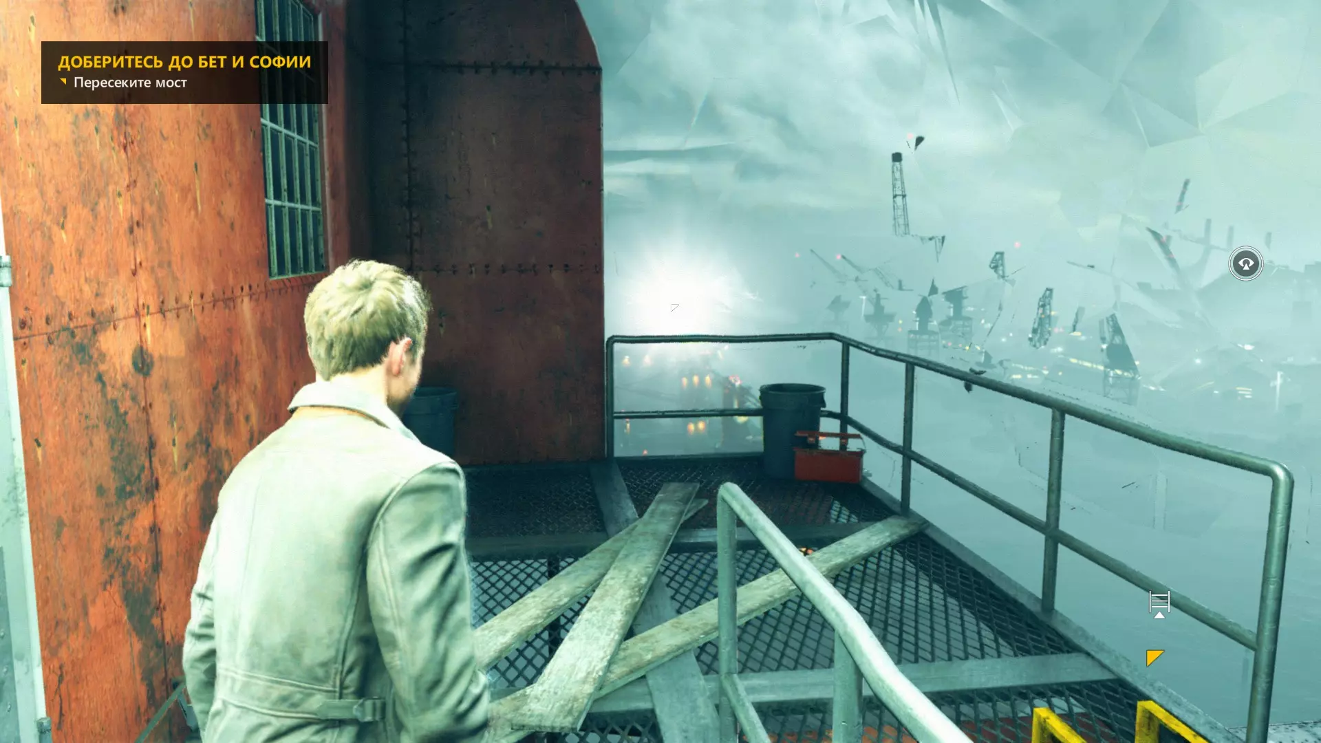 4. 过场动画结束后,下到下一层。工作台上会有一台收音机。 5. 下到下一层后,从窗户出去,开启【时间视觉】回头看,时间源会在蓝色桶的上方。 6. 第一次交火后,我们会打开大门。转身并使用【时间视觉】,找到时间源。