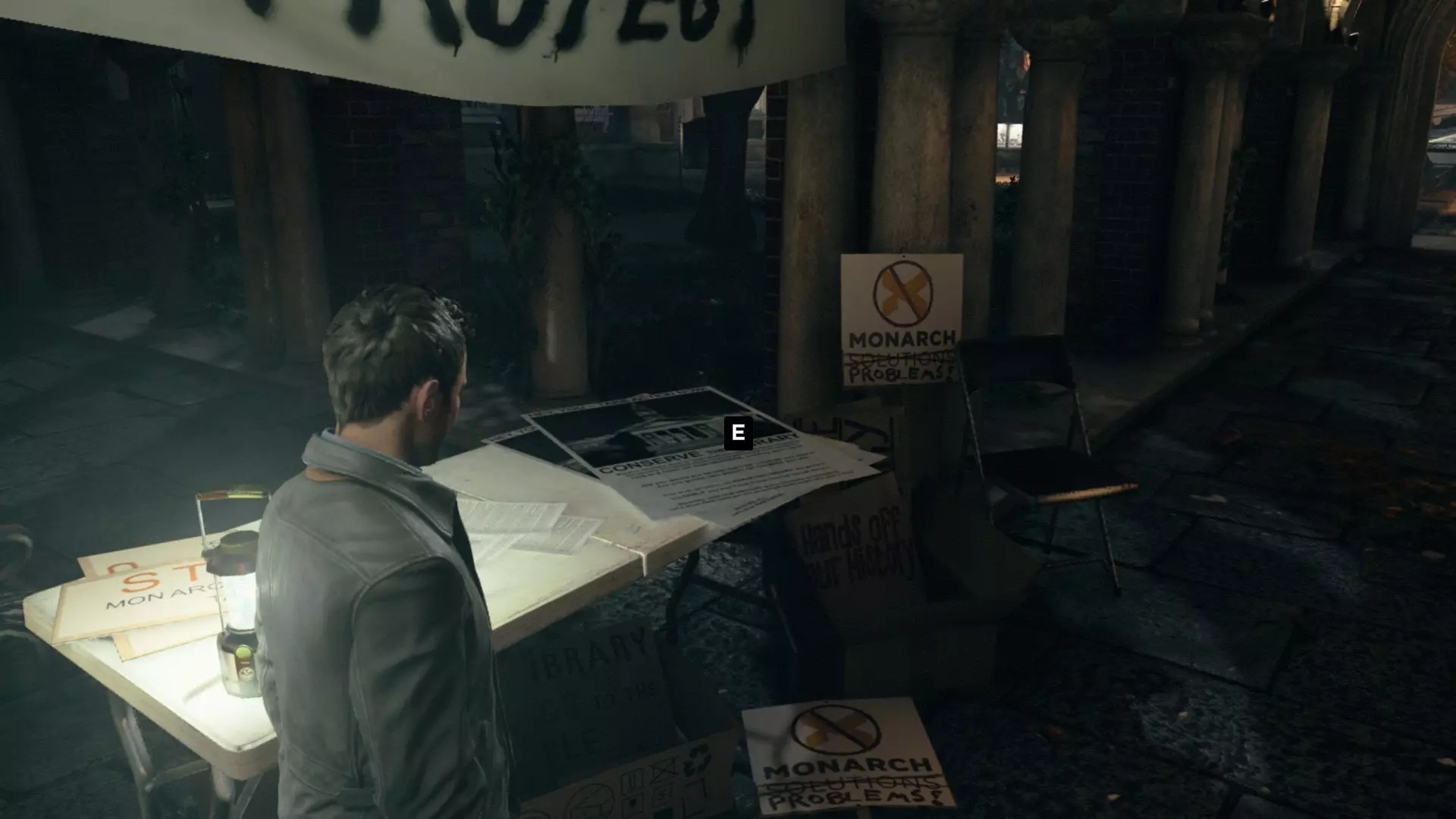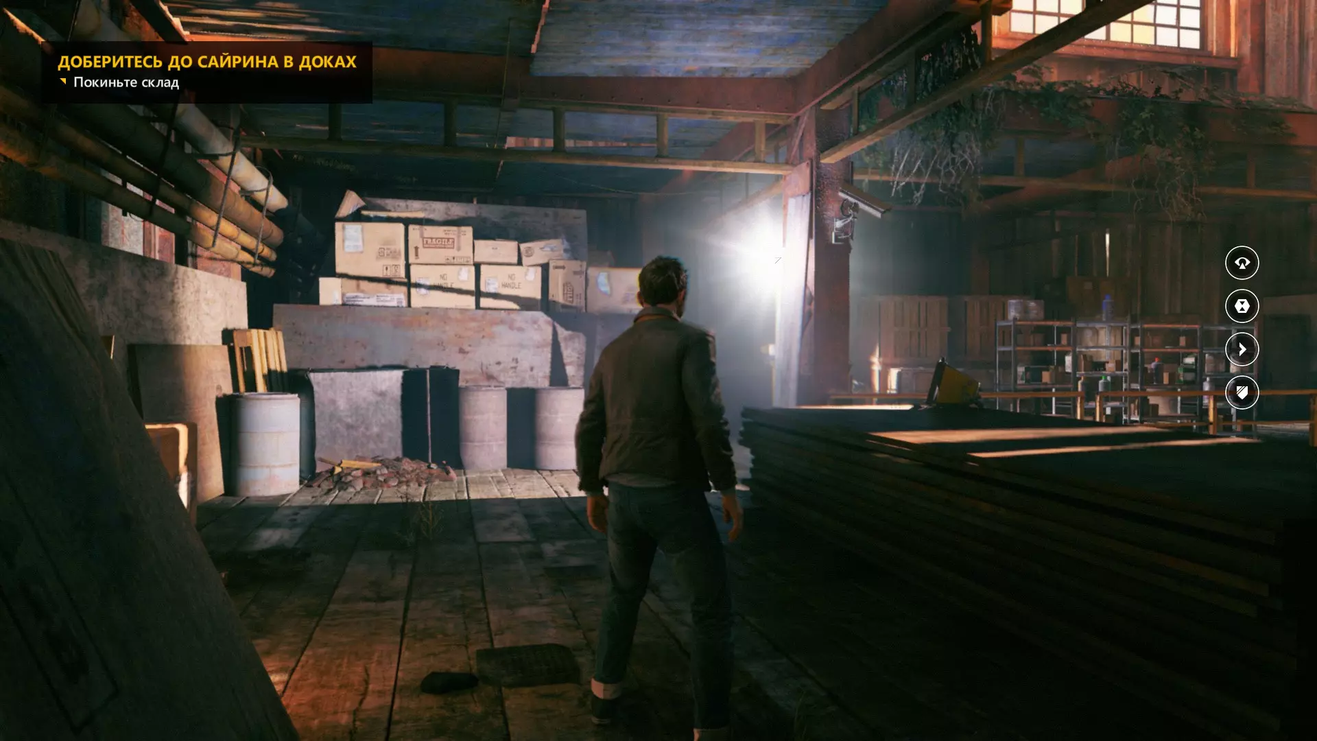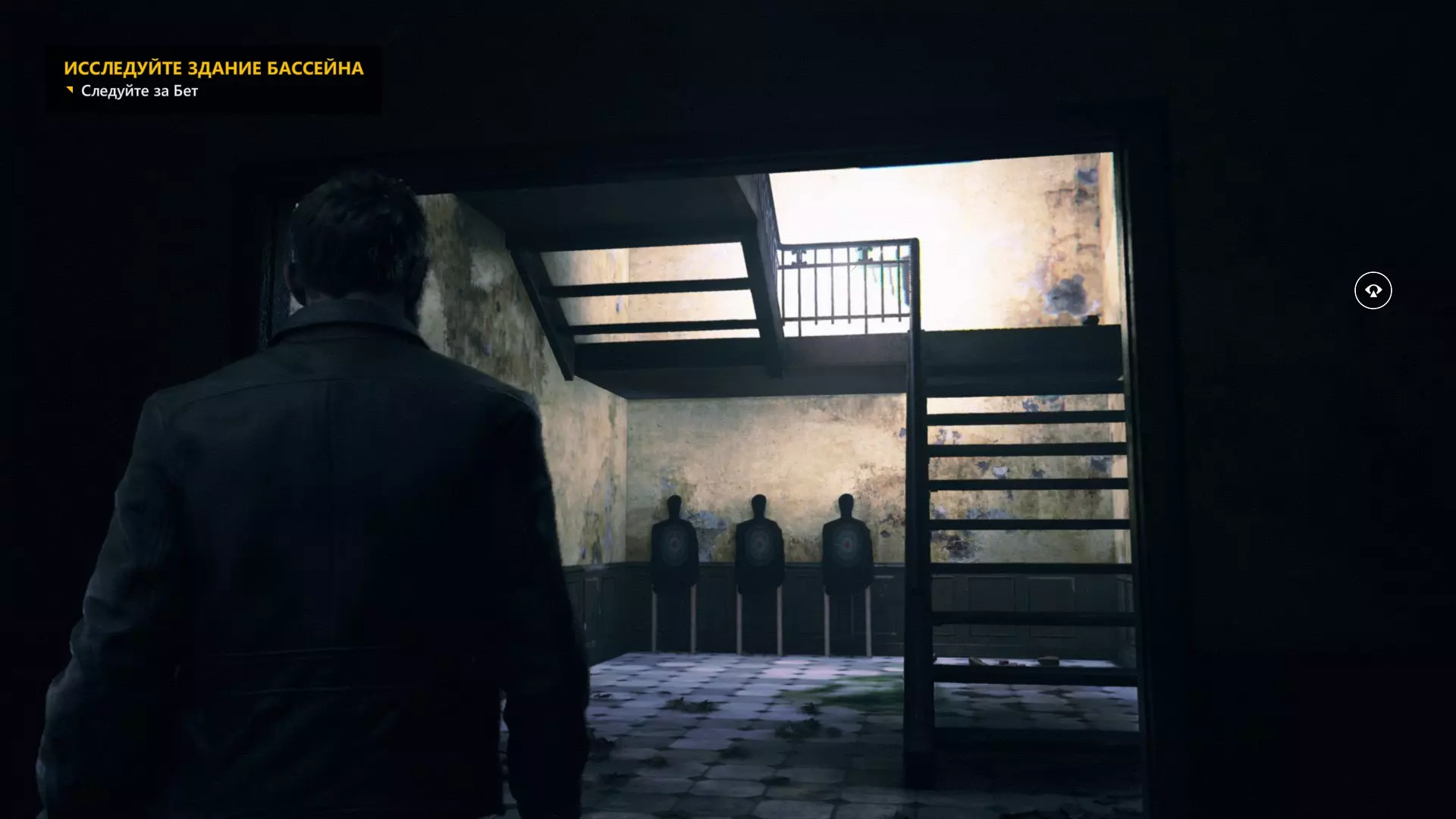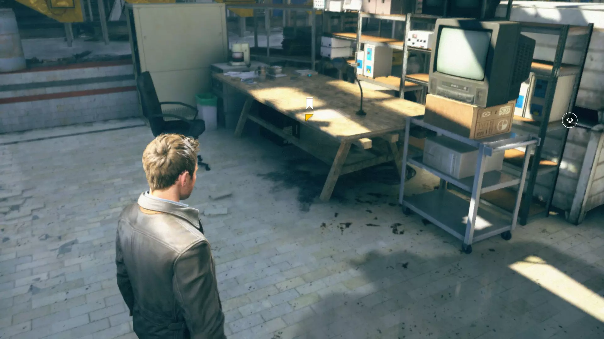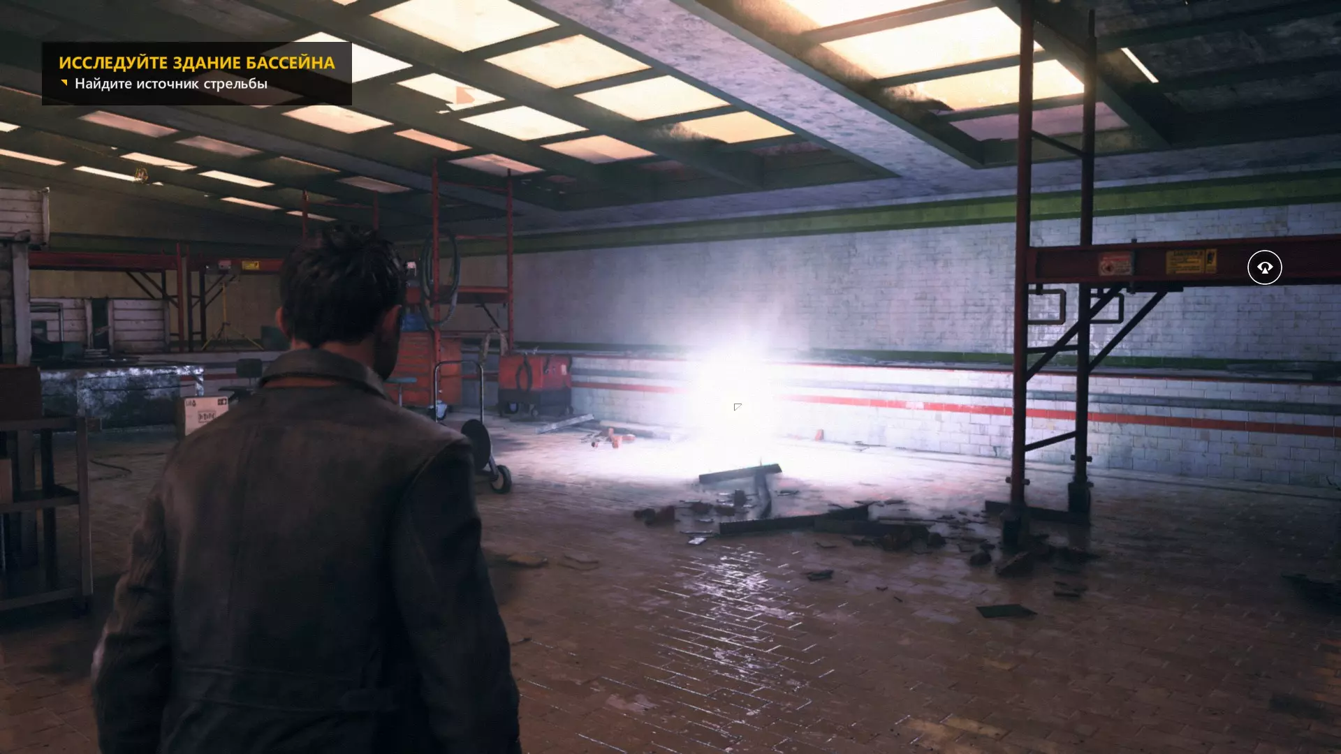 4. 过场动画结束后,下到下一层。工作台上会有一台收音机。 5. 下到下一层后,从窗户出去,开启【时间视觉】回头看,时间源会在蓝色桶的上方。 6. 第一次交火后,我们会打开大门。转身并使用【时间视觉】,找到时间源。