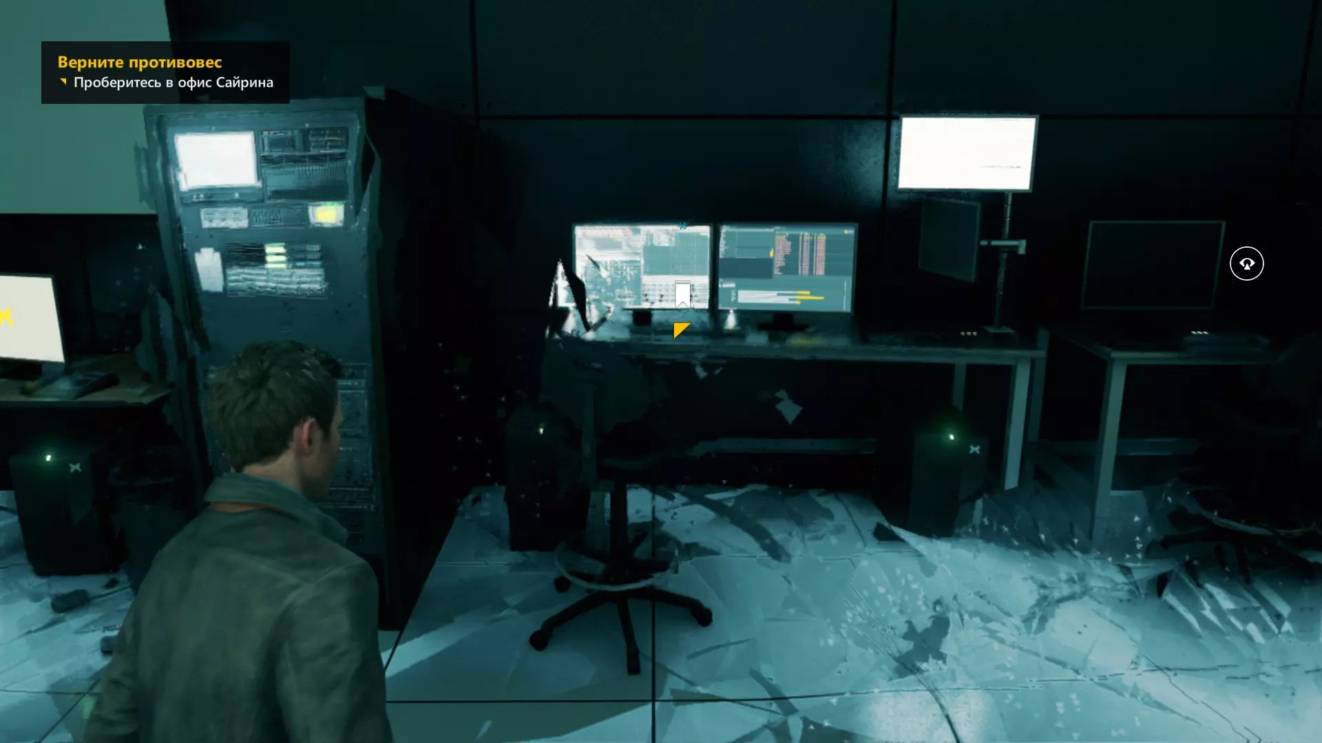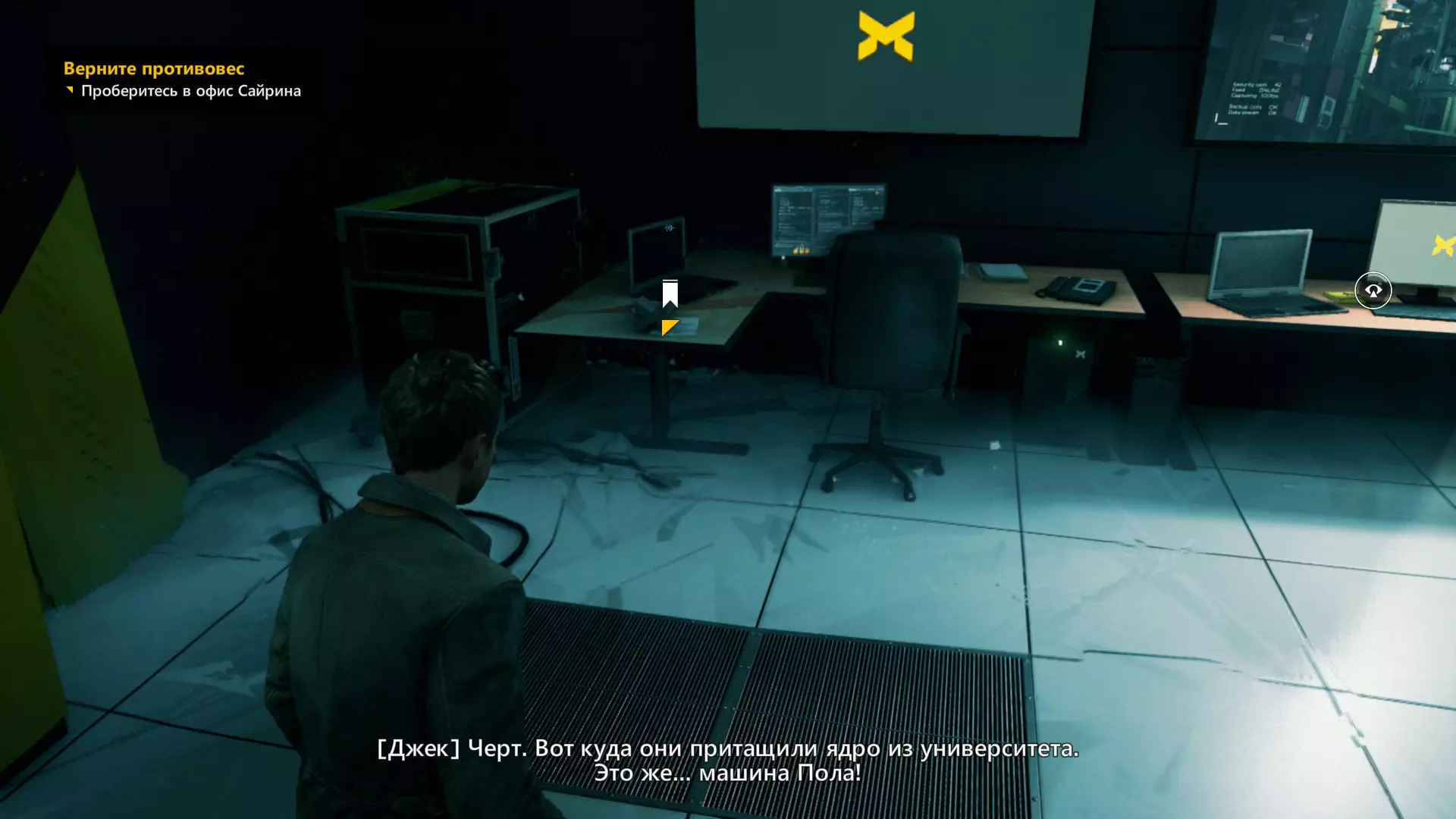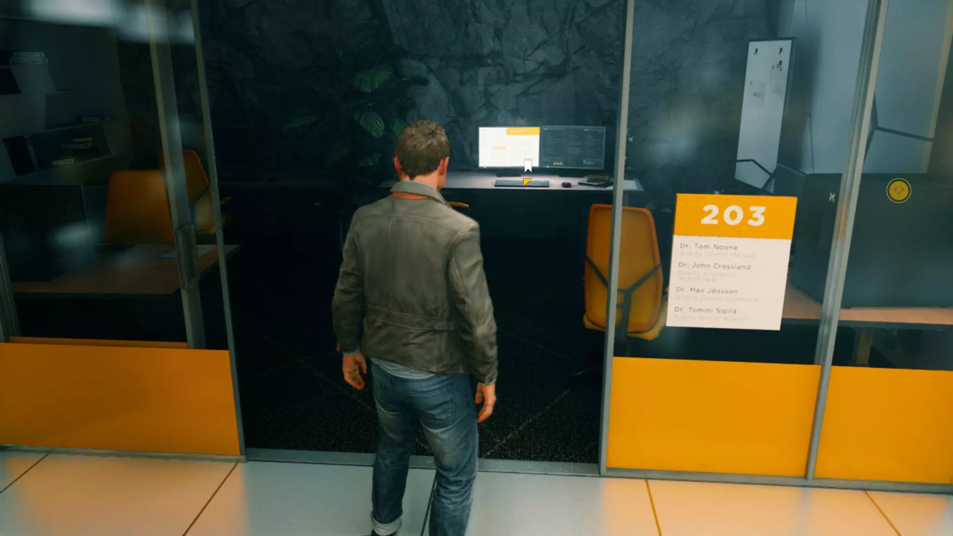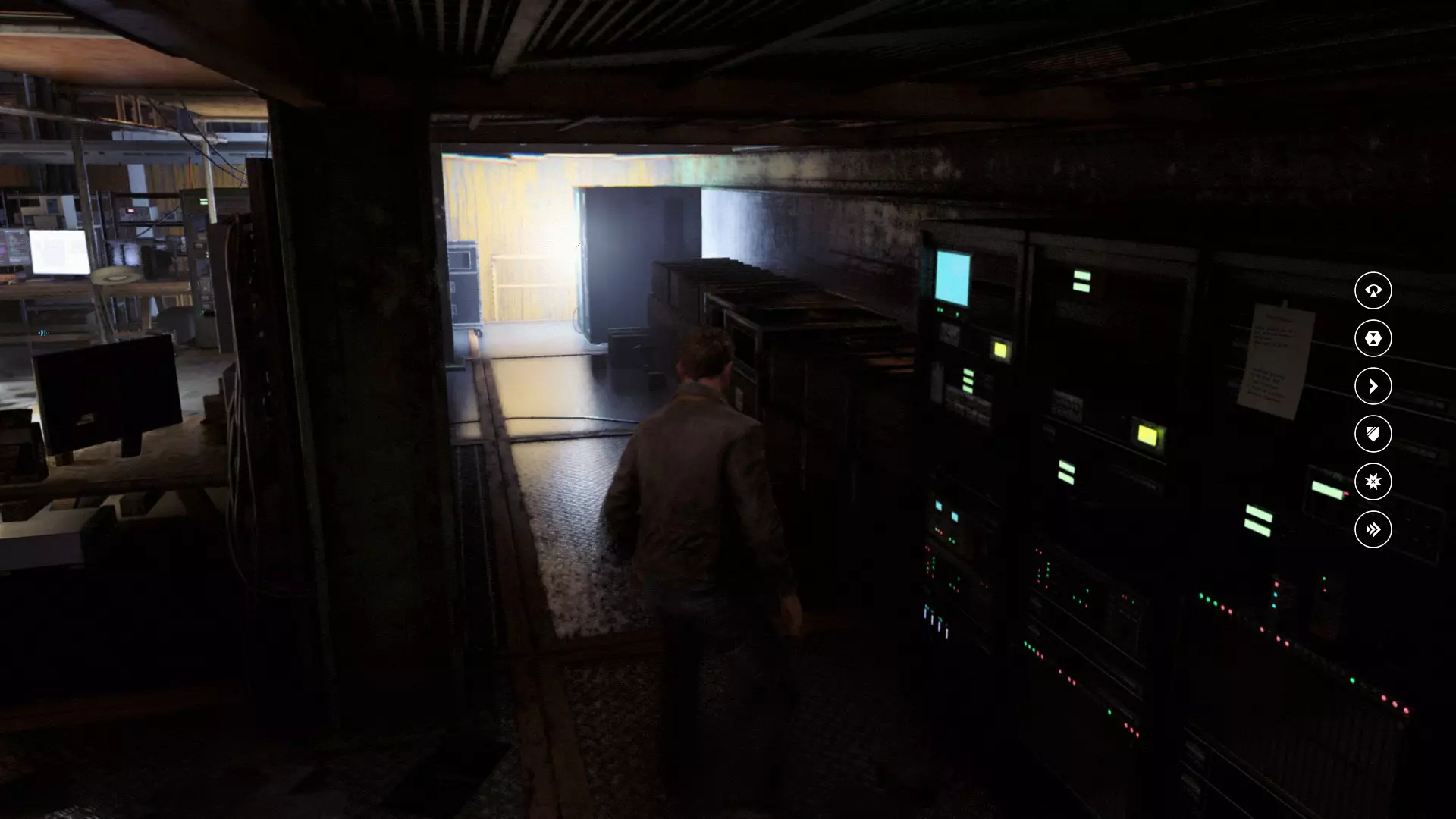 第一幕,第二部分 逃离校园。 1. 当你从服务器机房的隔间出来后,正常进入服务器机房,然后走到中间的电脑旁。