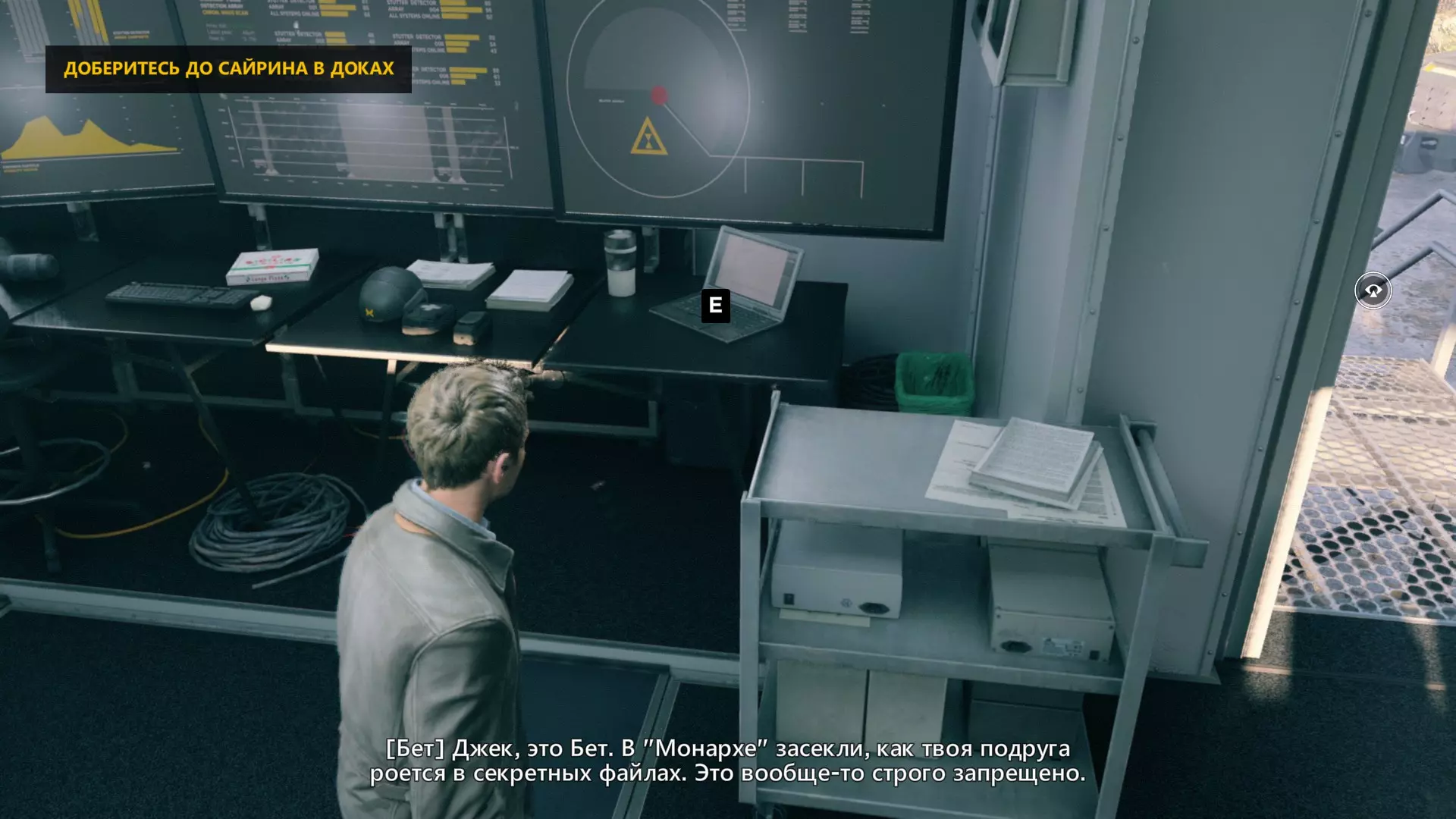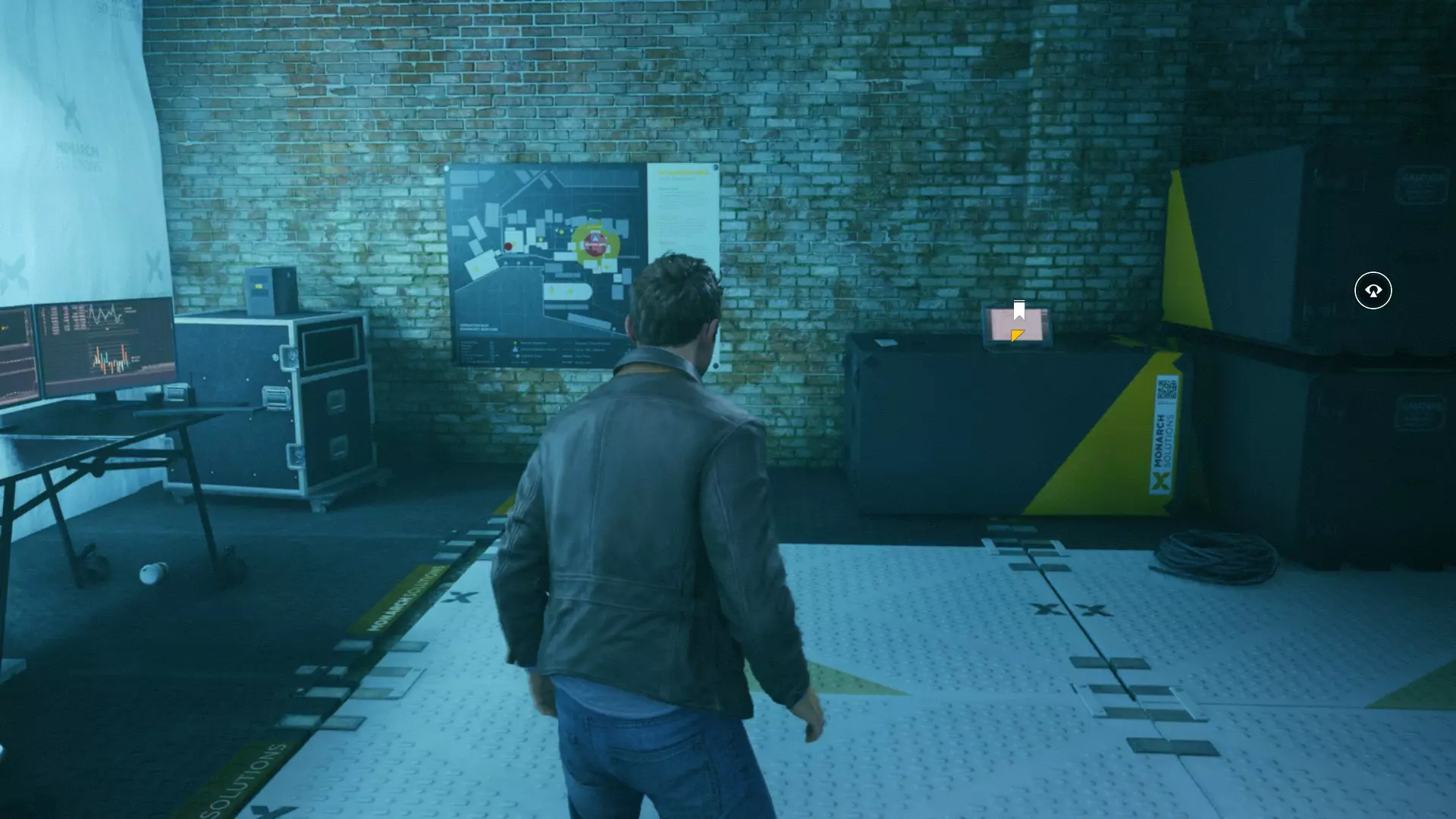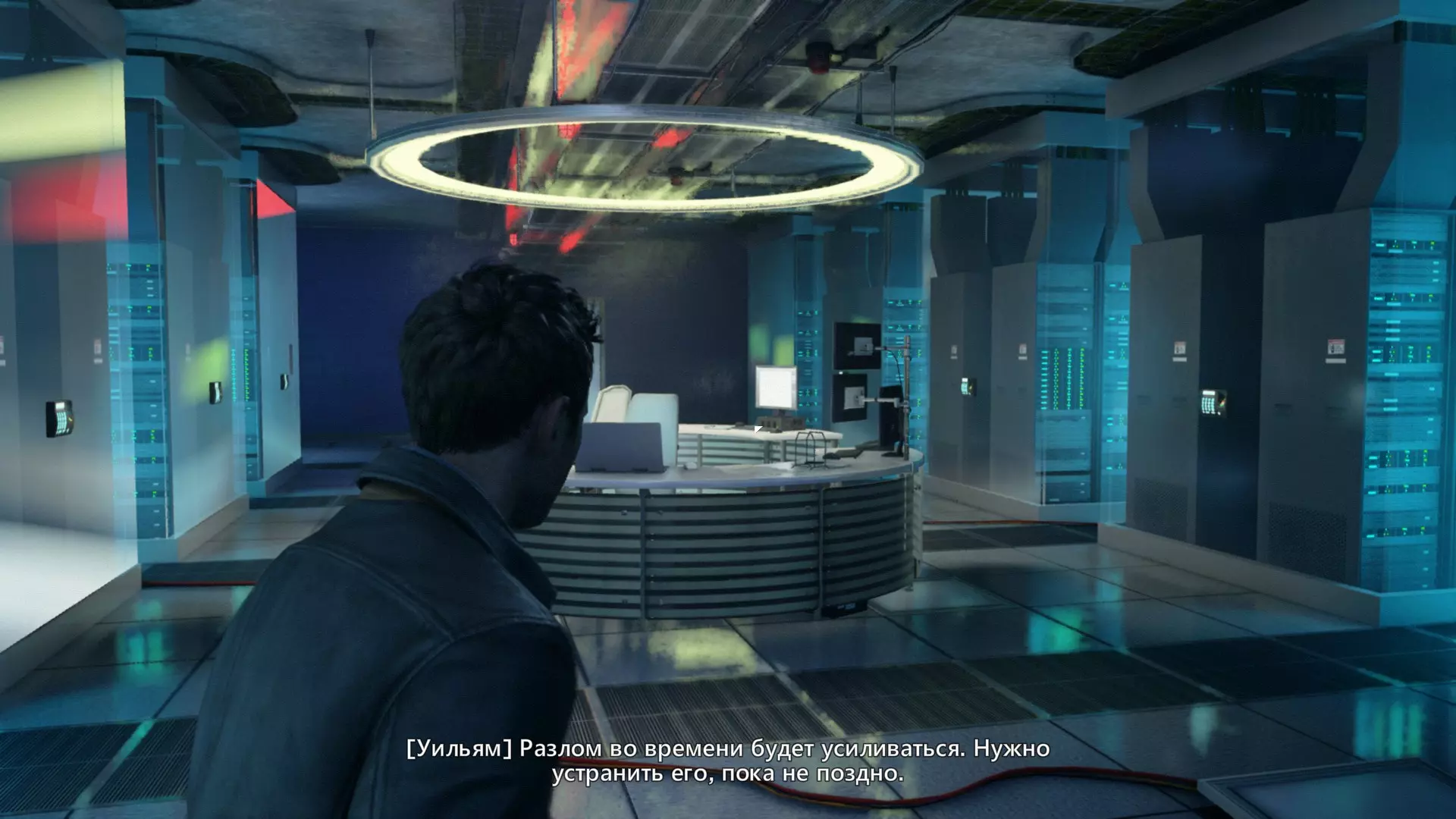 第一幕,第二部分 逃离校园。 1. 当你从服务器机房的隔间出来后,正常进入服务器机房,然后走到中间的电脑旁。