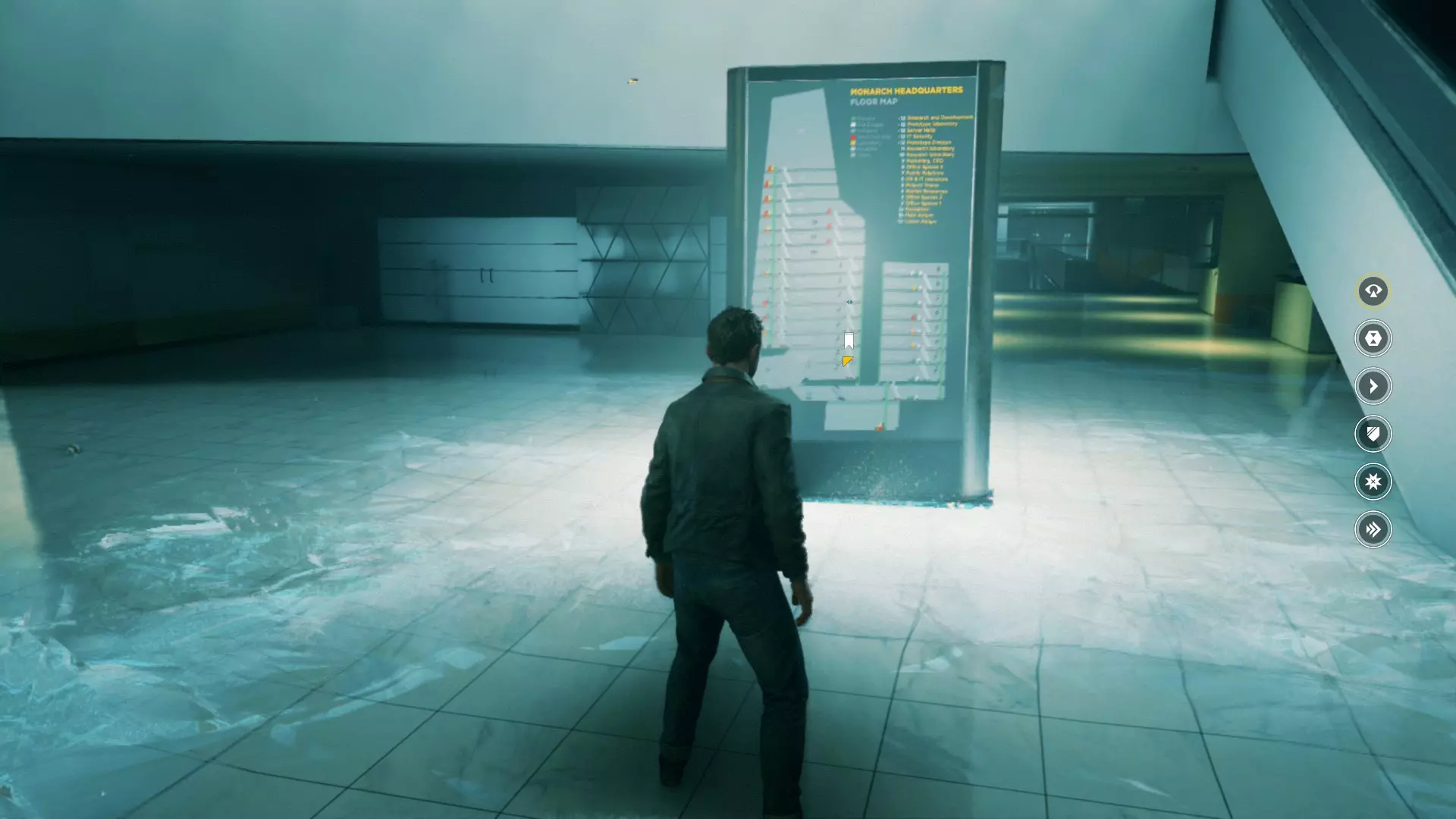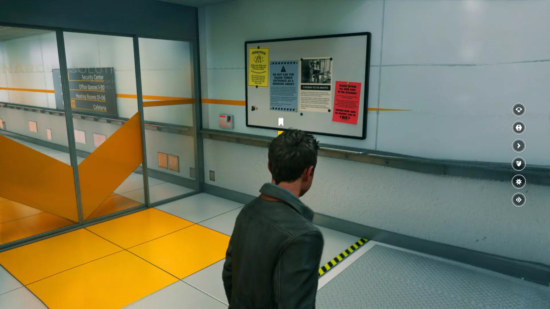 10. 当电梯内的时间静止时,打开电梯门并向下跳。保安身后就是建筑平面图。 11. 穿过故障门后,一直往前走。转弯后向右走,直到到达一个小型实验室。左侧海报旁边有物品来源。