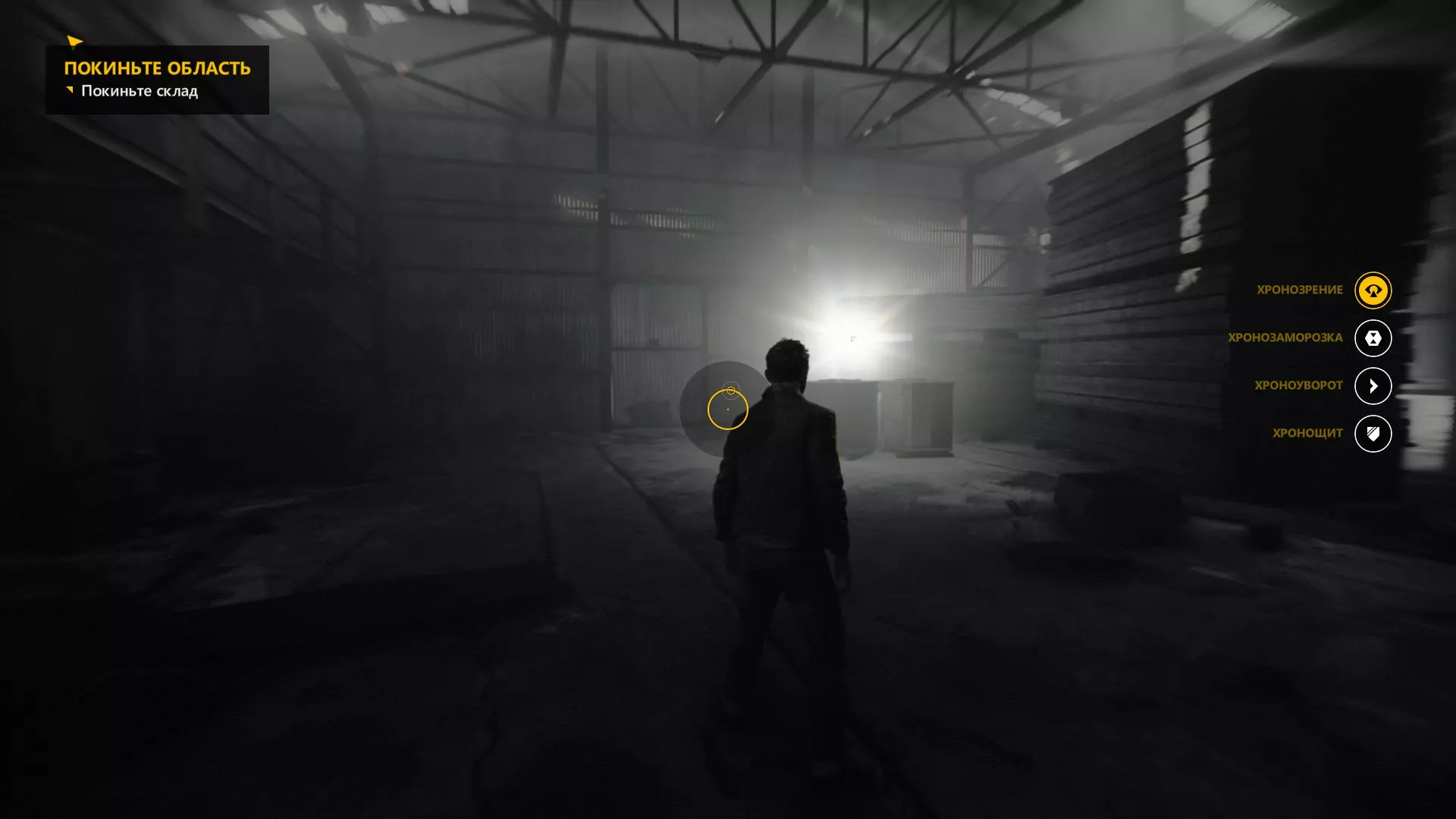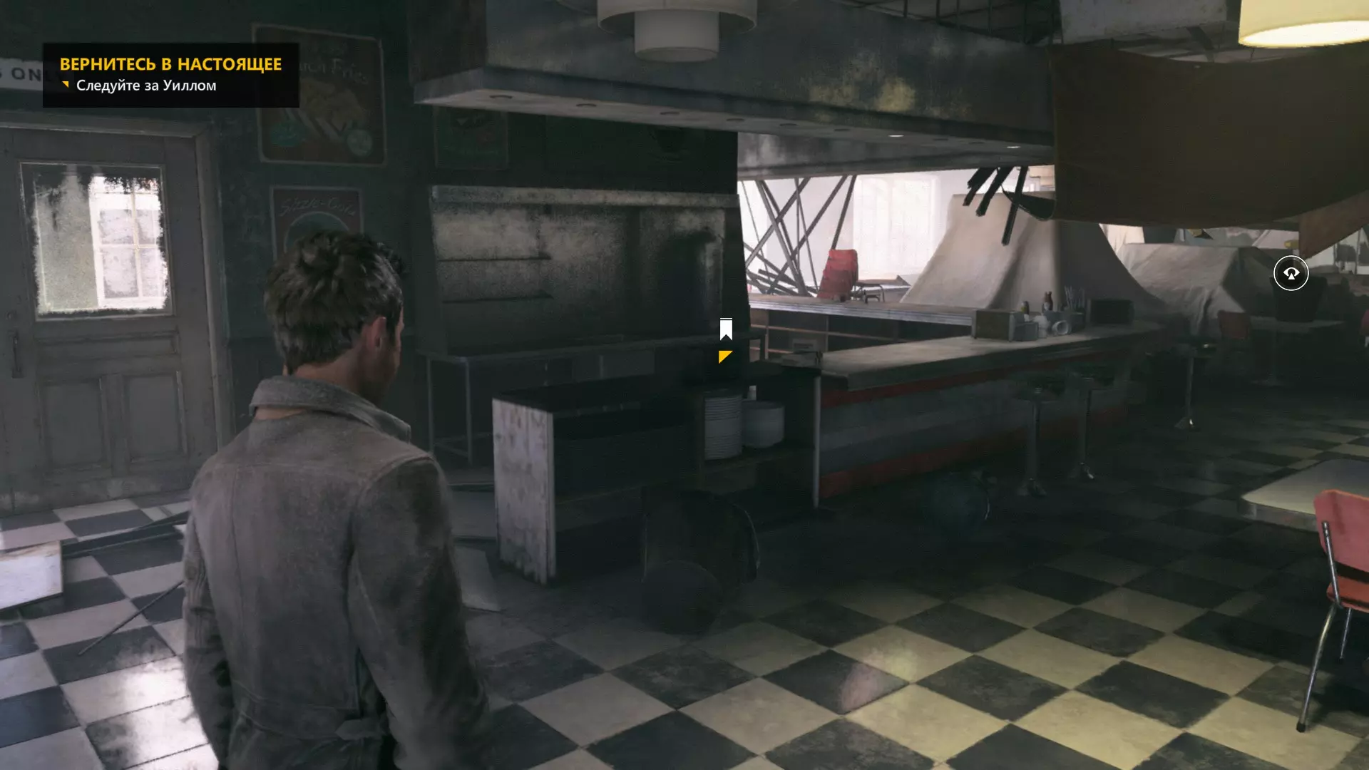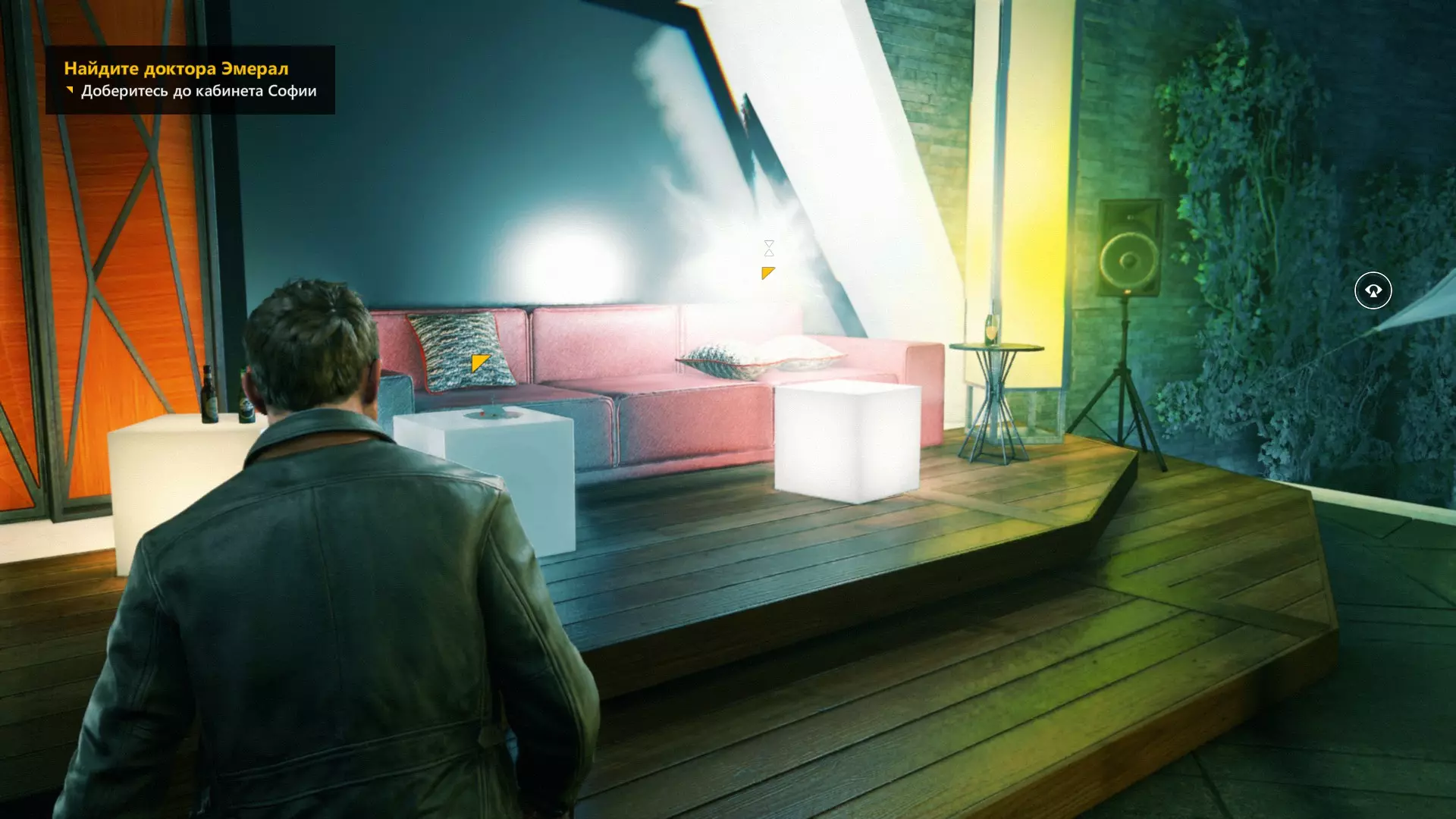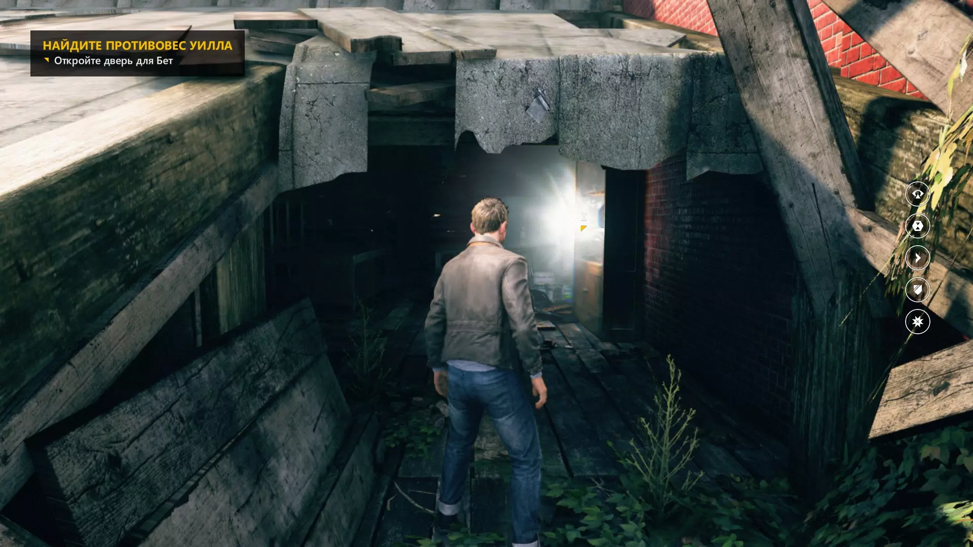 通过右侧建筑坍塌的屋顶进入阁楼后,立即开启时间视觉。