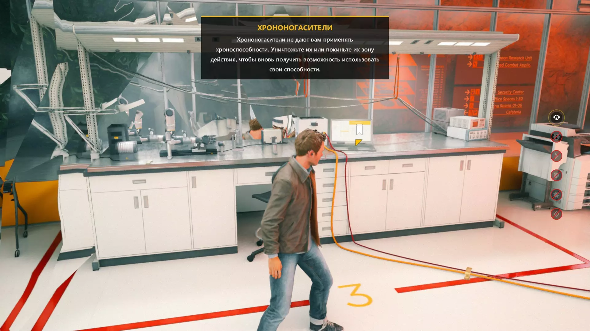 14. 会禁用能力的装置本身。 15. 大厅里的成就墙,那里有两个穿橙色制服的敌人。