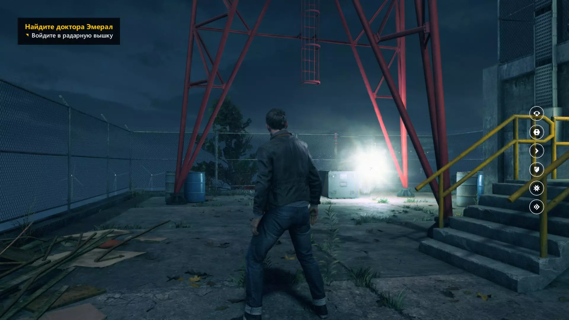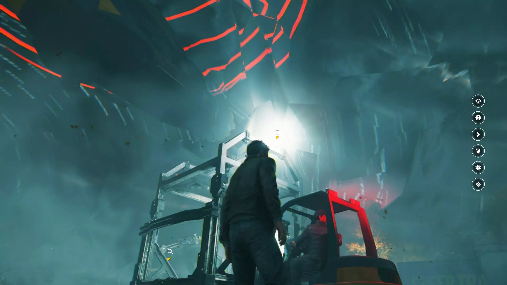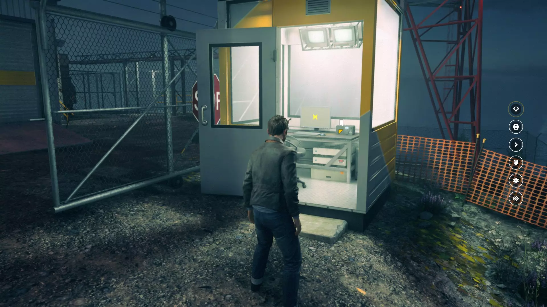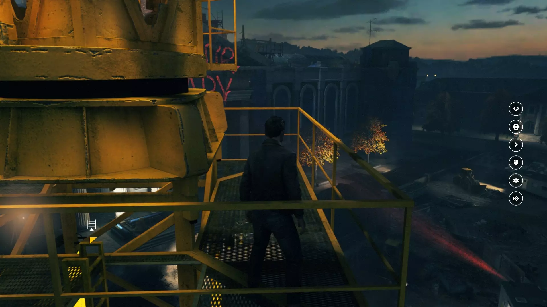 2. 在车库交火并时间暂停后,走出车库来到院子,会看到起重机上方的信源。