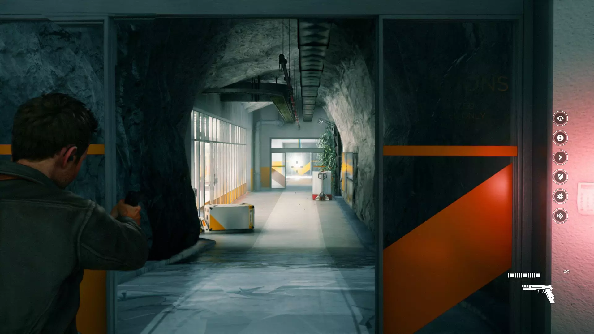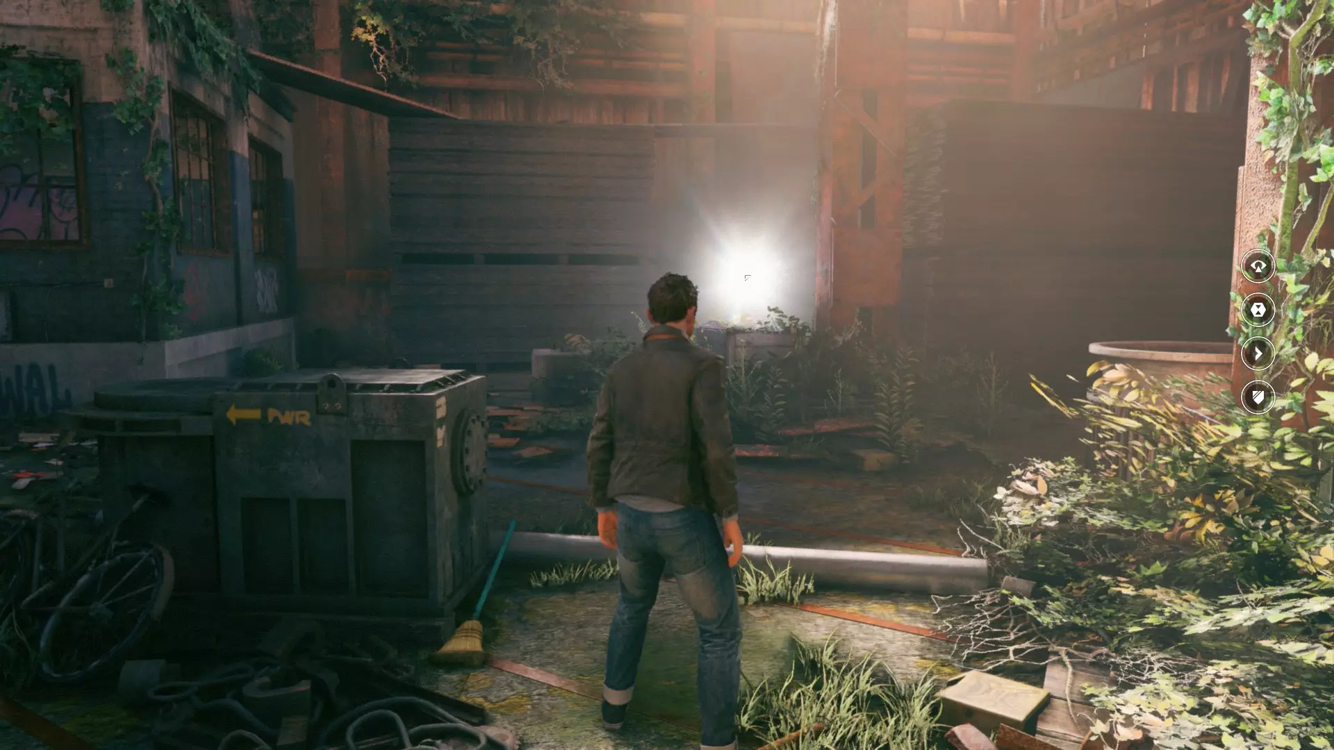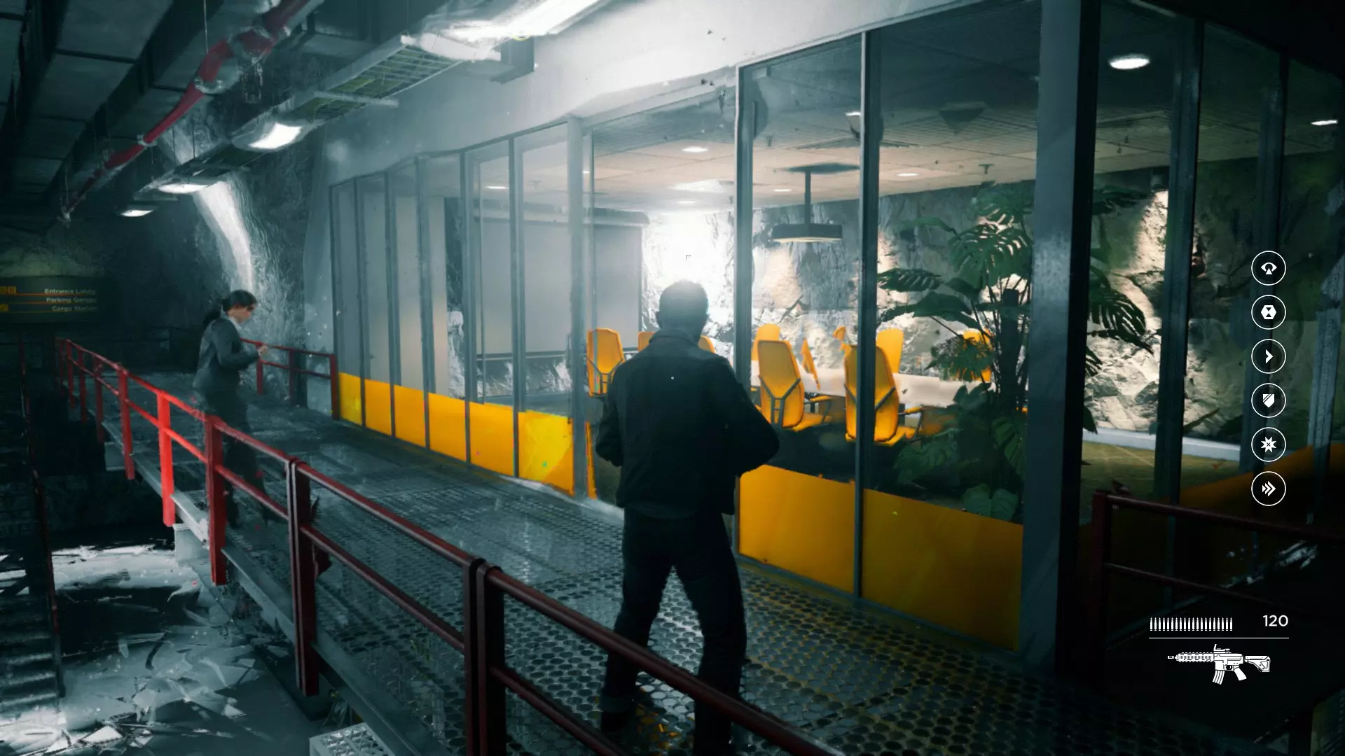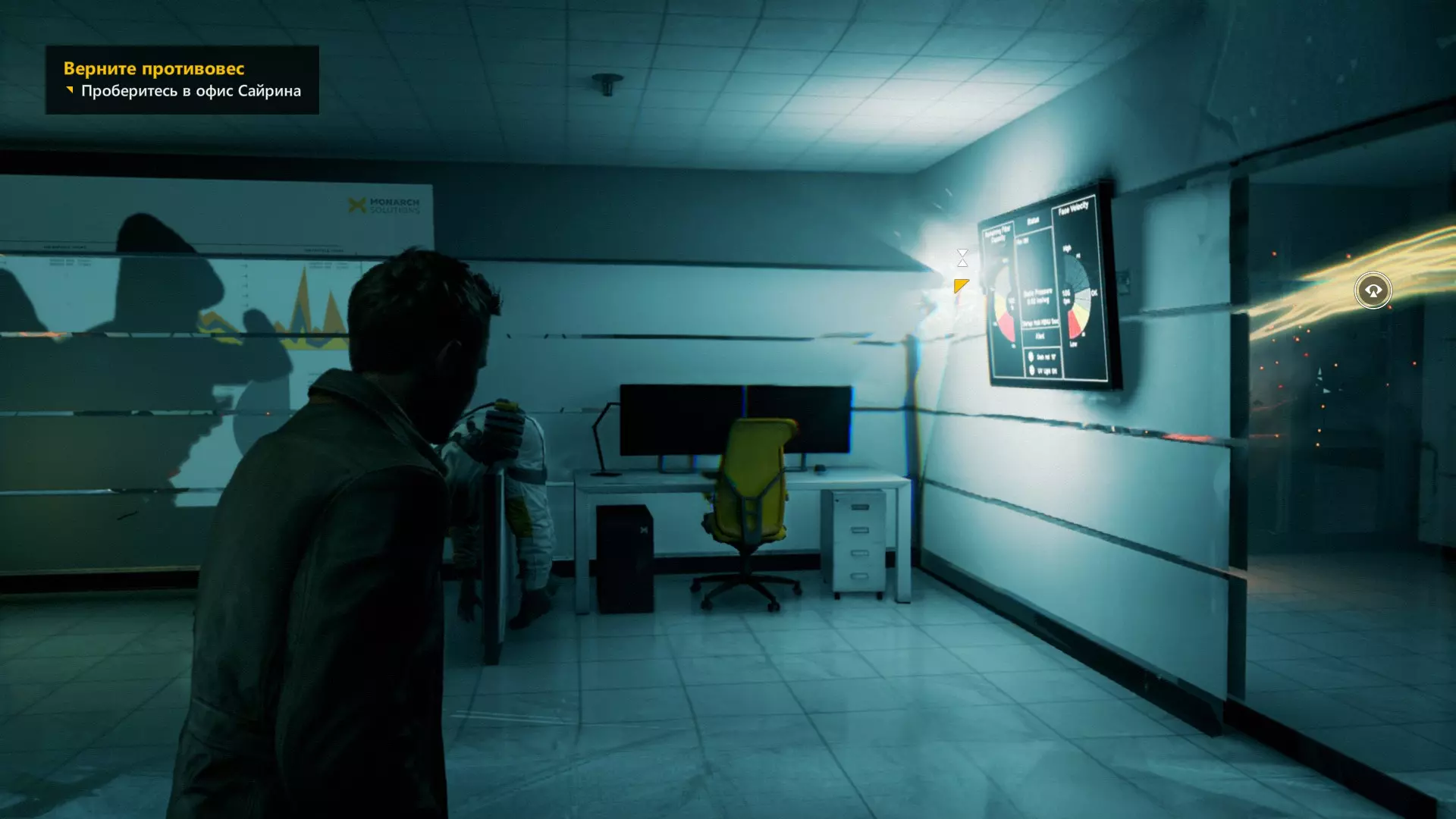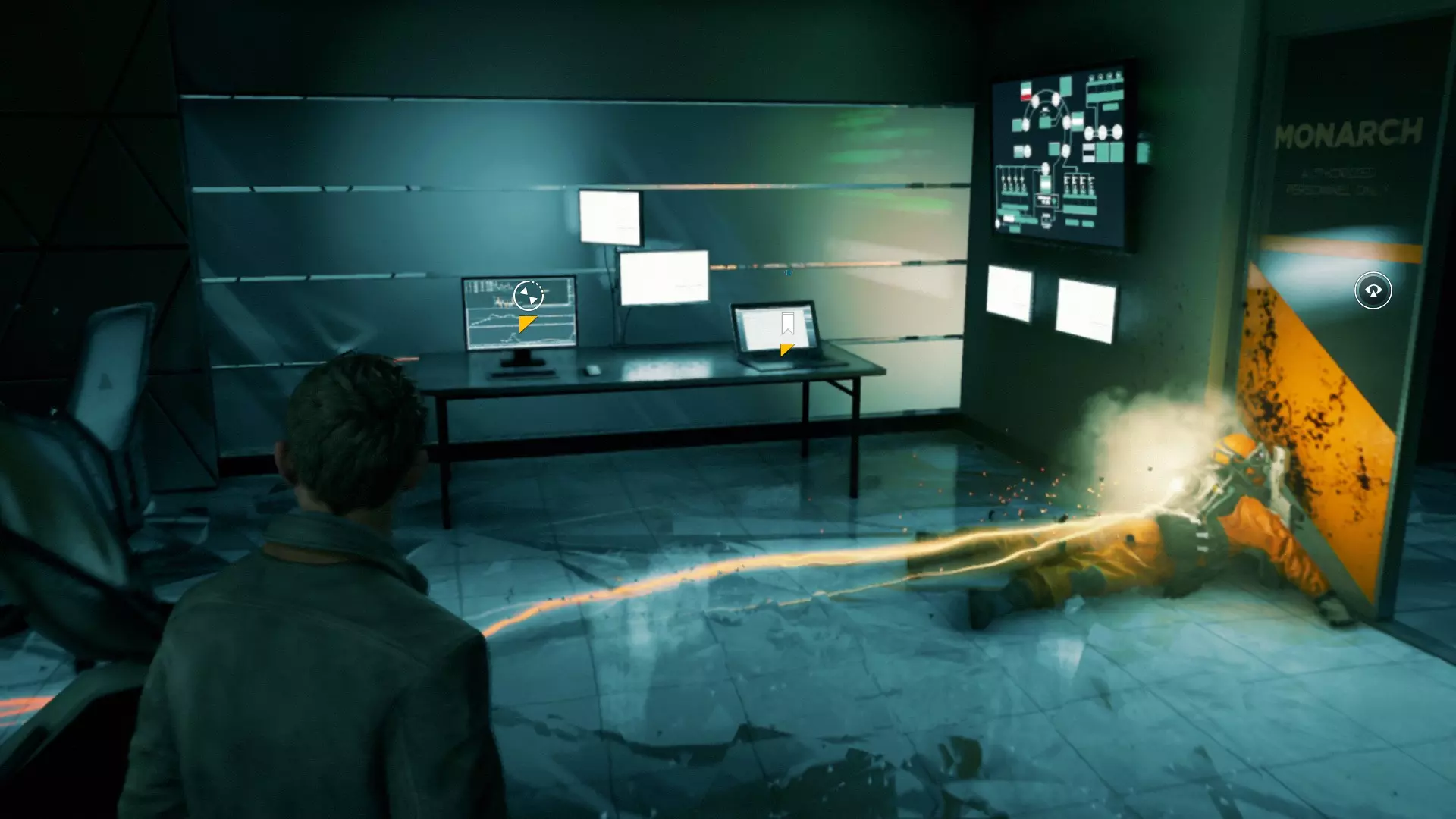 2. 用夸张的方式持枪清理出一条通路,向前推进,直到带有橙色PWR标识的机器部件处。再次开启时间视觉,看到另一个发光点。