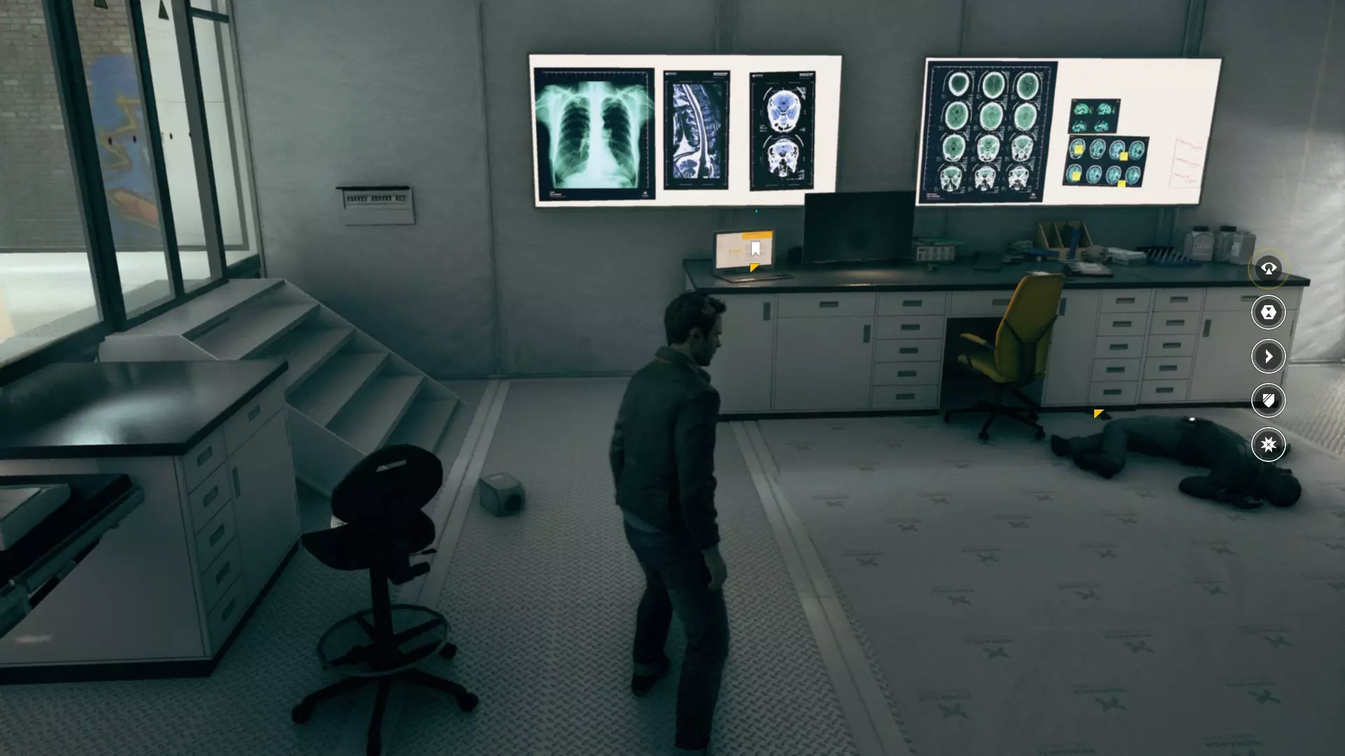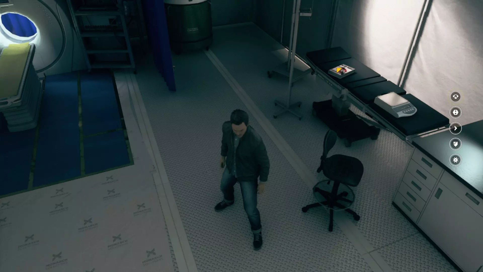 14. 成功完成实验室里的枪战之后,看向病床。那本【艾伦·韦克】的书就是我们要找的东西。