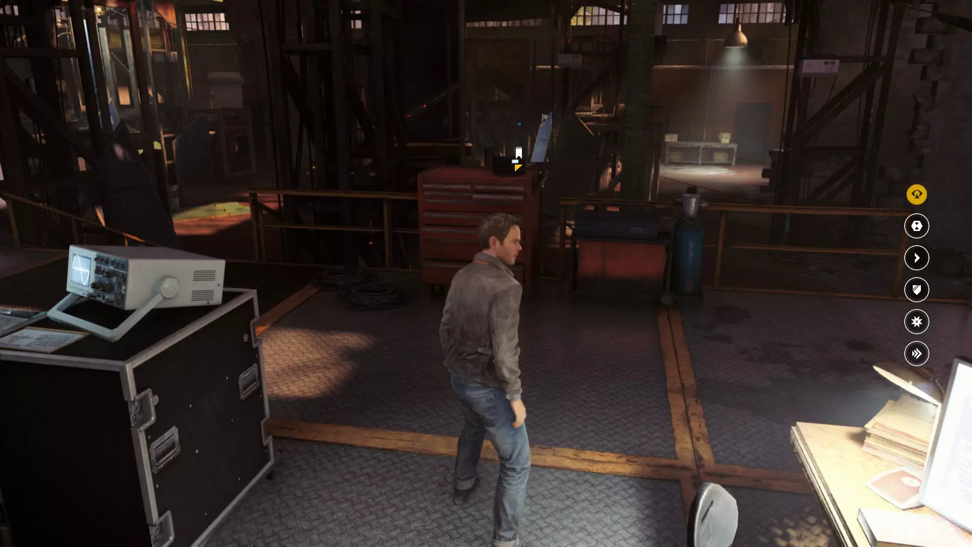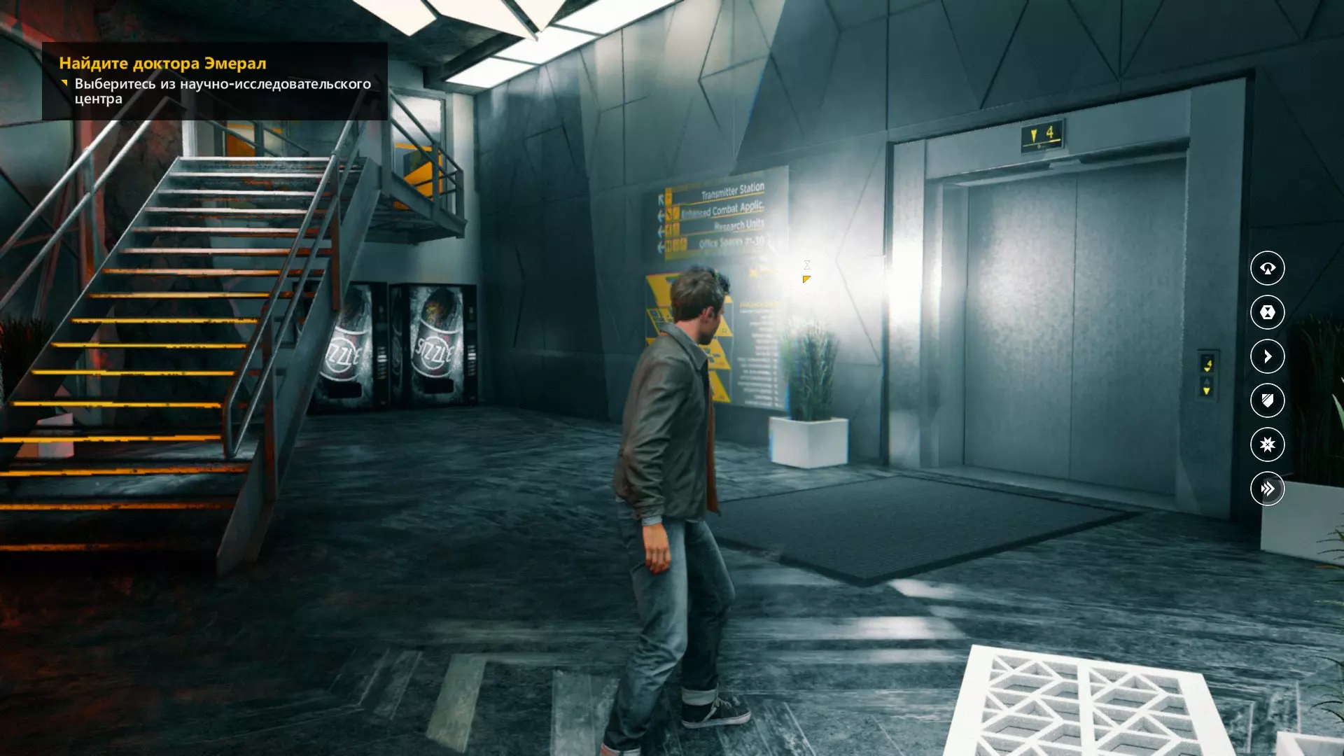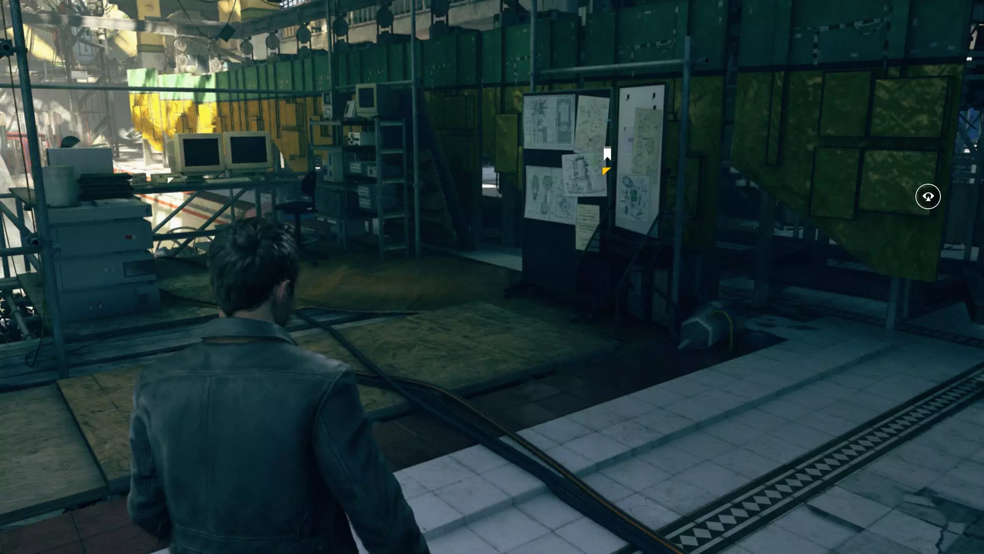 3. 我们利用电梯的一个有趣变体,登上了机库的二楼,看到楼梯后立刻从楼梯下去。开启感知能力,和往常一样,这是对细心观察的奖励。