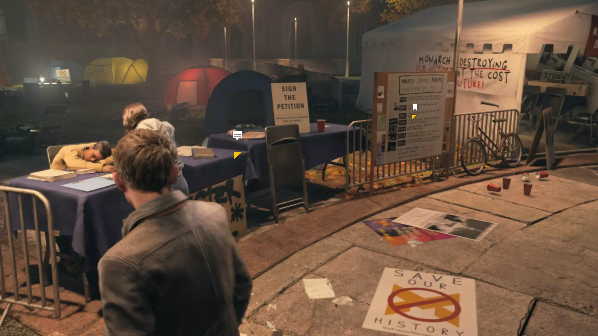 再往前走一点,我们看到一个女孩正在翻箱子,还有一个男孩趴在桌子上睡觉。走近一些,能看到他们身后又有一块抗议的【该死】标语牌。