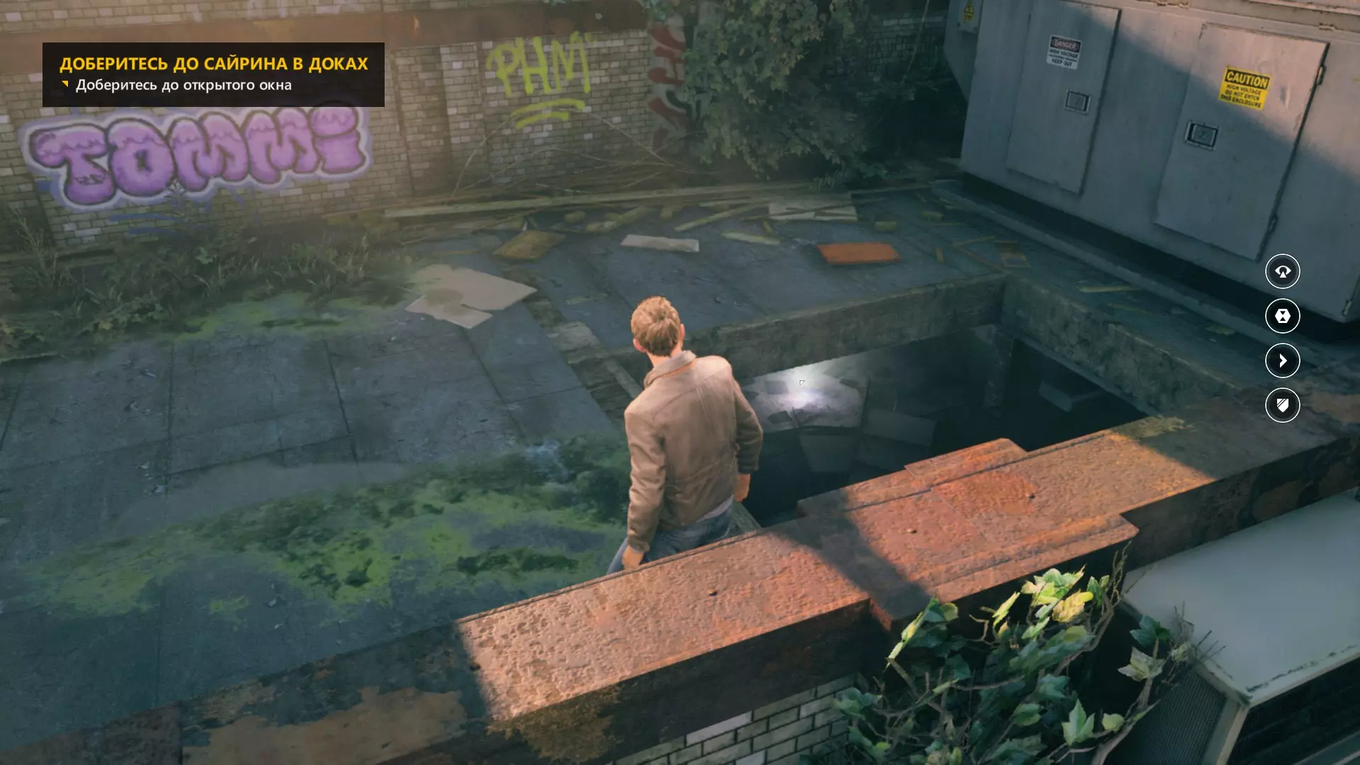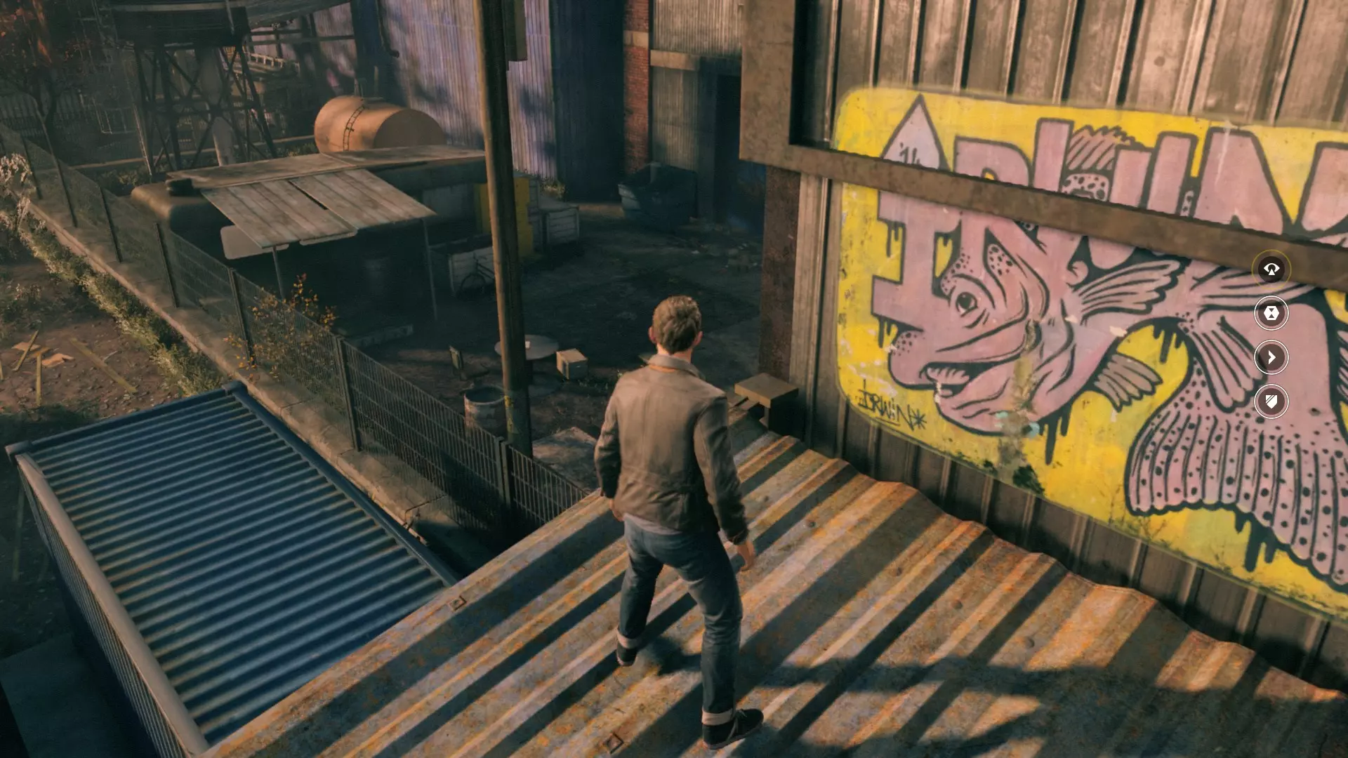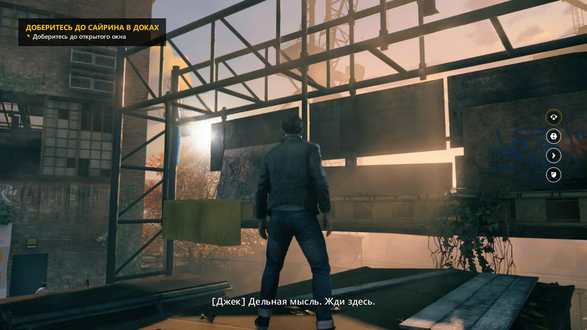15. 经过一场小规模枪战之后,离开机库,前往带有黄色标识的垃圾桶。爬上垃圾桶,再登上屋顶,开启视觉模式,搞定。