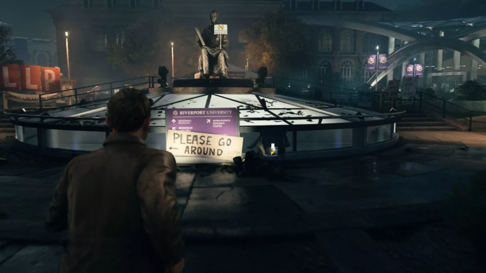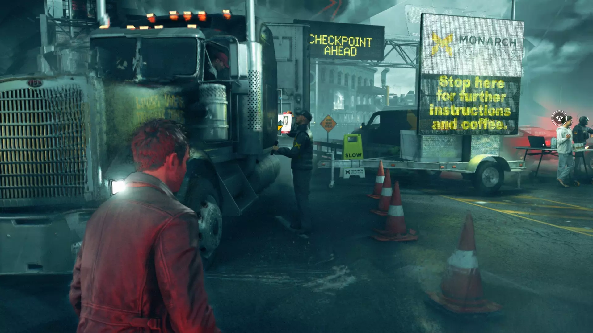 海报后面紧接着是一个大白帐篷。我们走进帐篷,打开电视,里面播放着又一部廉价恐怖片,还有艾伦·韦克的声音。啊,等等,这说的不就是这款游戏嘛。