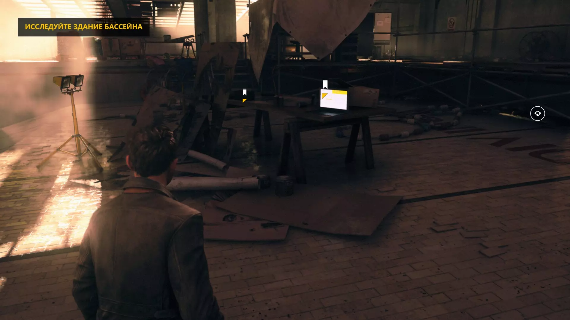 15. 在同一个泳池里,走到桌子后面,开启视觉模式。在电线束处找到我们要找的东西。