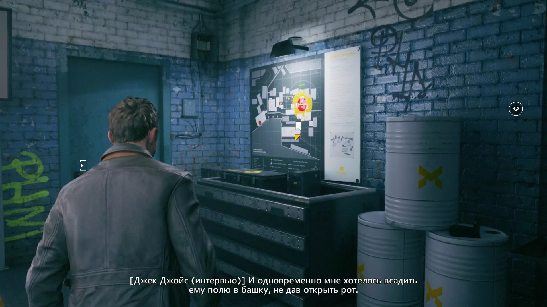 3. 在稍微玩了一会儿坦波夫骑手并跳进一间被毁坏的房间后,穿过蓝色的门,然后看向墙壁。建筑平面图就是我们要找的东西。