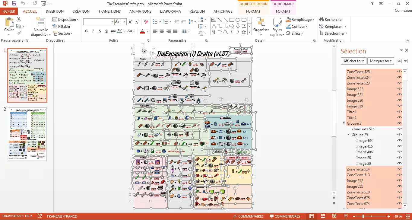 (法语版PowerPoint说明,因我是法国人:ZoneText=文本区域;Image=图片;Groupe=组合;Titre=标题等) 要打印它,最好使用Microsoft PowerPoint或Microsoft Word并按照以下步骤操作: PowerPoint: 1. 创建一个标准纸张尺寸(如21厘米×29.7厘米)的演示文稿 2. 将第一张图片(.jpg格式)复制粘贴到第一张幻灯片,然后将第二张图片(.jpg格式)复制粘贴到第二张幻灯片 3. 调整图片大小以适应整个幻灯片 4. 将其保存为.ppt或.pptx格式 5. 将其导出为.pdf格式(更适合打印) 6. 打印并使用! Word: 1. 创建一个标准文档 2. 将第一张图片(.jpg格式)复制粘贴到第一页,然后将第二张图片(.jpg格式)复制粘贴到第二页3) 将两张图片的尺寸都调整为100%(实际大小) 4) 在图片编辑中:选择“浮于文字上方”或“衬于文字下方”(此选项可让你将图片移至任意位置) 5) 调整(每页一张图片,全尺寸) 6) 保存文档,然后导出为PDF格式(更适合打印) 7) 打印出来,尽情使用吧! 如果我能直接上传PDF版本会更方便,那样你只需打印即可,但出于安全考虑,Steam只允许上传图片。 指南结束 好了,我们的指南到这里就结束了。希望这能帮助一些对各种合成列表感到困惑的新玩家,那些列表看起来确实很糟糕(到处都是表格,还没有可打印的版本)。 这些内容(两页)是我花了好几天时间整理的(大概两天用来整理所有合成列表,包括截图、去除背景等;然后一天检查所有智力条件;还有一天收集工具信息,比如挖掘百分比等,因为我之前制作东西时没记录这些,所以不得不重新弄一遍……)。 所有这些工作都是我一个人完成的(MaxM Adavayn Antael),一个法国玩家。本来是给自己用的,但有人建议我分享出来。 祝大家玩得开心,度过愉快的一天! 附:如果指南里有英语错误,欢迎大家批评指正!谢谢 :) 指南图片来源于网站“Flaticon”。