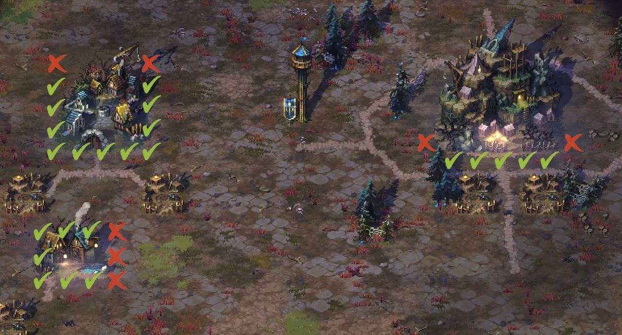 目标是尽可能高效地按指定顺序收集特定物品。用于收集的堆叠仅为演示目的,不考虑具体的组合。请注意,手动移动相比游戏预设的移动方式,能让法师多移动一到两个点。规划包含多个转弯的路线时,要记住你的法师在本回合结束时的位置。游戏通常不会优化你的“最后一步”,会让你把最后一个行动点用在直线移动上,而在回合末尾进行斜向移动的代价更高。本回合的斜向移动往往意味着下一回合的斜向移动会减少一步。如果斜向移动能让玩家在水平或垂直方向上更接近目标,不妨考虑用“最后一步”来进行斜向移动,而非直线移动。当然,这在很大程度上取决于具体情境,因为需要考虑你选择购买的单位以及你的法师前往的方向,但经过仔细考虑,这样做往往能带来不少优势。 “门在哪里?” 地图上的物体存在一个不成文的接近规则。地图上的物体能否与地图区块进行交互(即获取访问权限),首要取决于其尺寸大小,不同尺寸的物体有着不同的规则。其中部分物体的规则极为简单,而另一些则存在各种特殊之处。 尺寸为1x1的地图物体,可从任意相邻位置对其进行访问。它们的表现相当一致,符合预期。不过,虽然大多数2x1尺寸的地图对象可以从任意方向进入,但也有部分对象无法从特定位置进入。在这种情况下,站在物品右侧的位置时无法与物品进行互动,法师必须绕行。例如:墓地/教堂墓地,必须绕行才能进行互动。
