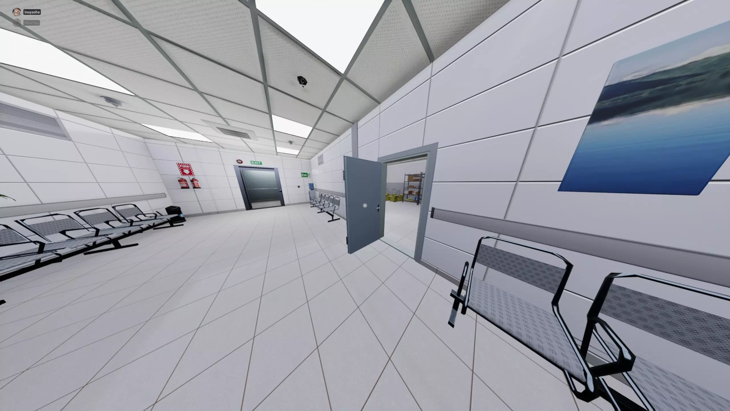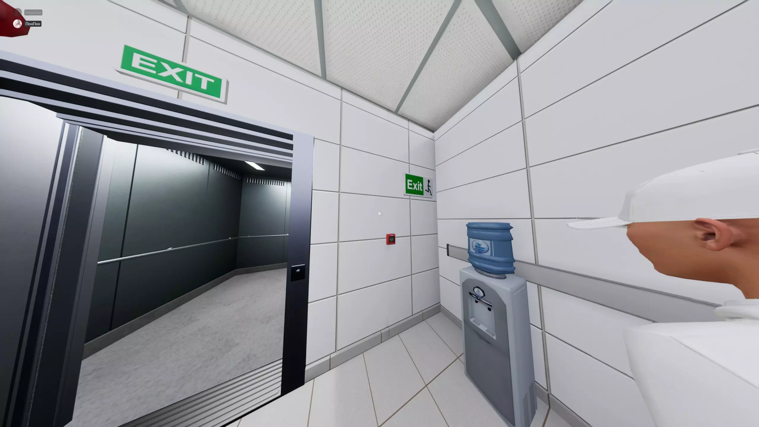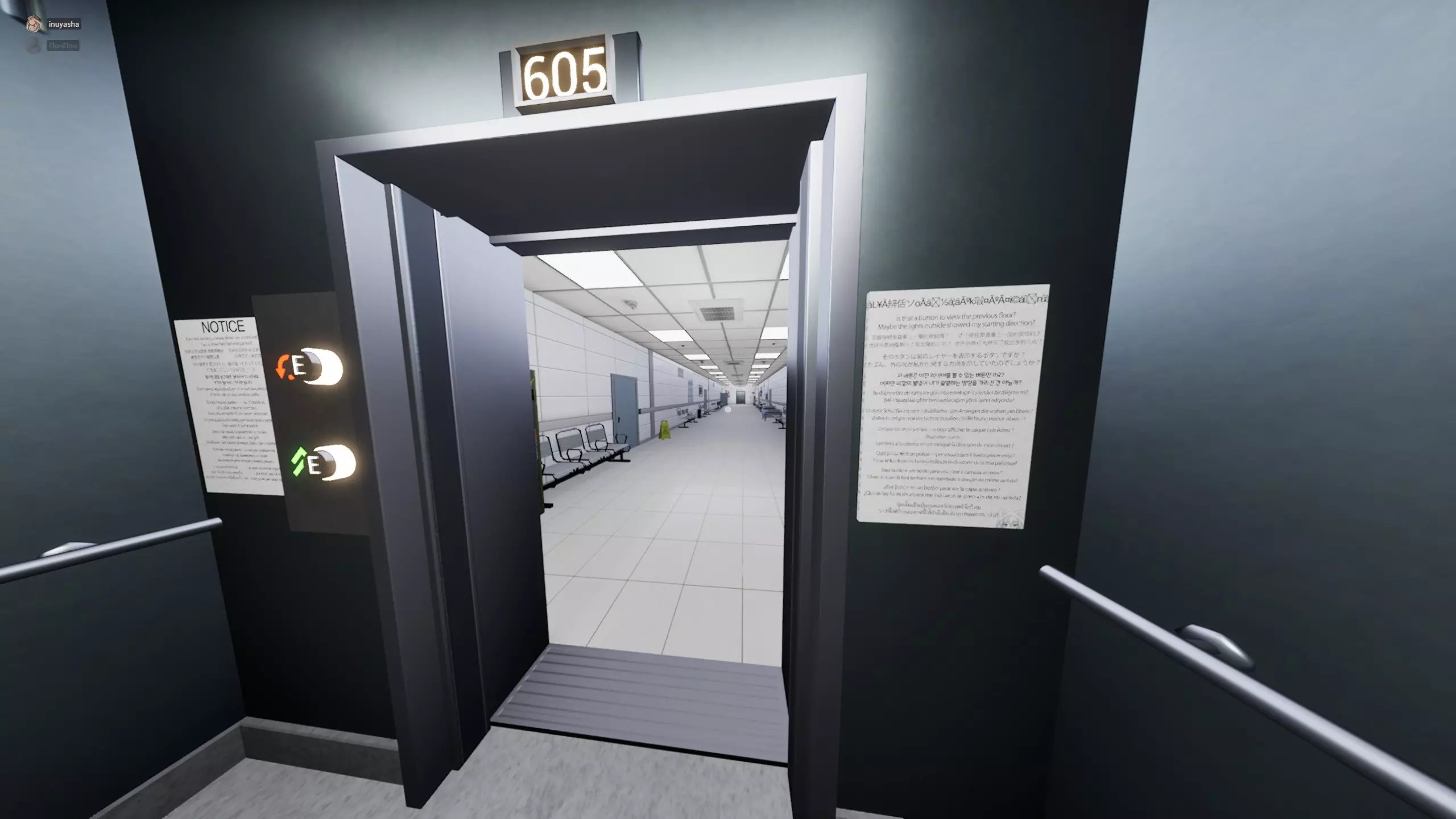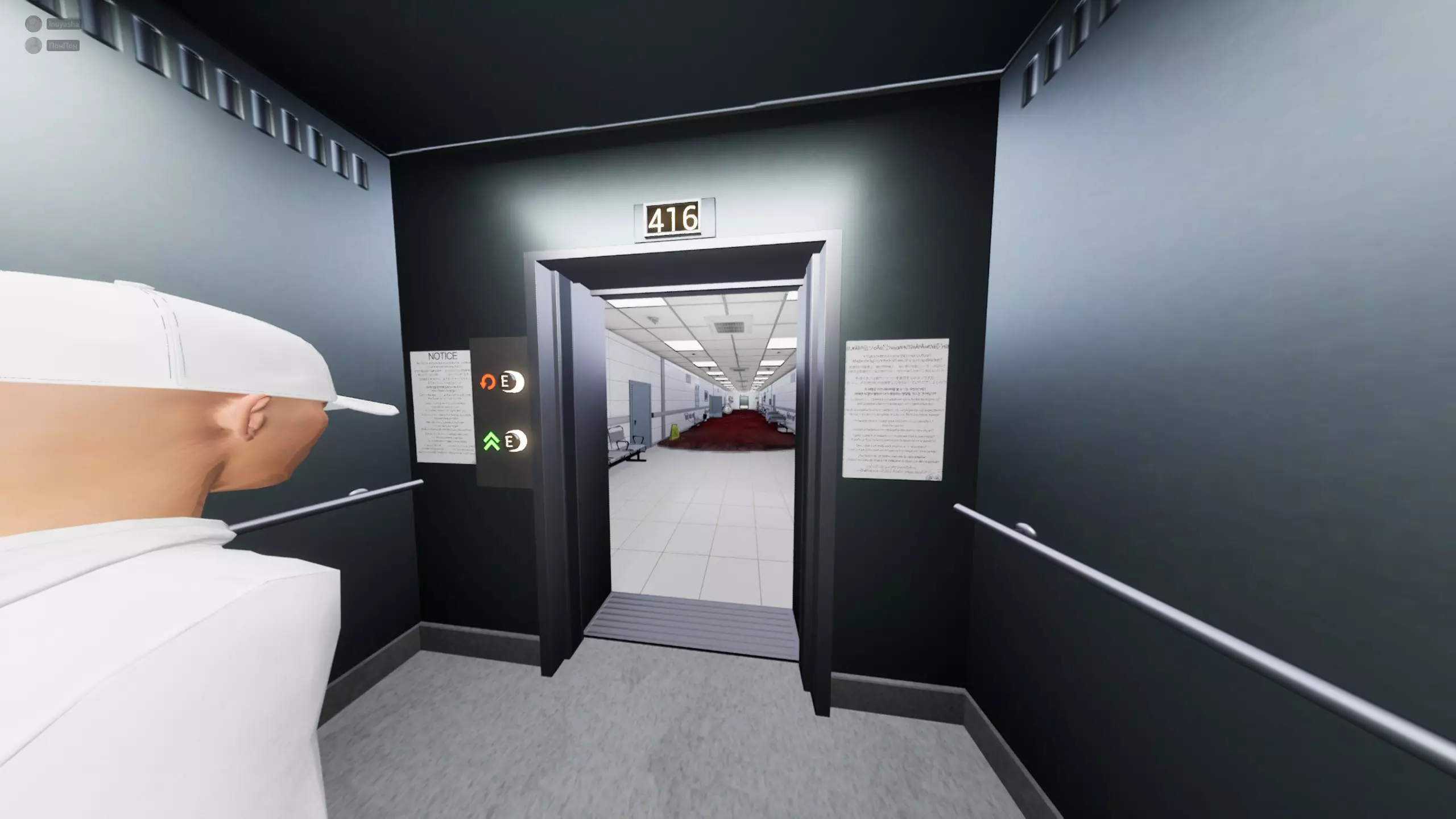 616层(?)进入房间后会被传送到一个新地点(致敬元素),只需四处走动,当看到走廊尽头有两个人时就转身返回,走到电梯处即可。