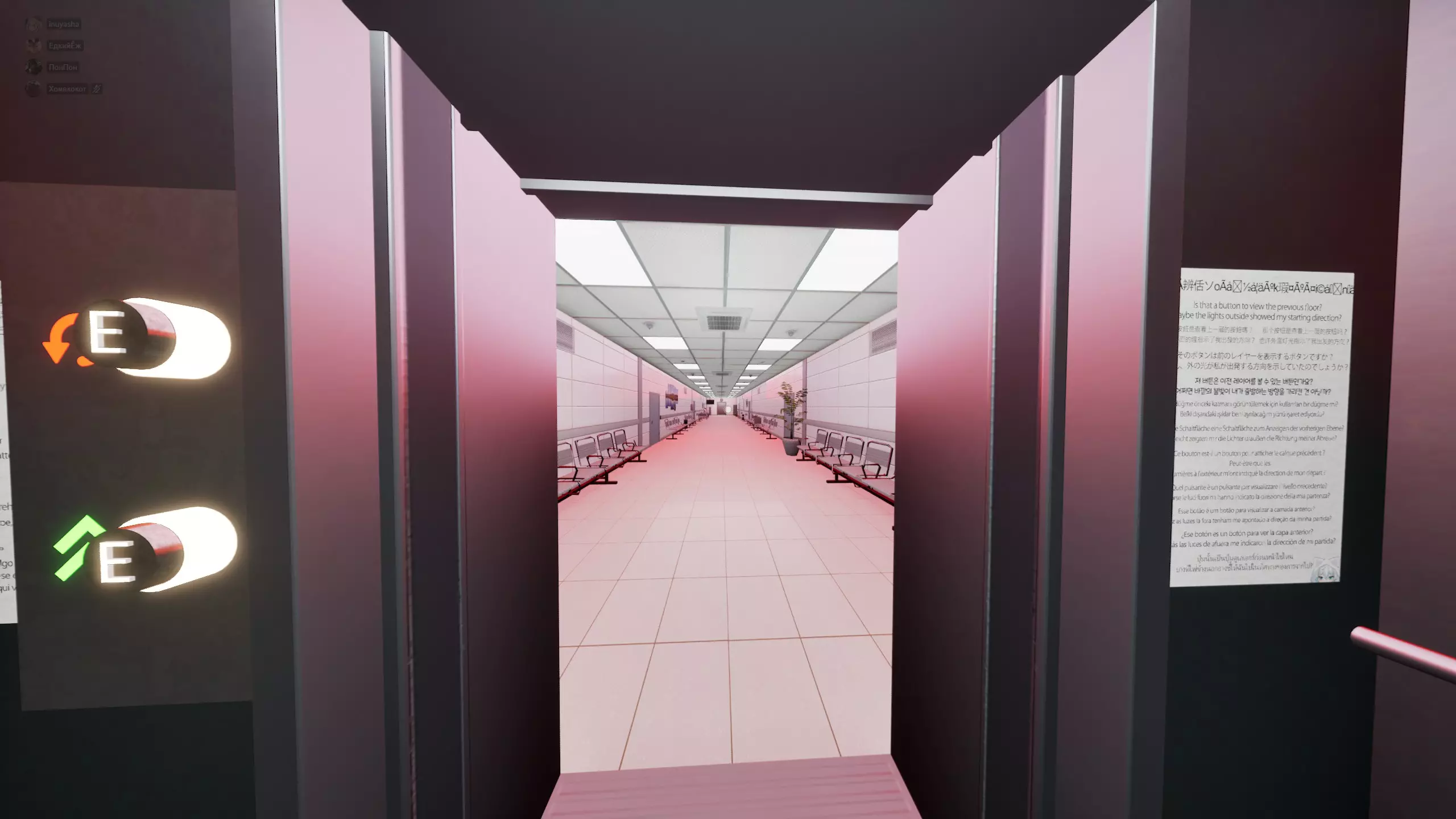 漏洞与技巧 如果在电梯关门时将同伴推出电梯,楼层会出现无头女性并攻击你,即使尝试重启关卡也无法解决,只有重新进入游戏才行。 将视野设置为150,能够穿透电梯门的纹理,提前查看门后可能出现的情况。 在部分关卡中可以卡进物品里。这没什么用,也没必要知道,不过只是个事实,你们还是小心点,不然可能会卡住。你死亡后有可能会直接在楼层重生,而不是在电梯里。走廊里几乎所有事件的触发点都在楼层中间位置。