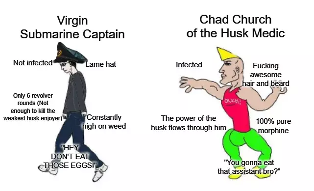 husk教派医疗兵体验 我明白了,你想要更刺激的医疗兵体验。欢迎你,我的同道们,你们已经超越了绷带和吗啡——你们已经见识到了不死者的真正本质。 如果船员们能被动自愈,那何必在他们身上浪费资源呢?所以,今天就把你的医疗室变成你那被感染的神圣殿堂,向你的船员传播启示吧。 behold,真正的chad husk教派医疗兵, 只需遵循chad医疗兵体验的规则,直到你在空间站中找到husk教派的区域,这才是你旅程真正开始的地方。 需要做什么 1. 接受邪教徒给予的任务,即寻找12个husk蛋(velonaceps calyx eggs)。可以通过从其他空间站购买或打捞死去的husk尸体来完成。 2.完成第一个任务后,你将收到加入教派的邀请。之后会接到一个暗杀任务。完成后,会获得一个救援任务。完成救援任务后,全体船员将被授予【壳行者共生体】感染。这本质上是壳行者感染,但有所改进,因为你在拥有所有壳行者被动技能的同时仍然可以说话。 3. 现在你已经是一名绝对强大的壳行者医生了,选择一名你喜欢的助手,开始无缘无故地骚扰他。把他变成你的实验对象,给毫不知情的助手注射随机物质,这再有趣不过了。