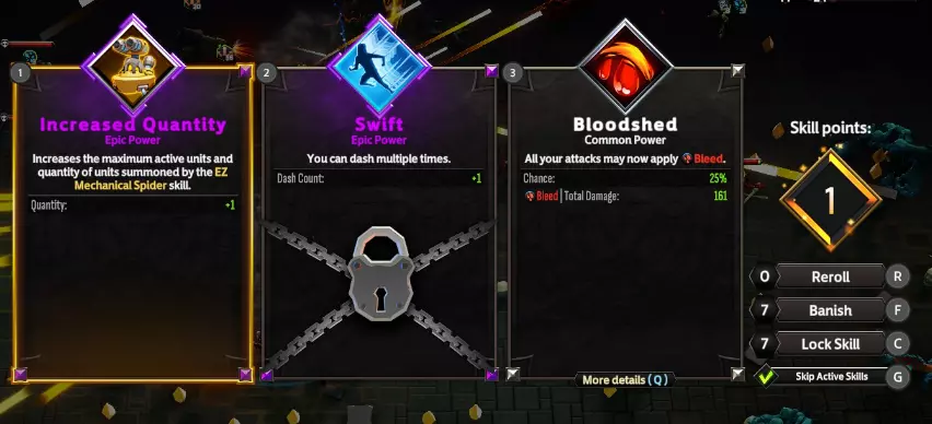 如你所见,我提供的能量导管示例来自一场我将其伤害倍率提升至300%的对局,这使得所有生成的 Boss 都被瞬间消灭。尽可能选择这类通用召唤物是个绝佳主意,尤其是当你的职业威望技能并非最佳或威望等级很低时,它们能让你轻松不少。关于召唤物的最后一点:只要有可能,务必将嗜血与你的召唤技能搭配使用,它们配合得极为出色! 锁定技能示例 接下来,我想讲讲从技能池中选择技能时运用【锁定】技能的重要性。你可以通过升级基础中间符文树来解锁锁定特定技能的能力。然后你可以通过点击【锁定技能】并选择想要锁定的技能来使用此机制。再次升级时,被锁定的技能将作为可选技能出现。详见下方示例:
