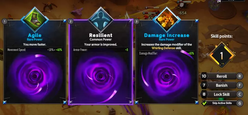 放逐技能示例及列表 除锁定技能外,你还可以选择放逐技能,这会在后续游戏中出现技能选择时将其从选项中移除。放逐功能同样通过中央基础技能树解锁。以下是选择放逐时的示例: