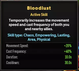 速度类技能可能会显示为上述的几种名称。当选择能强化【嗜血】这类增益效果的速度技能时,我建议将总施法速度提升至40%-50%左右,然后再专注于其他技能。对于其他技能的施法频率,我没有固定的限制,但尽量在主动技能之间平均分配——所以如果你刚为某个技能选择了提升,那么在需要时可以刷新以寻找另一个技能的强化。 职业威望技能: