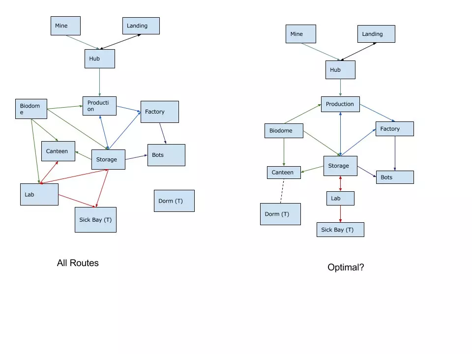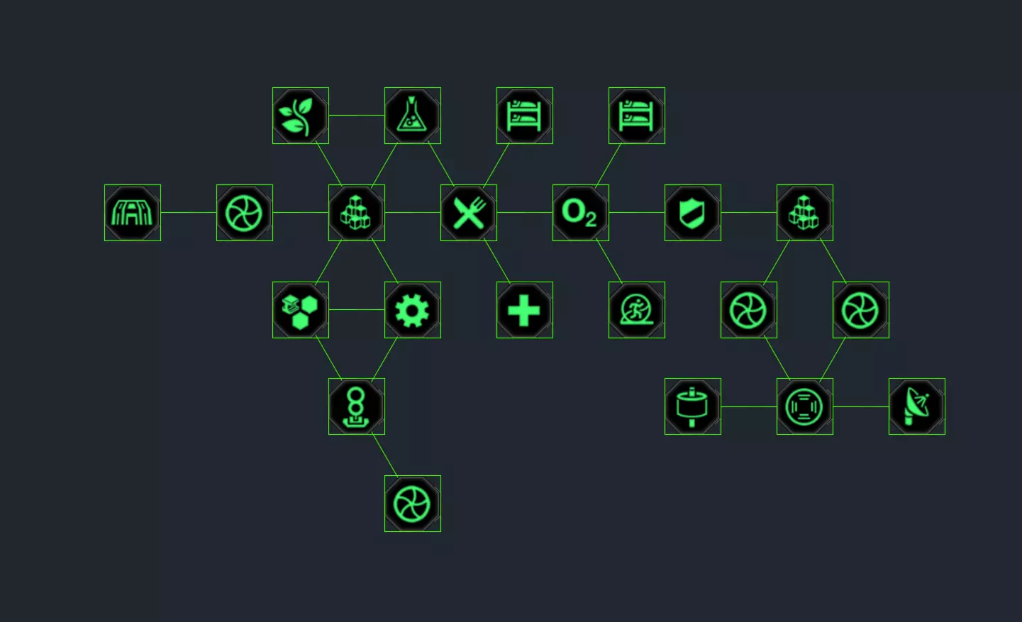 - 作者:Moanguspickard - 讨论: 描述:"我的基地规划构想,若空间允许" 构想是将食堂及其他公共设施安置在中心位置,其余建筑环绕其周围。 并且每位殖民者都拥有独立的宿舍,因此理想情况下,殖民者只需经过3到4栋建筑,即可满足生活与工作需求。将存储库建在着陆平台附近,这样飞船可以更快完成装载。 矿场的位置可根据地形地图随意安排。 这种布局在空间充足的情况下适用。 你可以围绕多个着陆平台和太空港设置多个入口,确保任何不速之客和入侵者都必须经过控制中心。另一个陨石撞击控制中心和无线电装置可以放置在任意位置。 此布局设计可容纳约100人居住(在建筑规模最大的情况下),因此在扩展殖民地时,你需要再次按此布局进行建设。 5) 社区中的基地结构