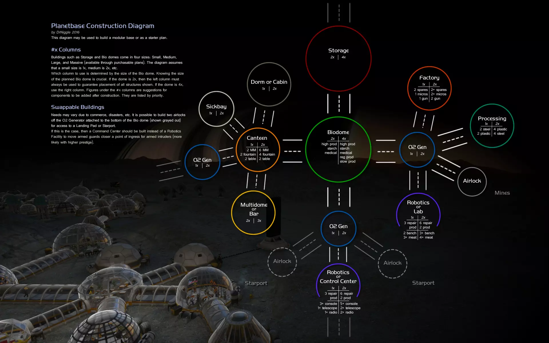 列出了《星球基地》游戏的各种图表和示意图。包括建筑构造图、经济示意图、食物方案示意图等。太空体验。如果你喜欢太空游戏,就加入吧!该Steam组拥有最大、最系统的太空游戏及软件列表。太空游戏Steam鉴赏家:Curator "Space Experience"。提供所有太空游戏的评测。大量的列表和分类。 引言 在本主题中,我将列出所有能找到的关于《星球基地》的图表和示意图。 这样方便随时查阅。 如果你还知道其他有助于游戏的图表、示意图或图像,请在评论中告知,它们将被添加到总列表中。 建筑示意图 1) "Planetbase Construction Diagram"