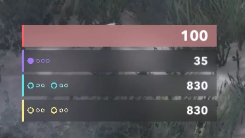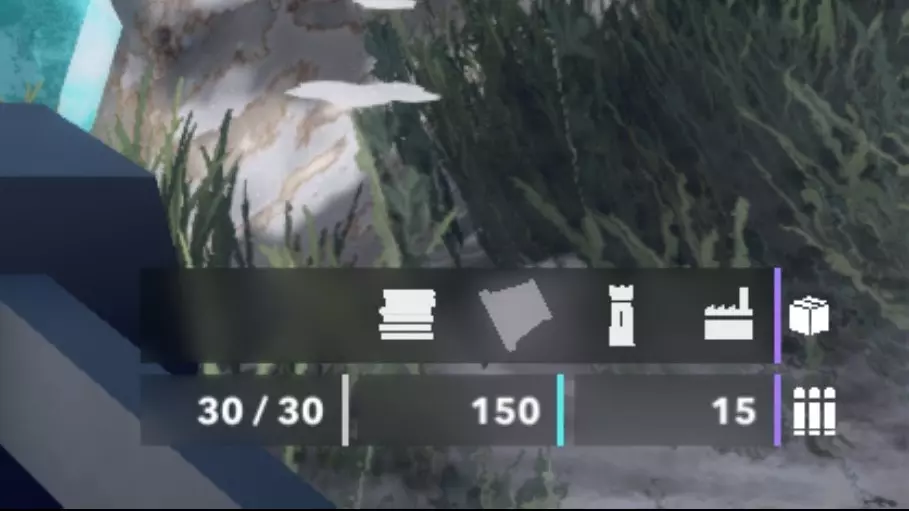 左下角显示的是你的资源数量。顶部的条是你的生命值(使用医疗站可以过量治疗至160)。紫色资源是能量,蓝色是水晶,棕色是木材。你在此处看到的所有资源均为个人资源,不与团队共享。在团队死亡竞赛模式中,攻击敌方团队的发电机可为你的团队获取资源。